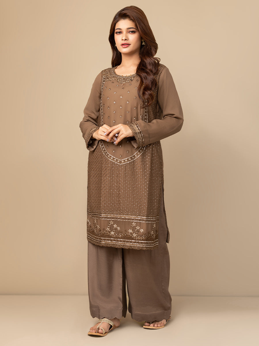 The new era of luxury pret is all about styling made simple, so gone are the days when fashion meant spending a whole day selecting designs and waiting for unique tailoring. Chiffon naturally rages modesty with charm. You can wear it at a traditional family festival or lavish evening gathering. In this season, chiffon came with delicate beadwork, intricate embroidery, and modern silhouettes at our store. We can assure you, our designer dress will speak louder as the versatility is on top. These readymade dresses cater to every woman's style and maintain the luxurious charm of your appearance.