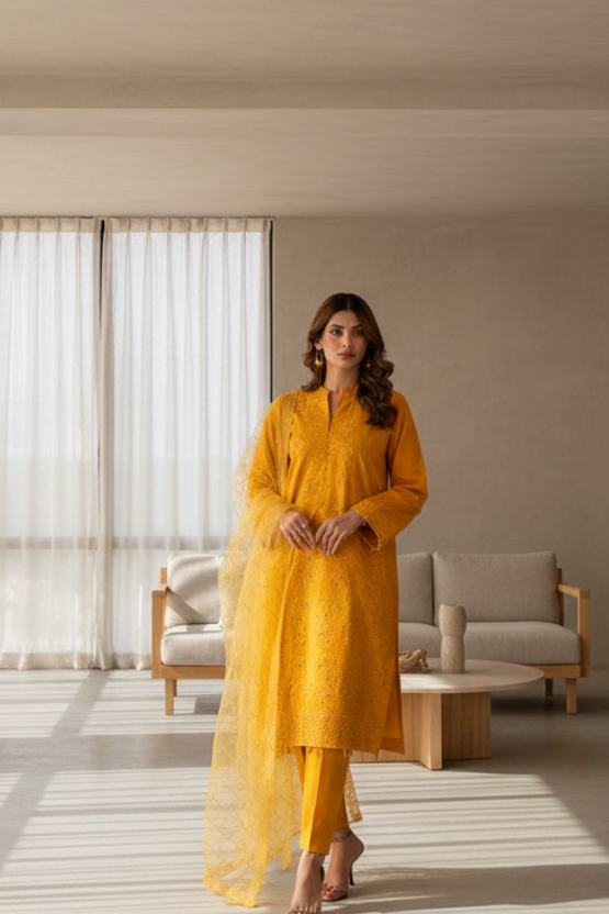 3Pc Unstitched Chikankari Embroidered Lawn Suit (CK034)