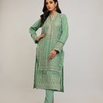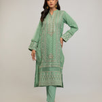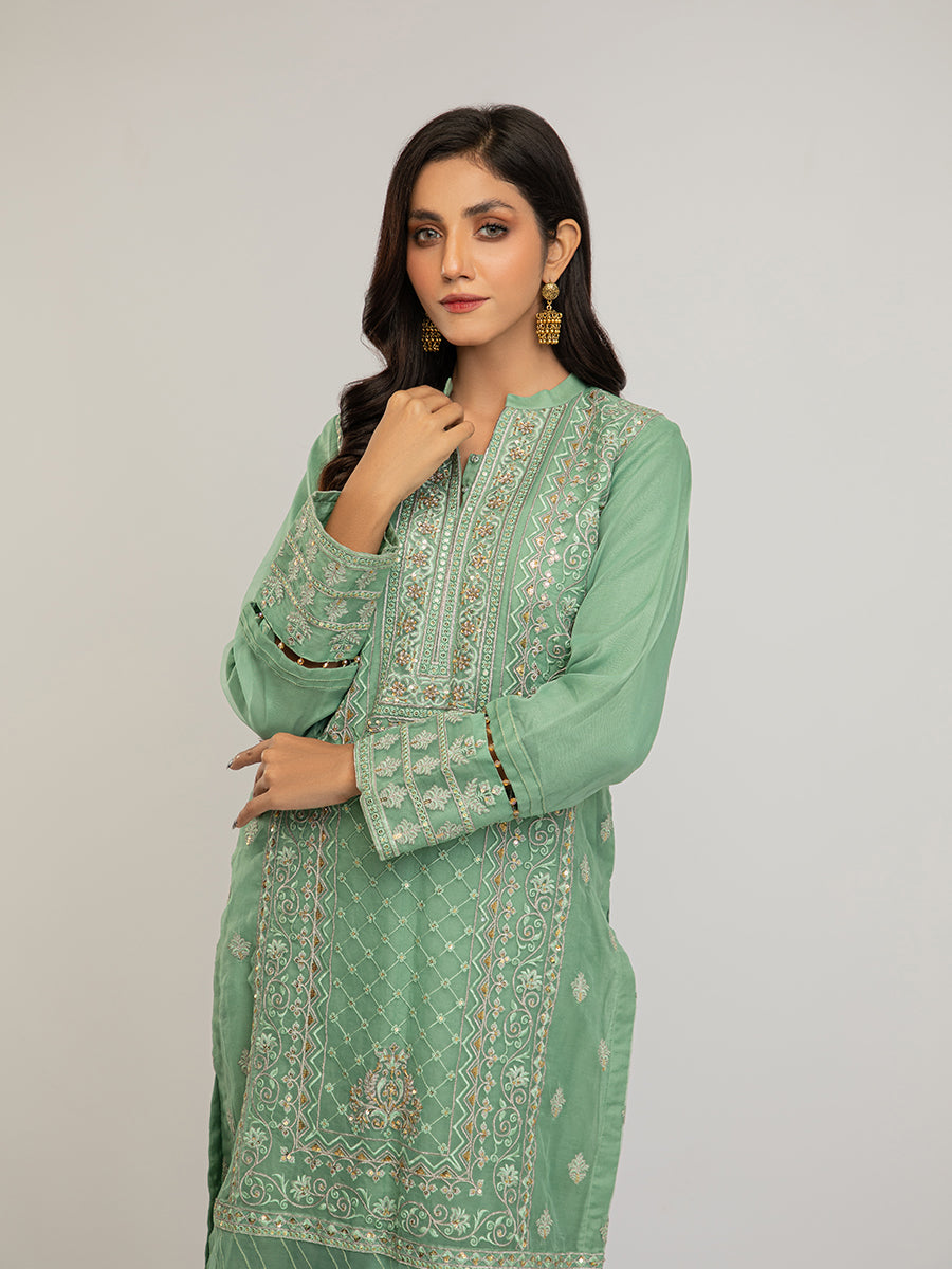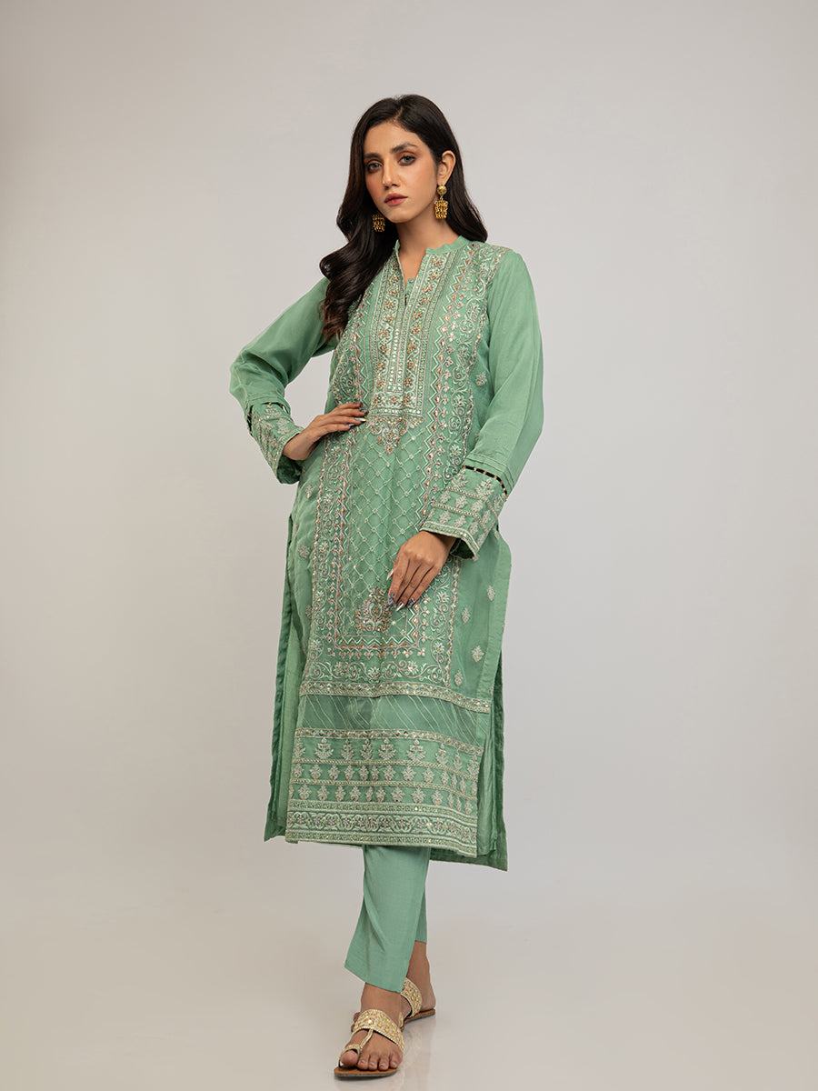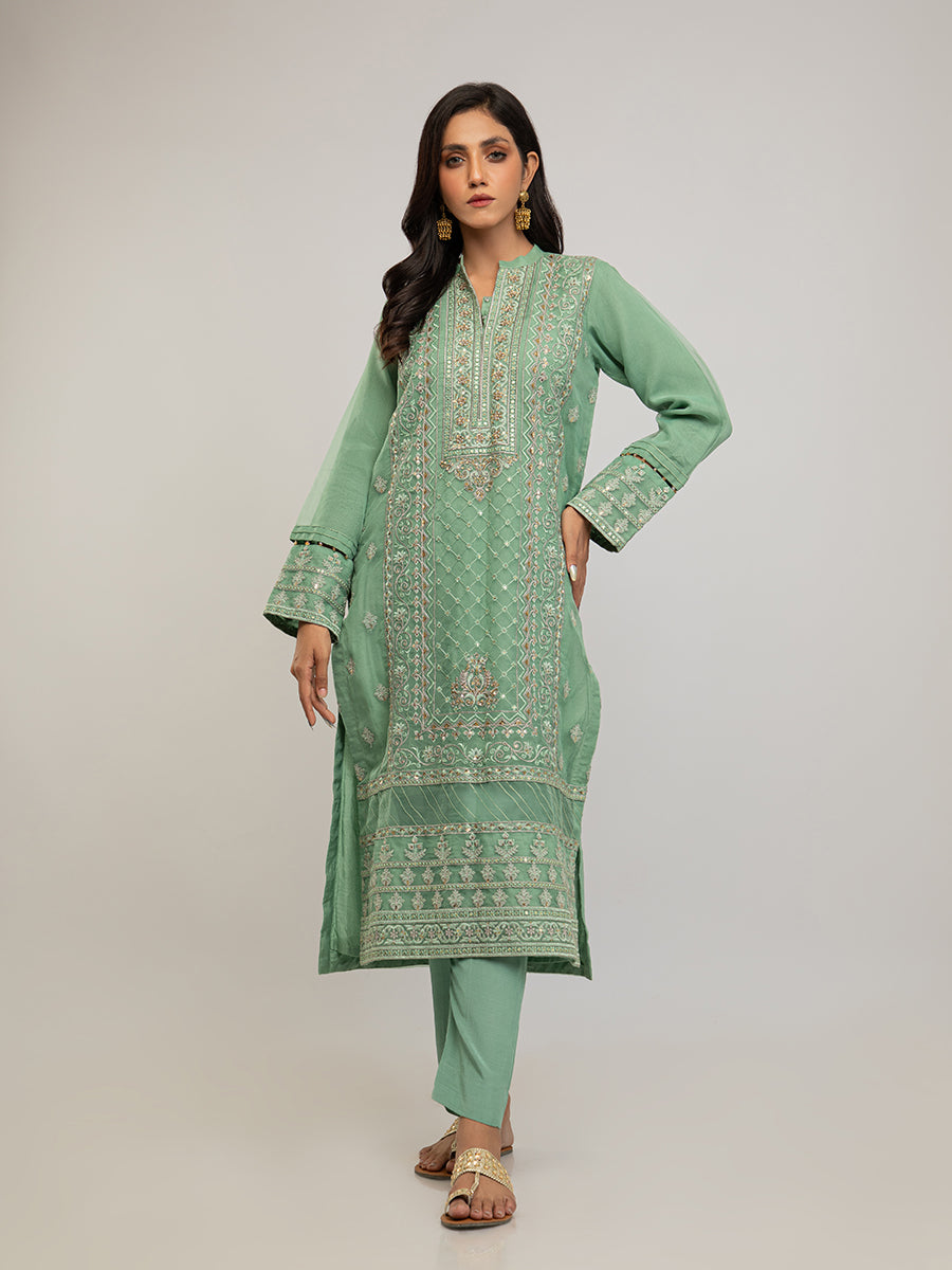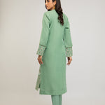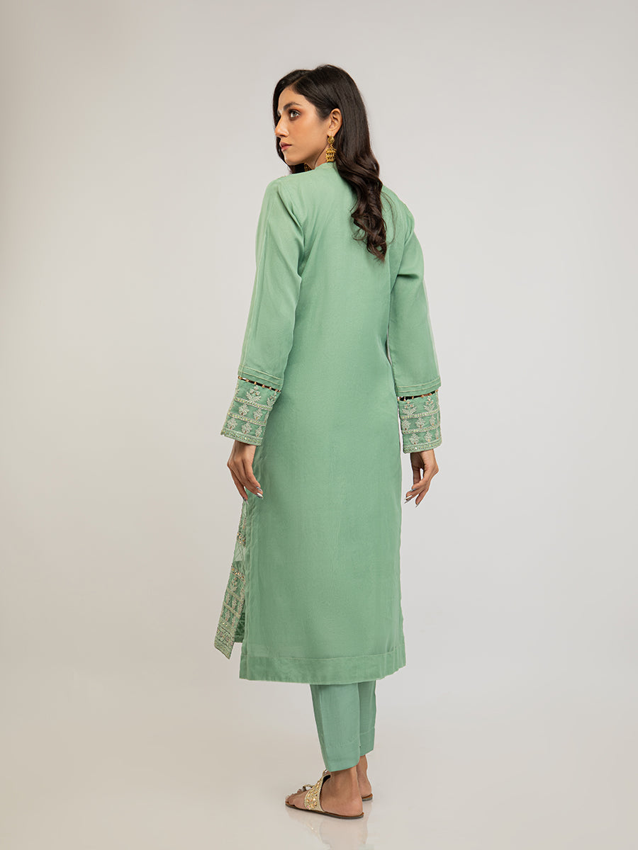 Straight hand embellished shirt with band collar and beads detail on front, paired up with matching trousers.