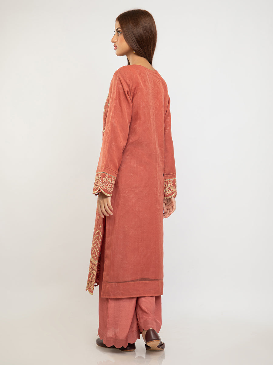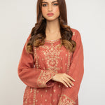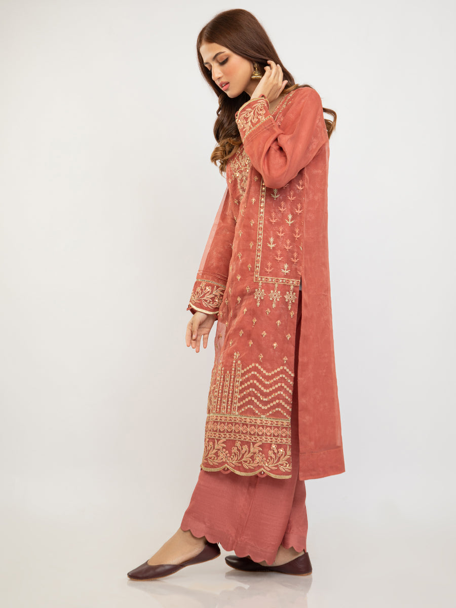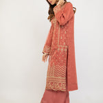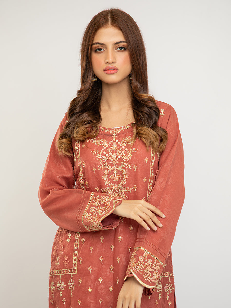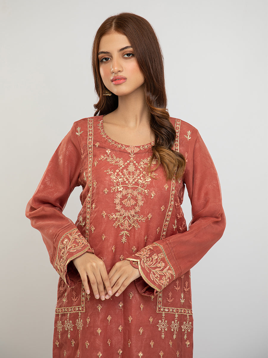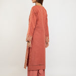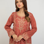 Basic straight shirt with round neck and loop and bead details on hems, paired with matching trousers.