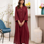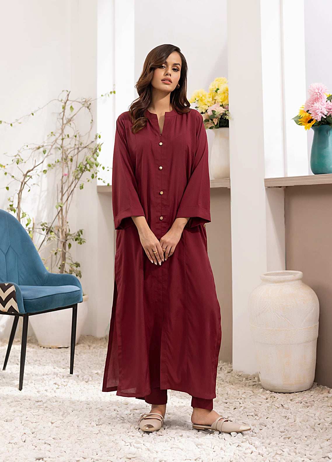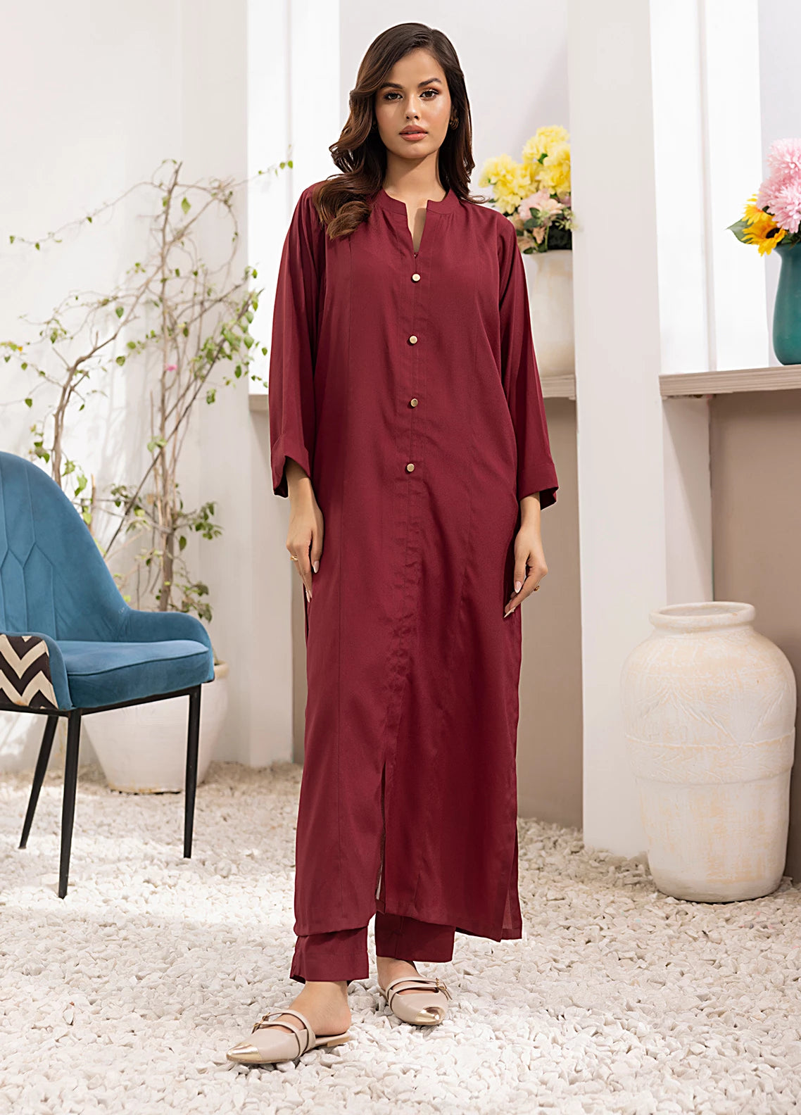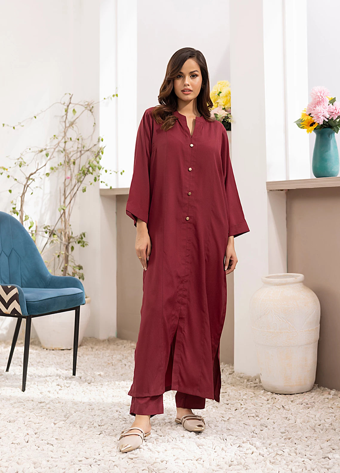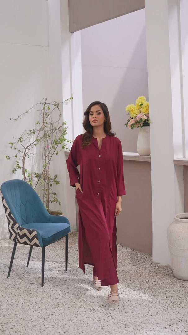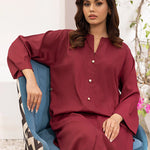 Straight shirt front open with band collar and button on plaket paired with straight pant.
