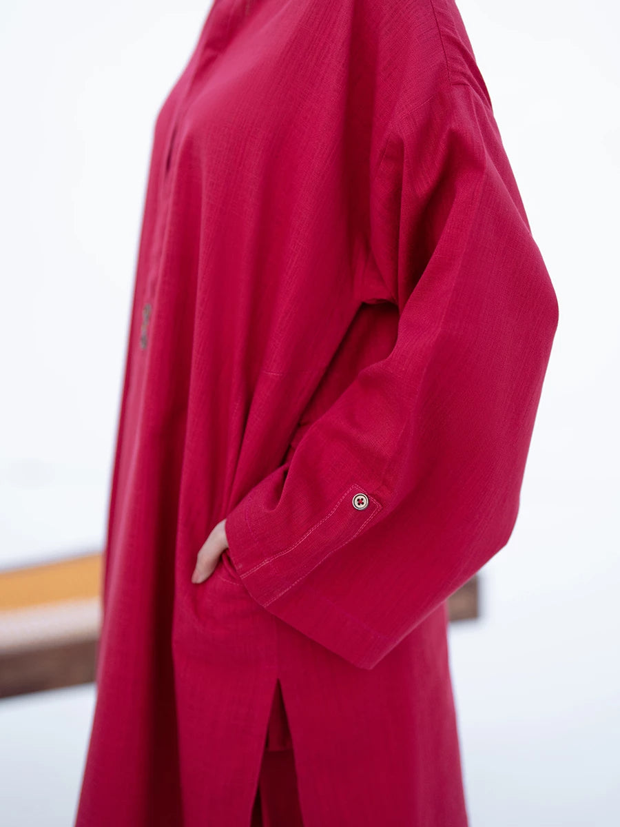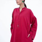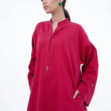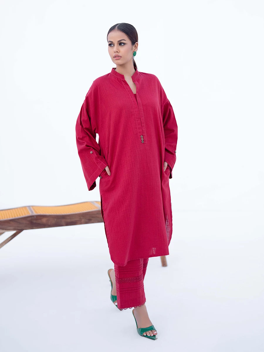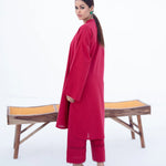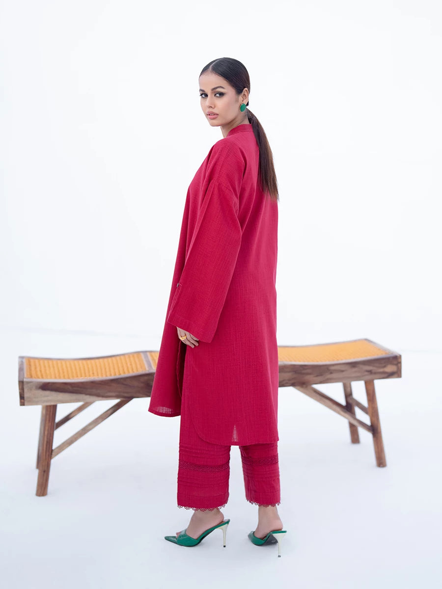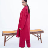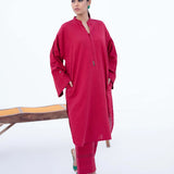 This vibrant red 2-piece stitched Khaddar suit offers comfort,