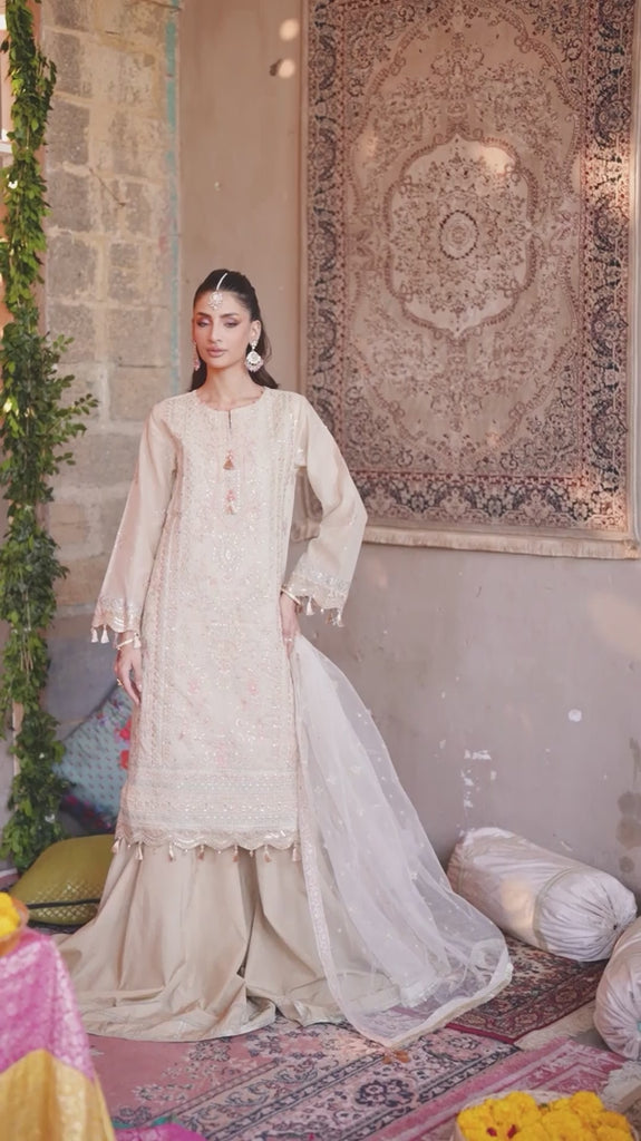 Note: Extra tassels, laces and Boxes for shoot purpose wouldn't be included in Unstitched Dresses, They are only for Model Shoot Purpose.