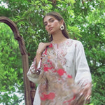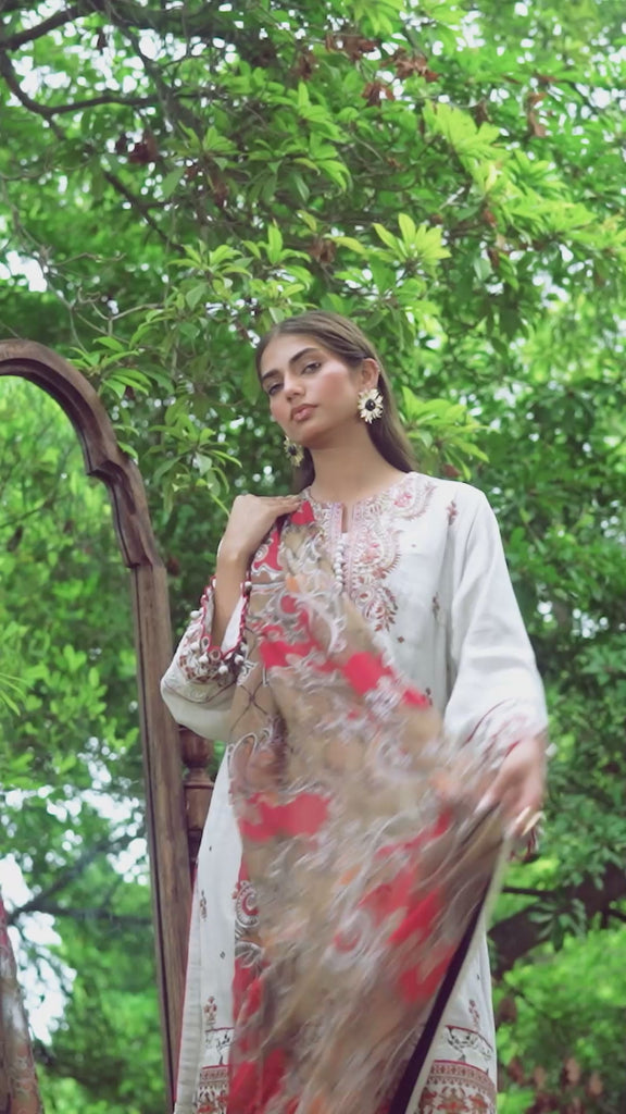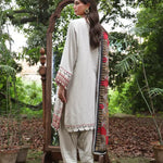 Elegant in ivory: A sophisticated three-piece suit with delicate embroidery and a Munar dupatta, blending classic charm with modern grace