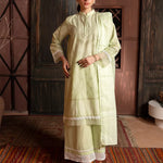 Shirt Details: Foil printed shirt with band collar and round armhole, Lace detailing on sleeves and daman.