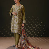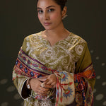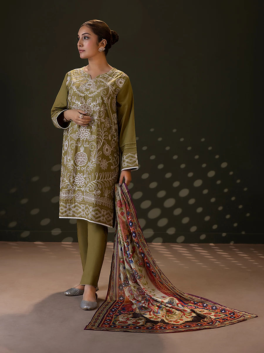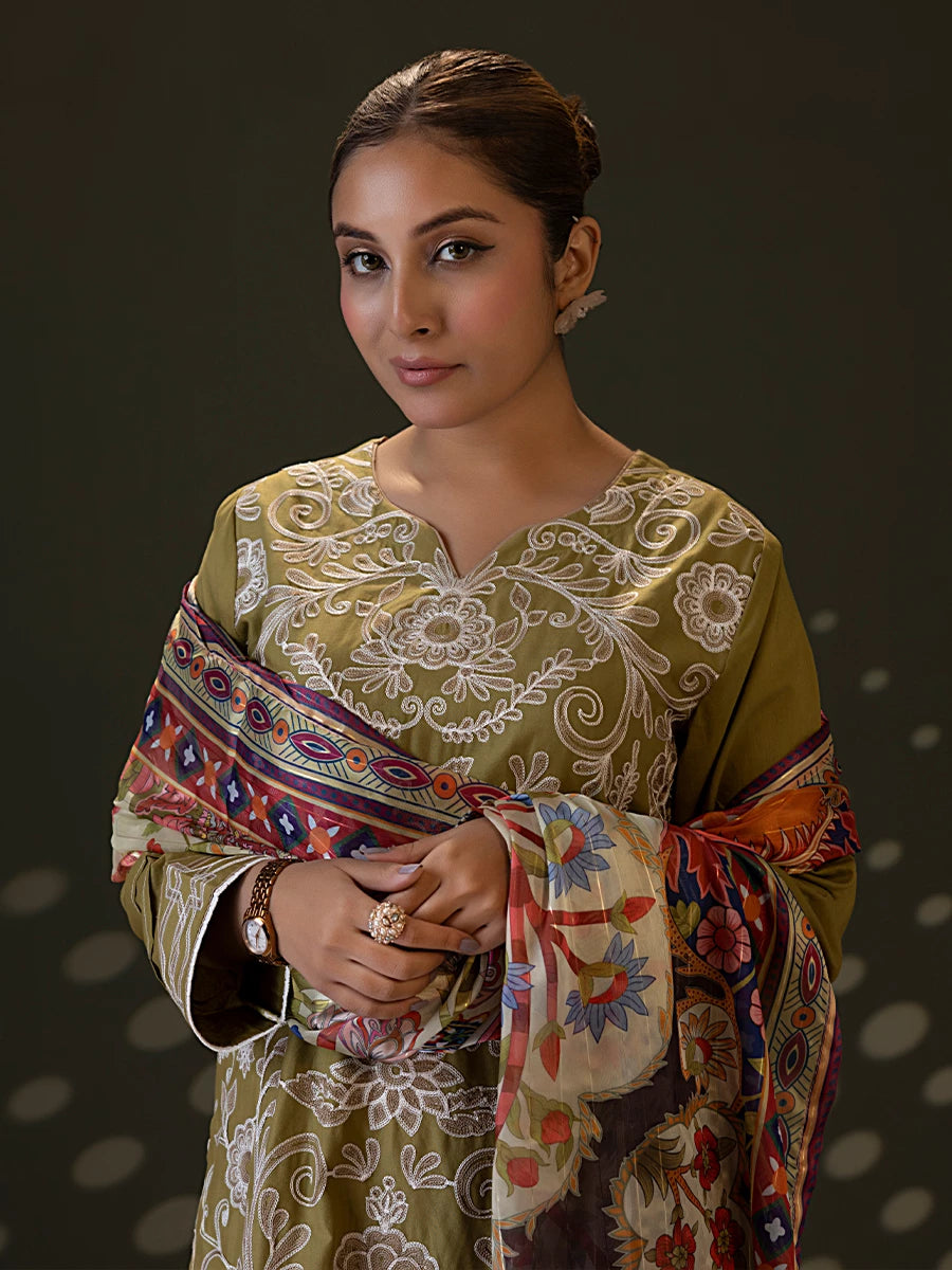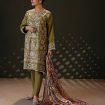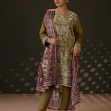 Chic 3-piece set: cambric shirt & trouser with a silk zari dupatta in elegant olive. Lightweight, breathable, & perfect for a stylish, graceful look.