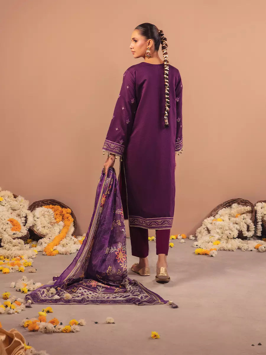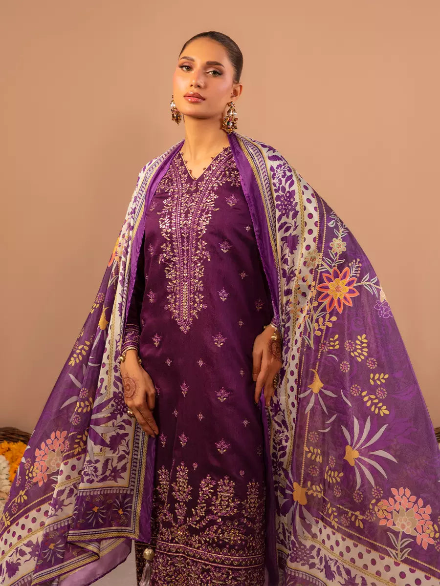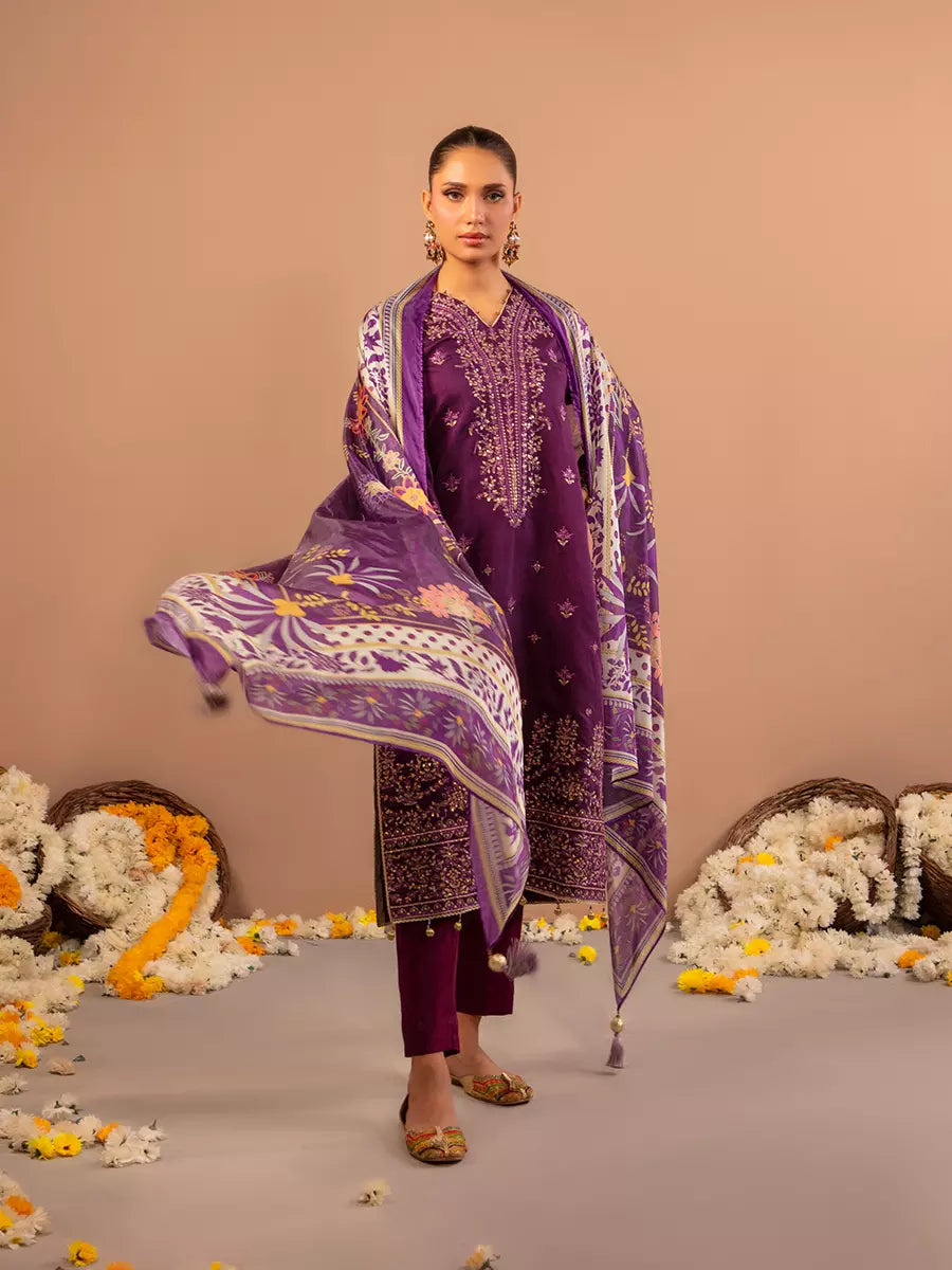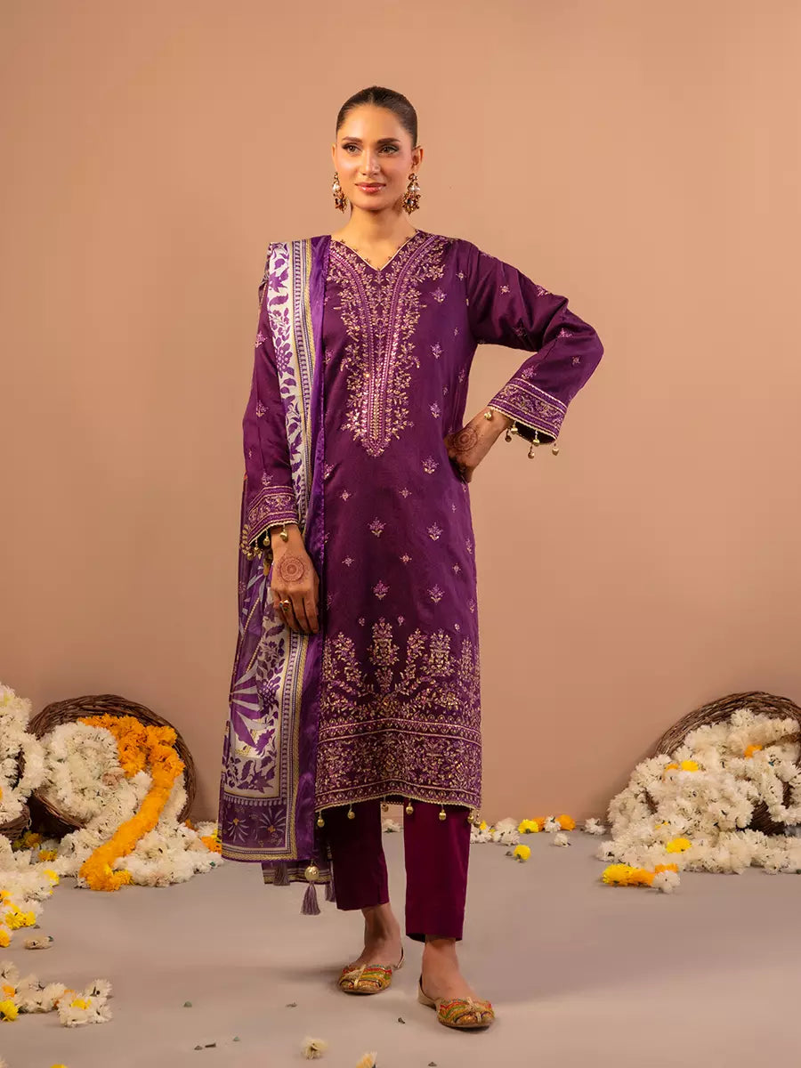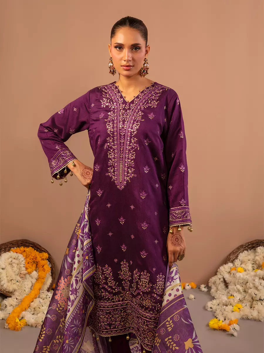 Celebrate tradition with our 3PC unstitched festive embroidered suit, crafted from premium fabric with elegant embroidery a versatile and stylish pick for any occasion.