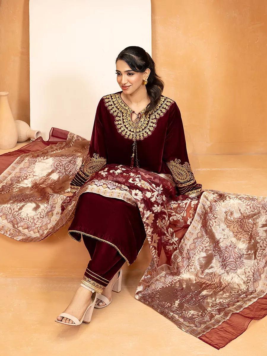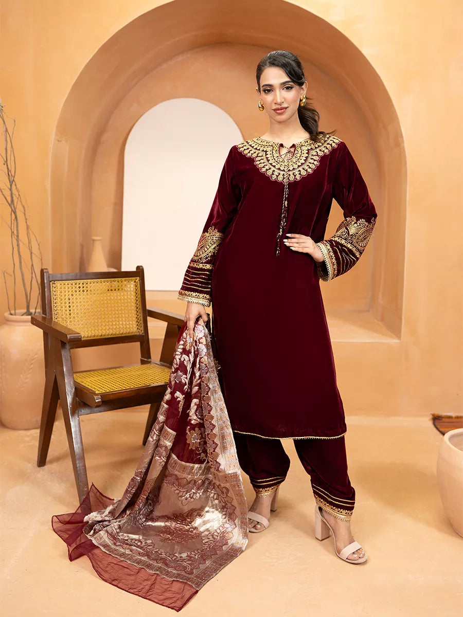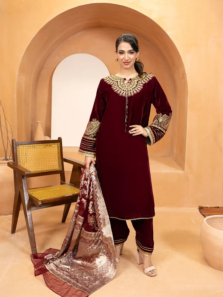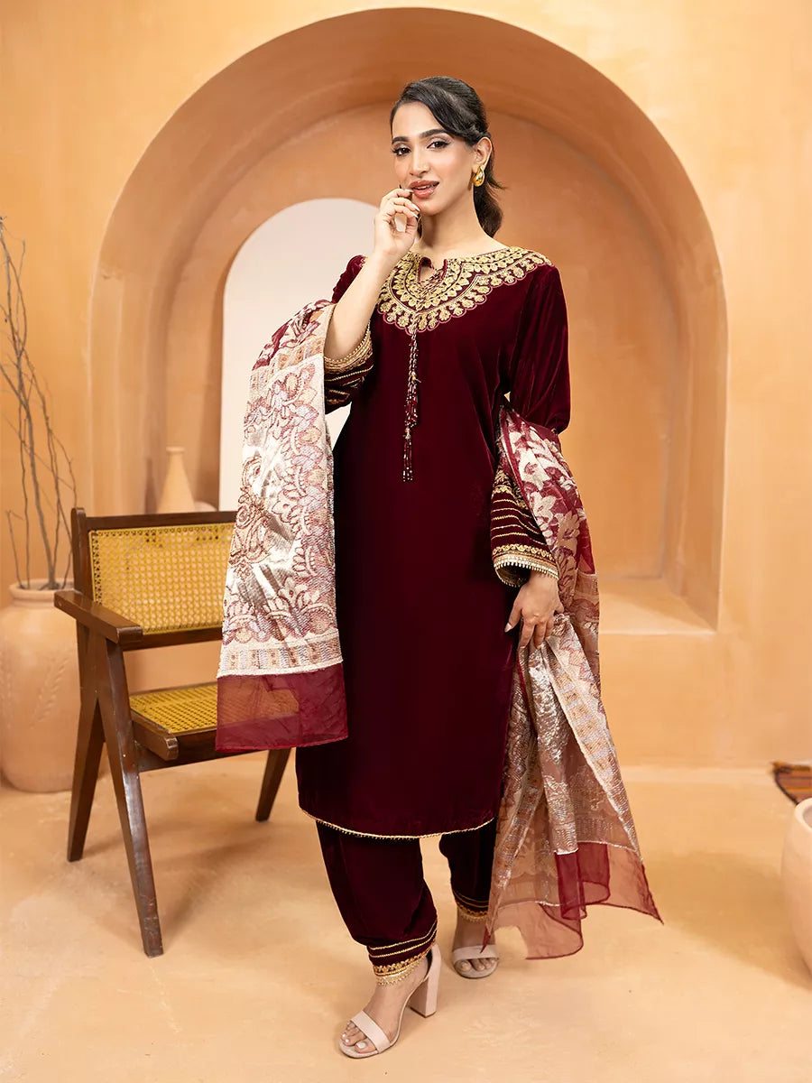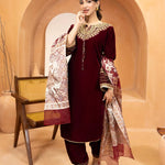 3PC Stitched Velvet Embroidered Suit (WP7L3PEF481)