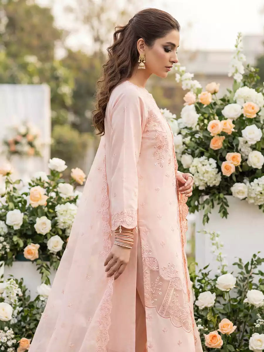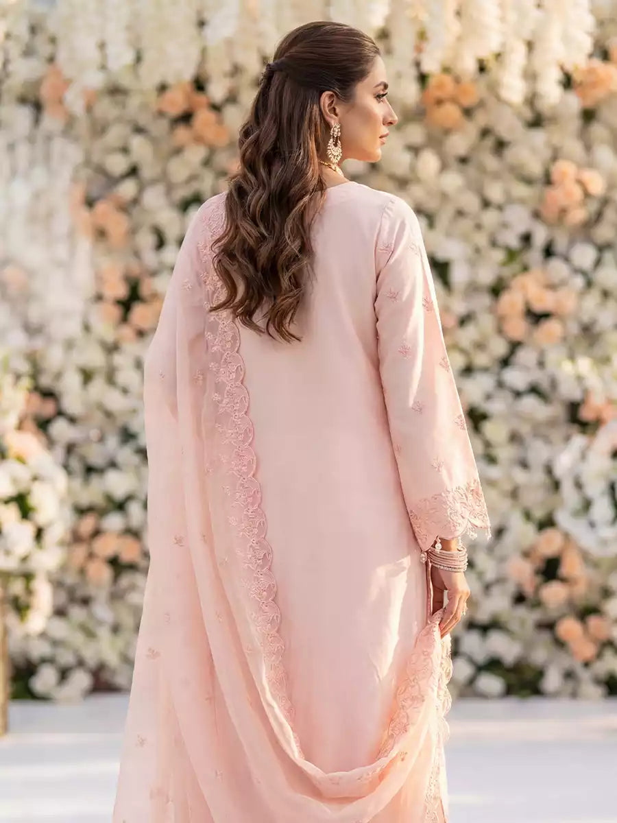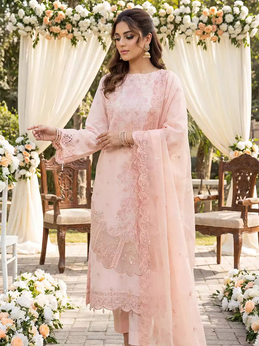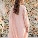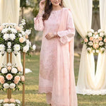 Elegant 3PC ladies suit featuring a cambric laser embroidered shirt, paired with a beautiful embroidered chiffon dupatta and a dyed cambric trouser. Perfect for a graceful and stylish everyday or semi-formal look.