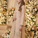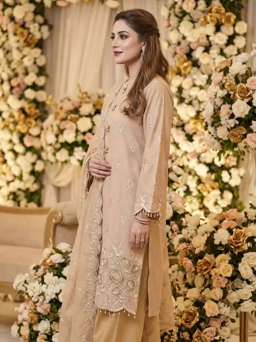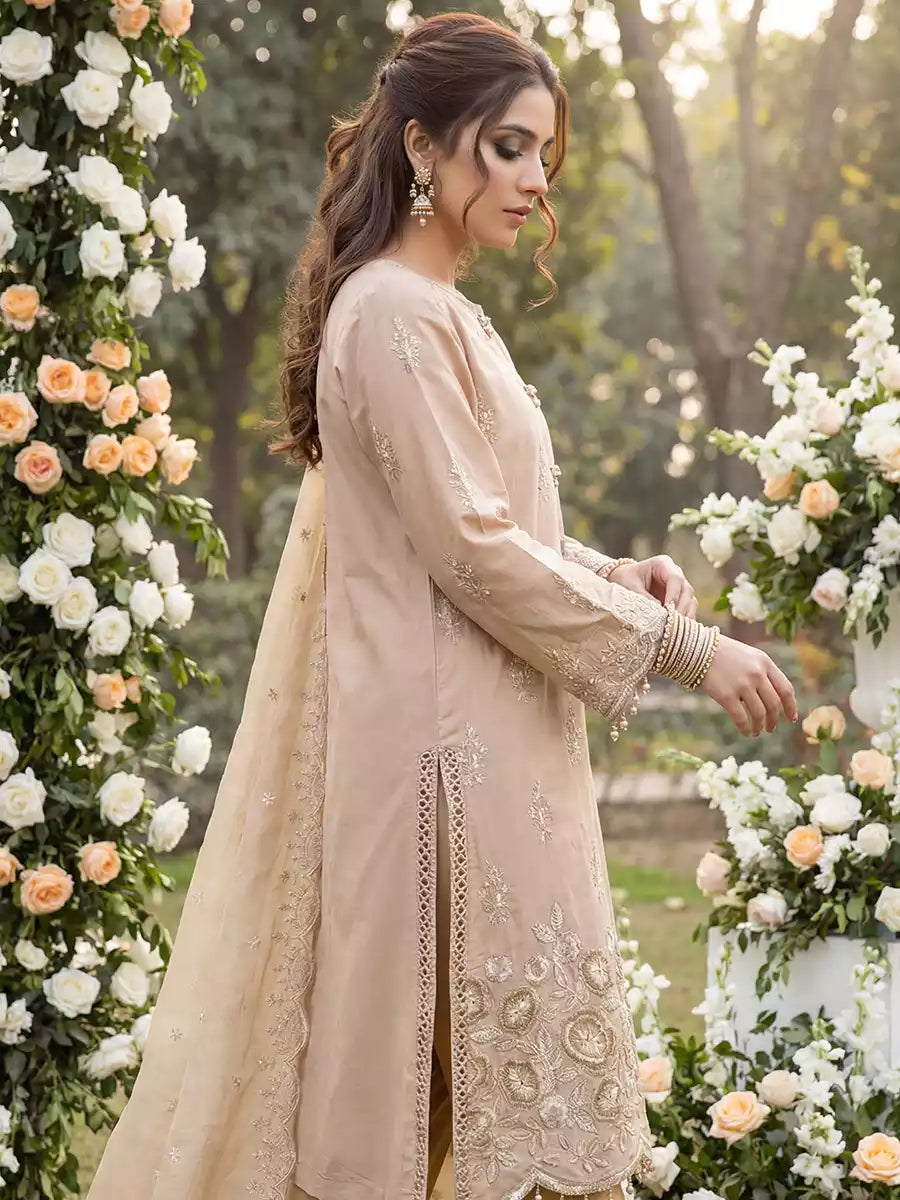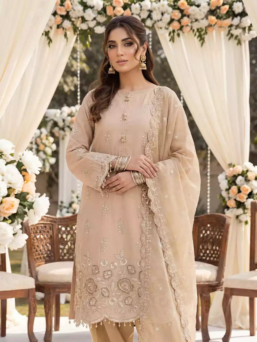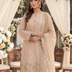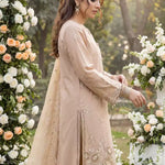 Elegant 3PC ladies suit featuring a cambric laser embroidered shirt, paired with a beautiful embroidered chiffon dupatta and a dyed cambric trouser. Perfect for a graceful and stylish everyday or semi-formal look.