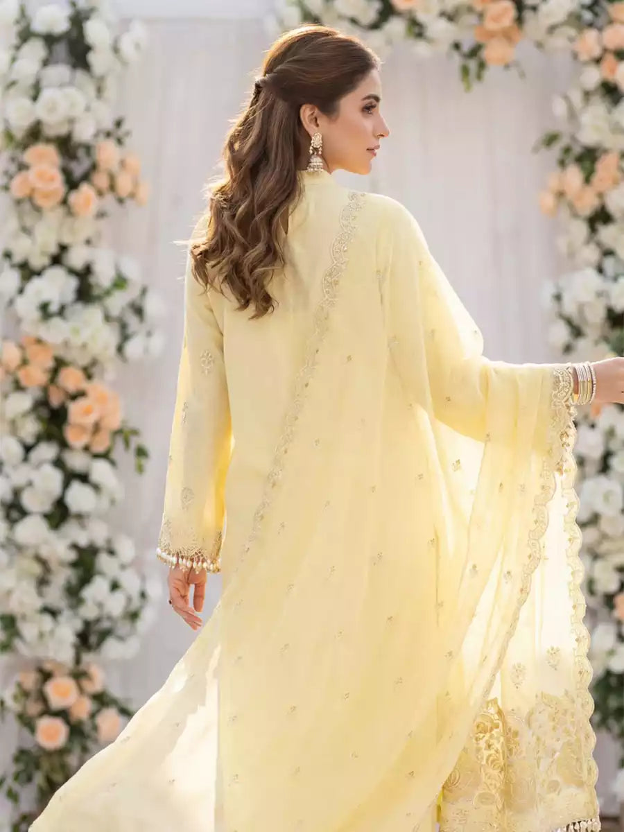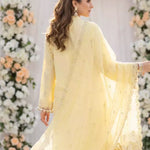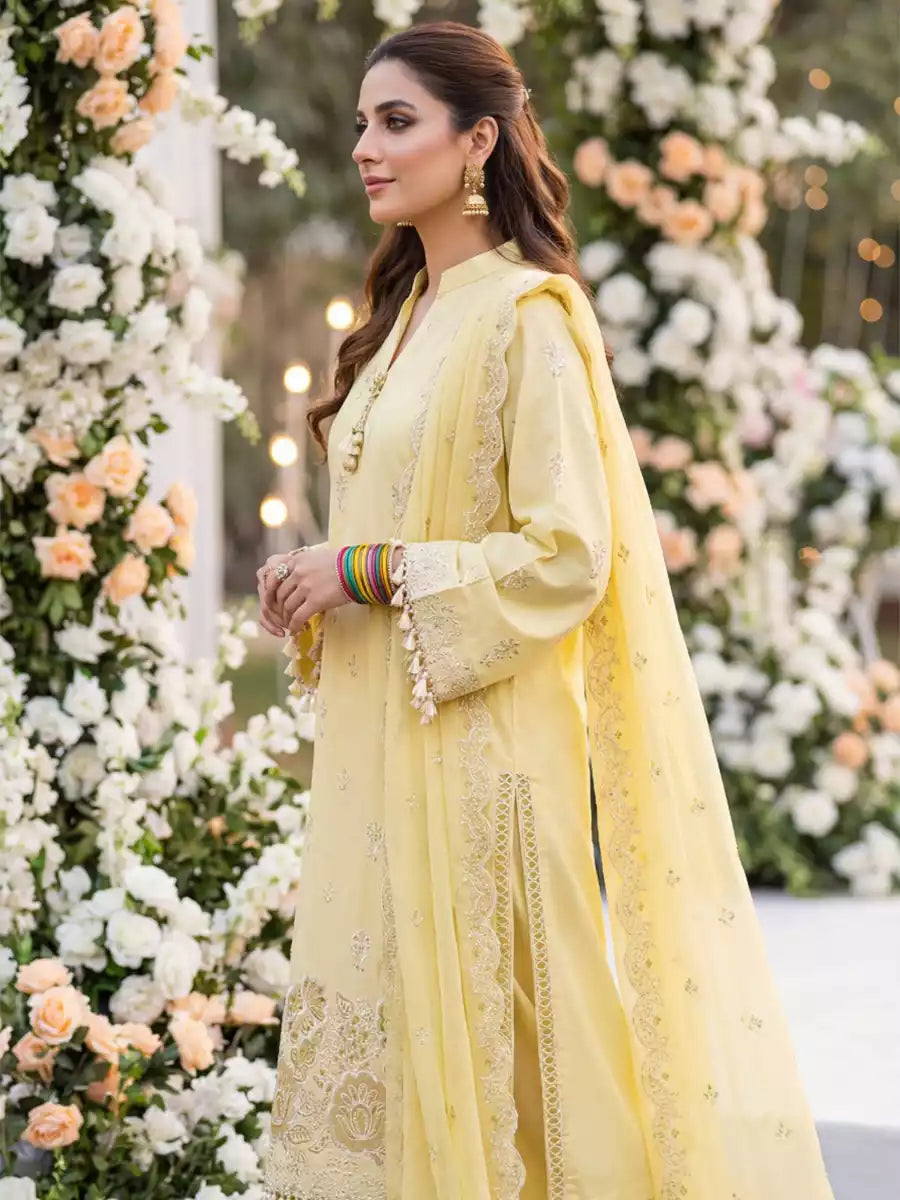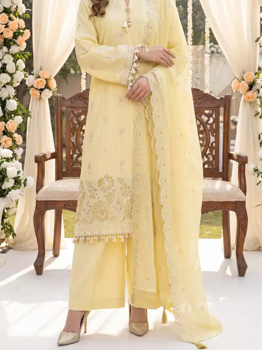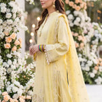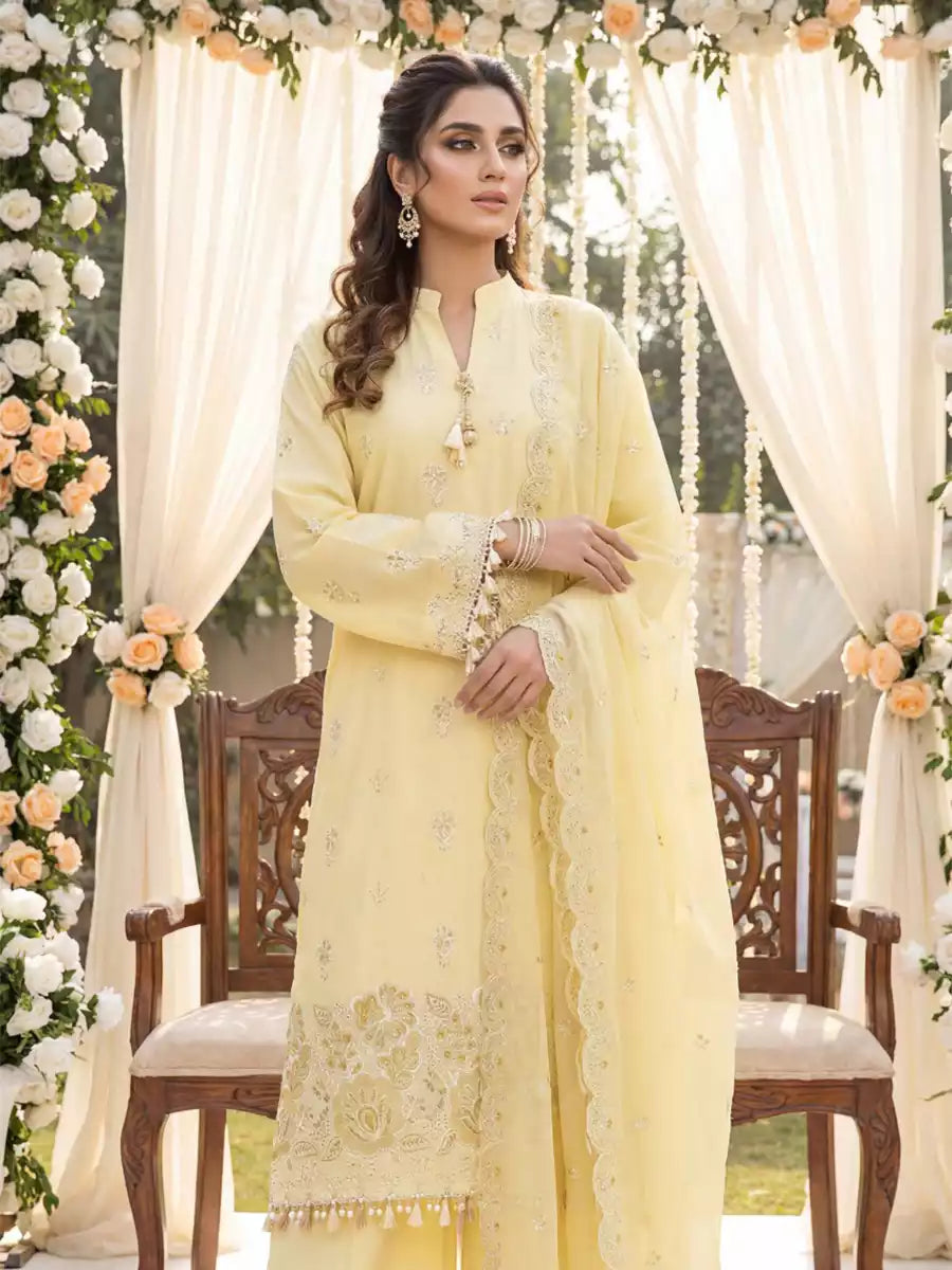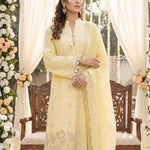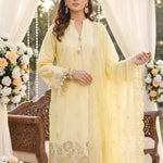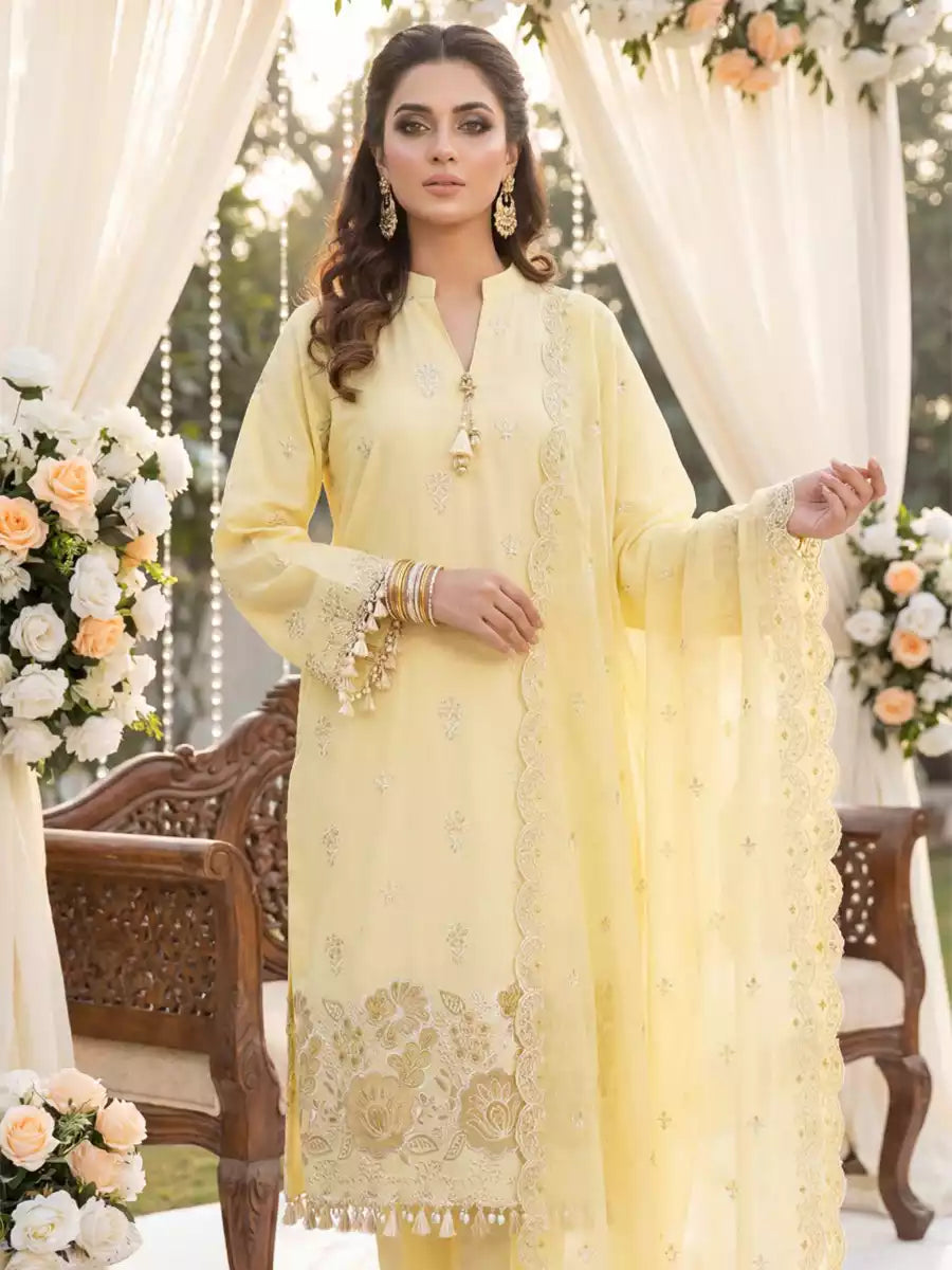 Elegant 3PC ladies suit featuring a cambric laser embroidered shirt, paired with a beautiful embroidered chiffon dupatta and a dyed cambric trouser. Perfect for a graceful and stylish everyday or semi-formal look.