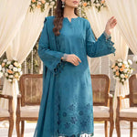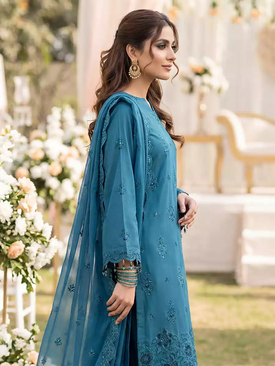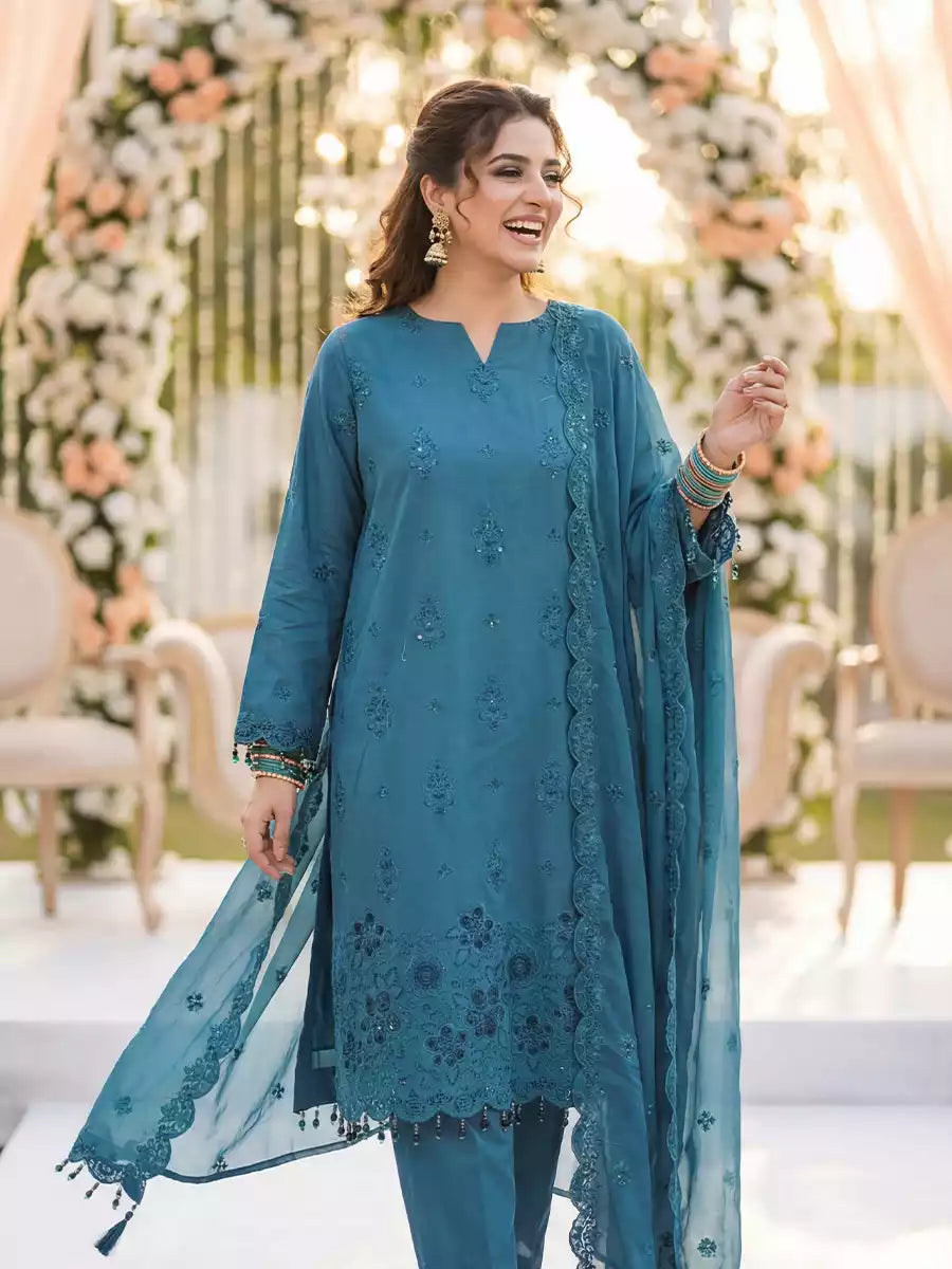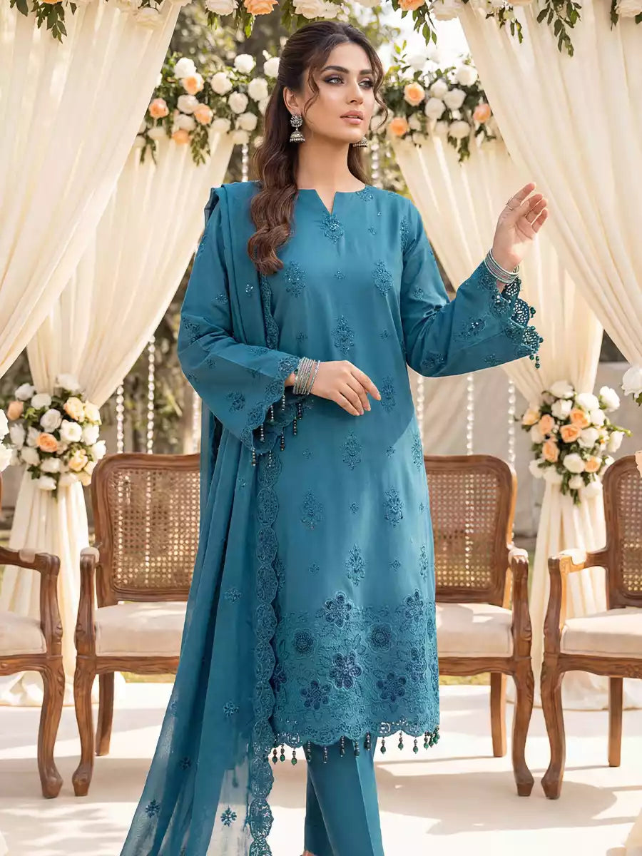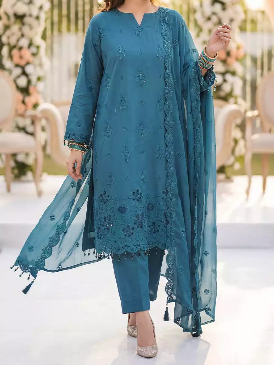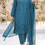 Elegant 3PC ladies suit featuring a cambric laser embroidered shirt, paired with a beautiful embroidered chiffon dupatta and a dyed cambric trouser. Perfect for a graceful and stylish everyday or semi-formal look.