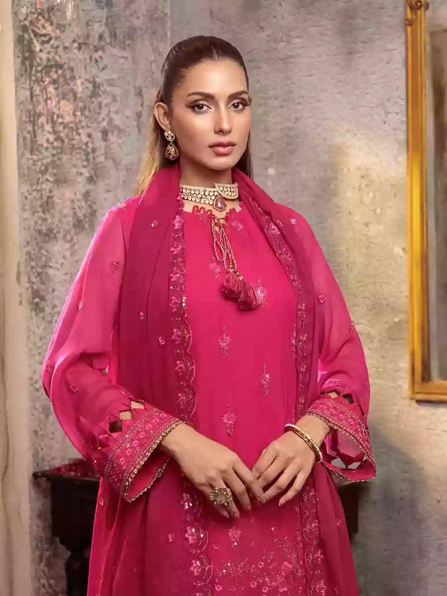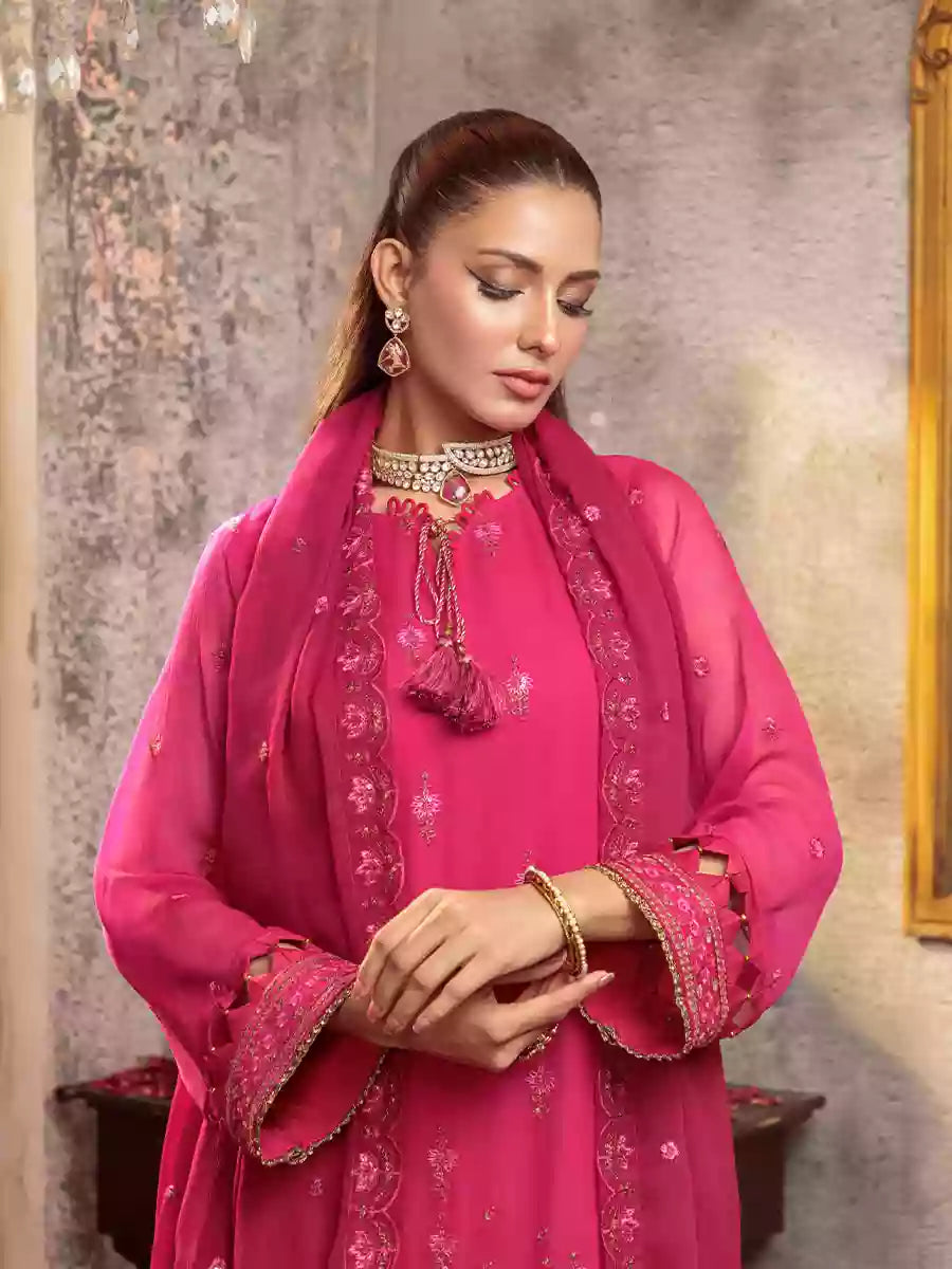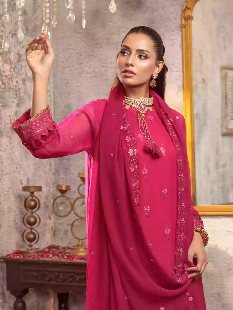 Beautify your wardrobe with this signature 3PC unstitched chiffon embroidered suit — a flawless fusion of soft textures, intricate detailing, and graceful charm. This ensemble promises to add a timeless essence to your wardrobe, making every occasion effortlessly memorable.
