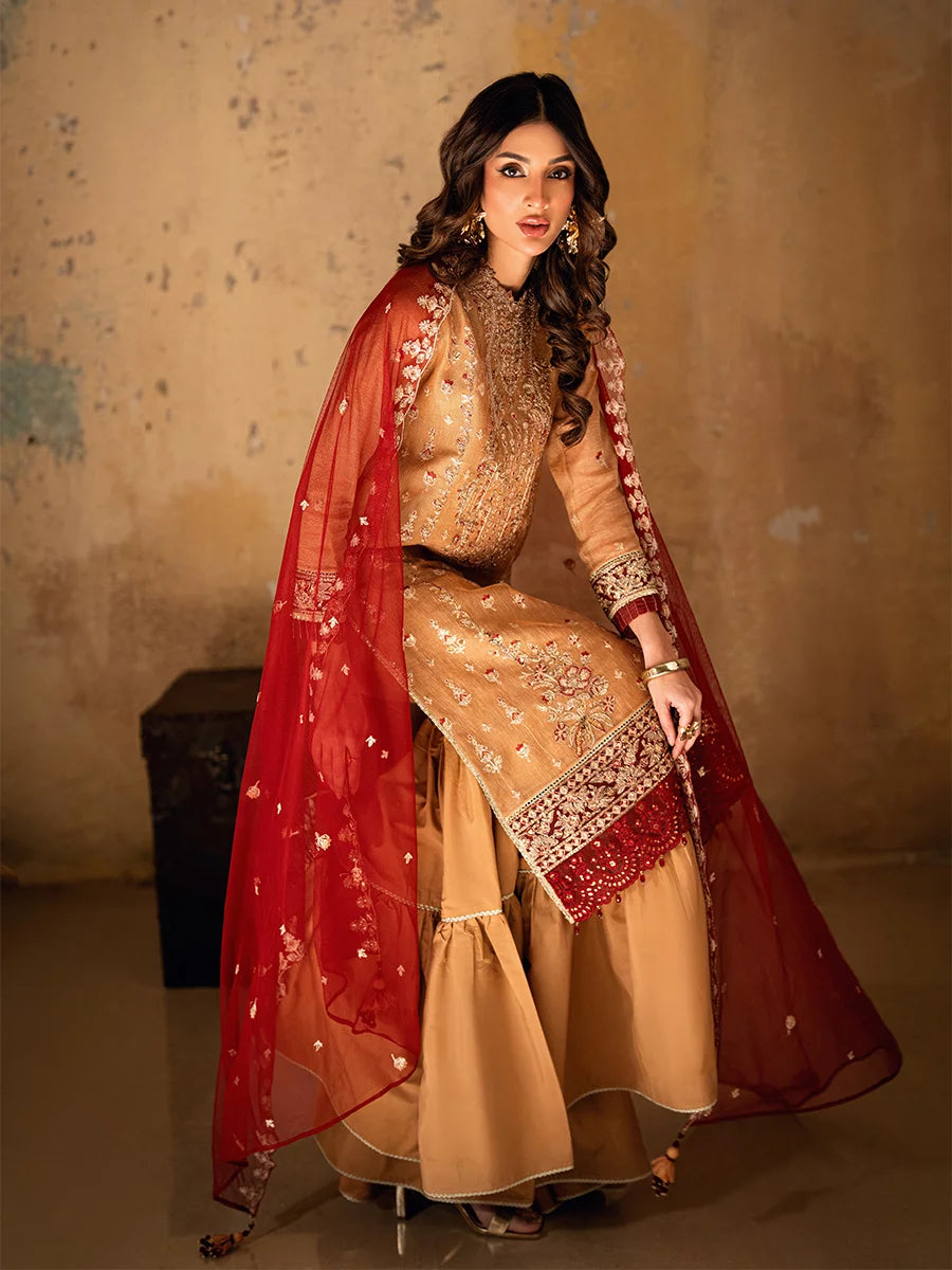 Note: Extra tassels, laces and Boxes for shoot purpose wouldn't be included in Unstitched Dresses, They are only for Model Shoot Purpose.