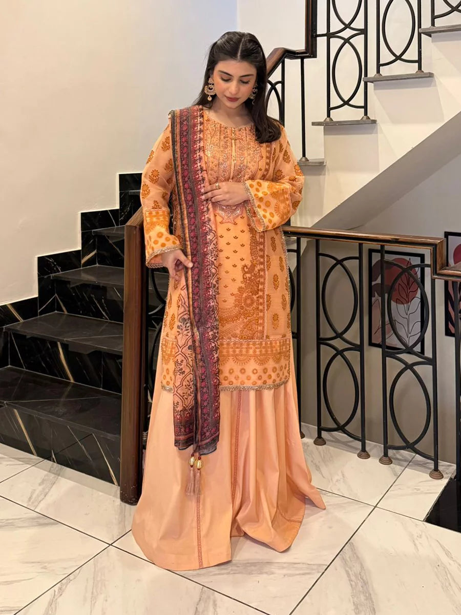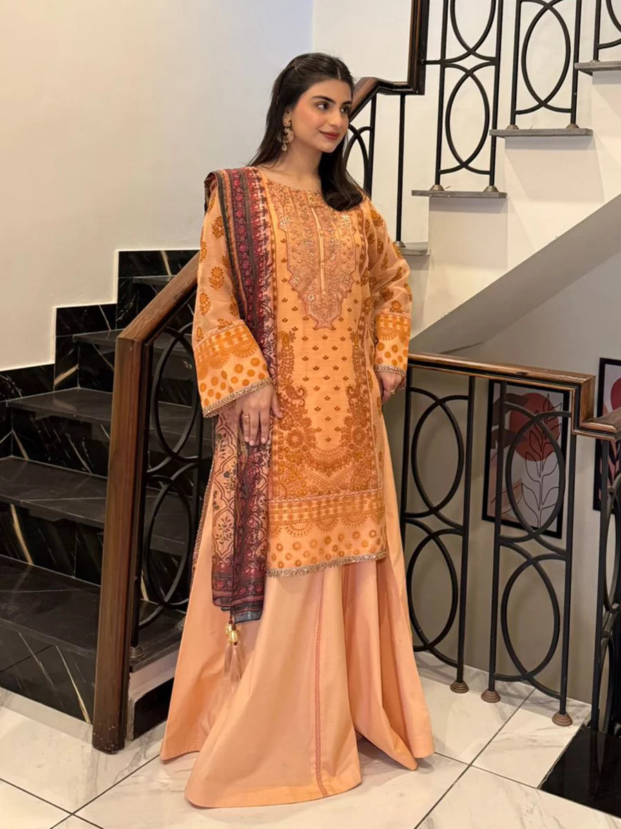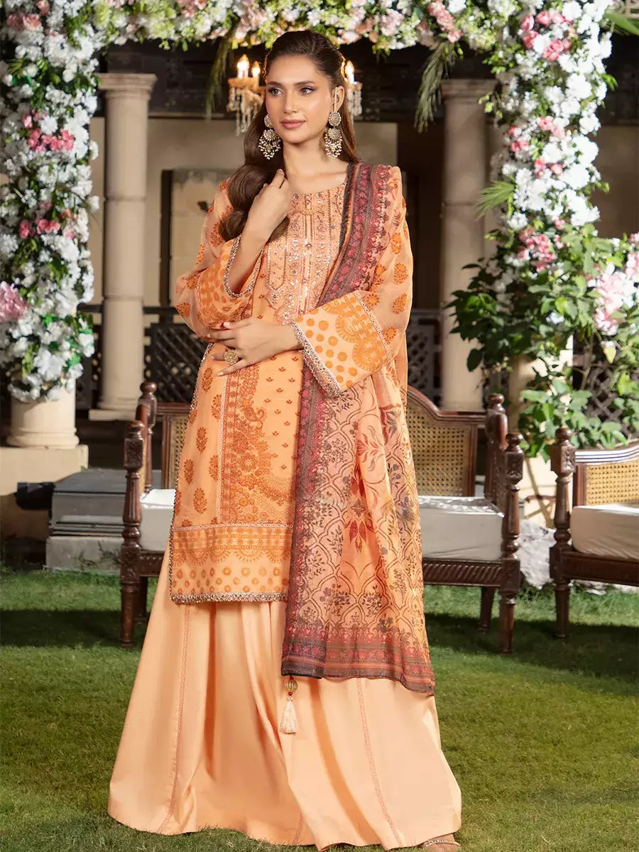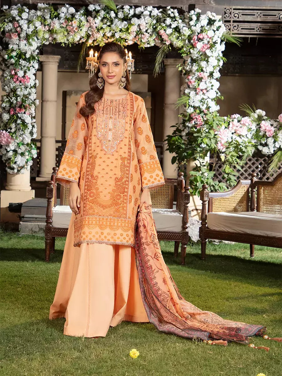 Shine brighter this season with Jashn-e-Noor, A stunning 3PC festive embroidered suit designed to enhance every celebration with effortless glamour and rich, intricate craftsmanship.