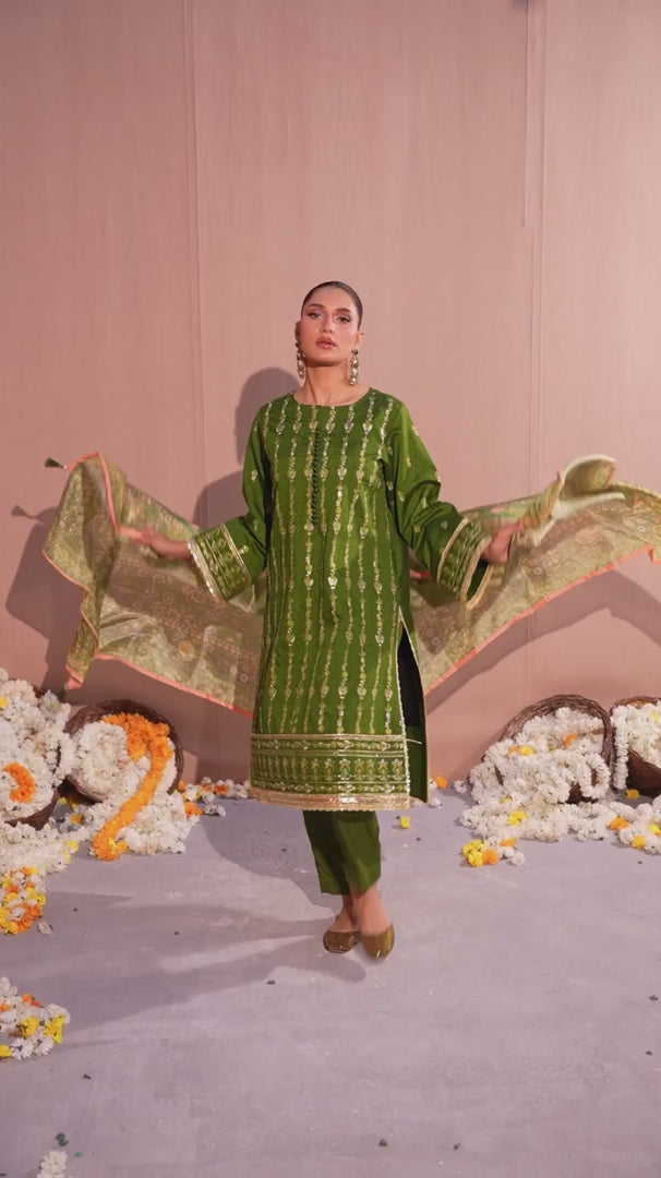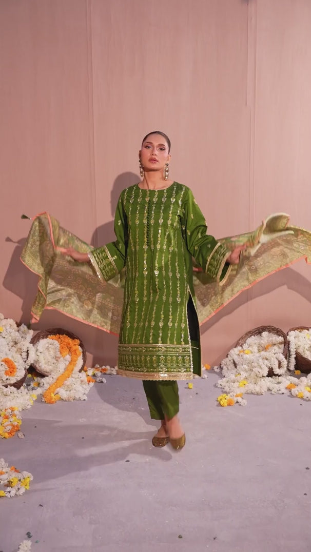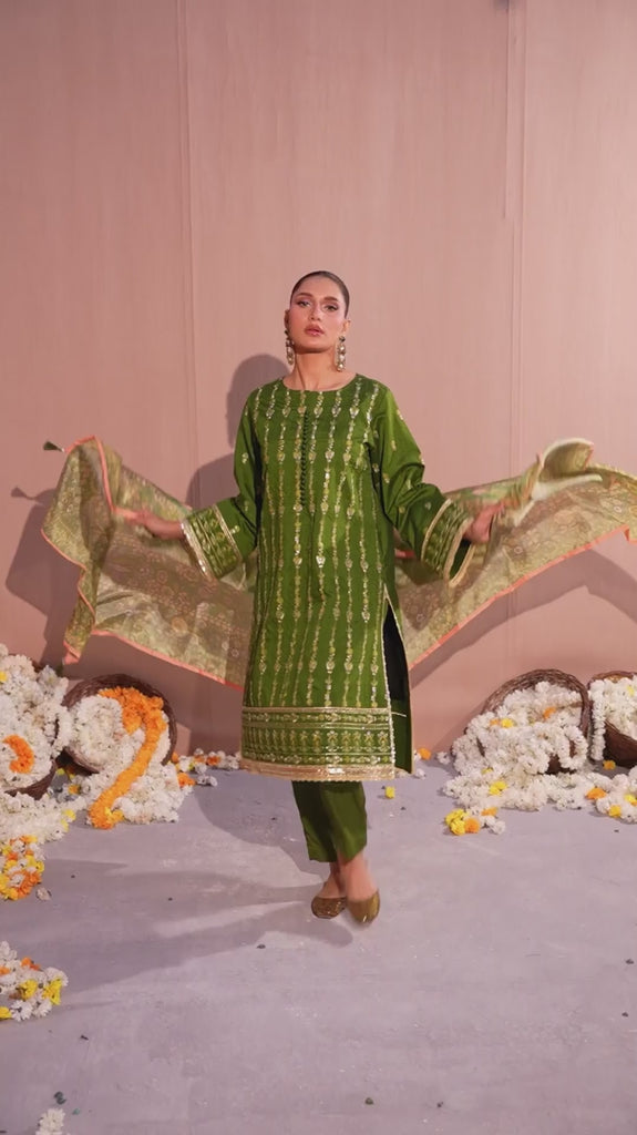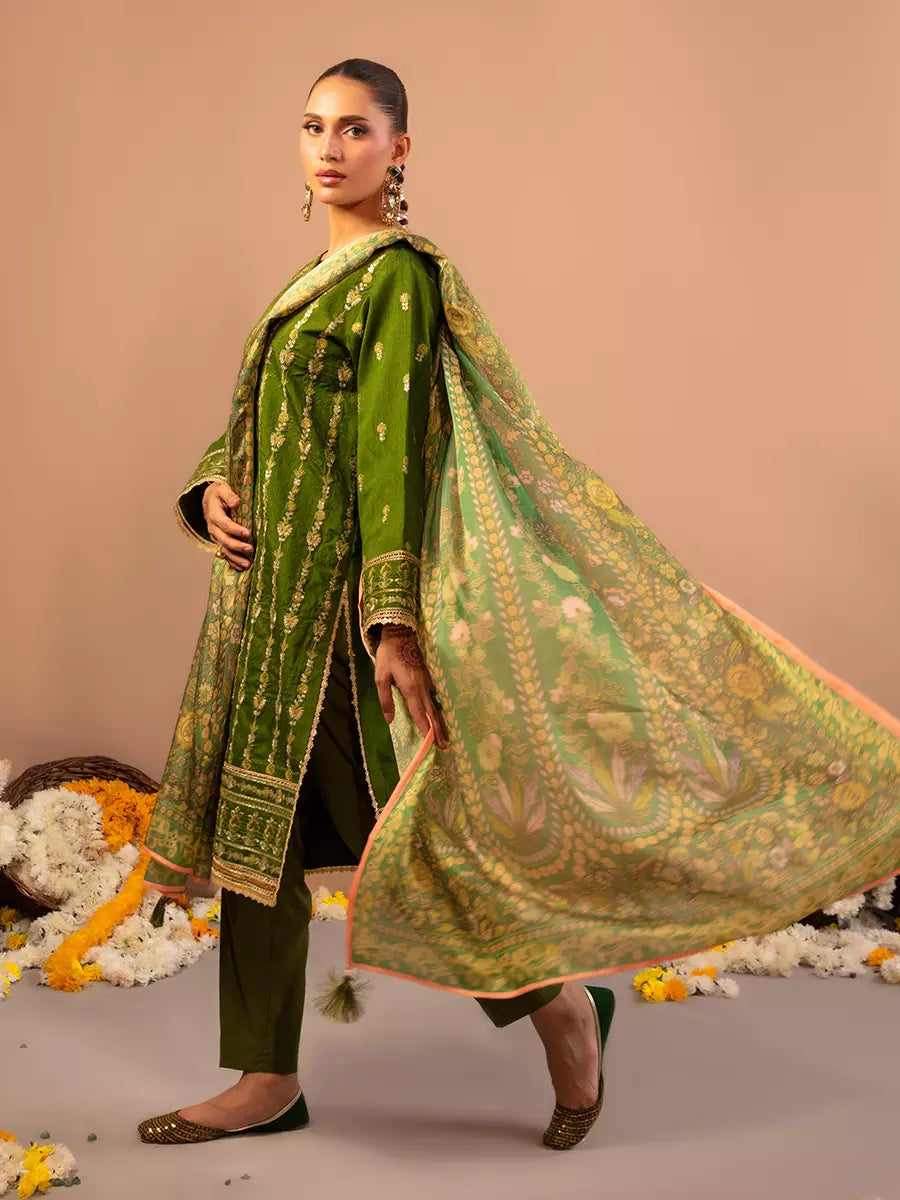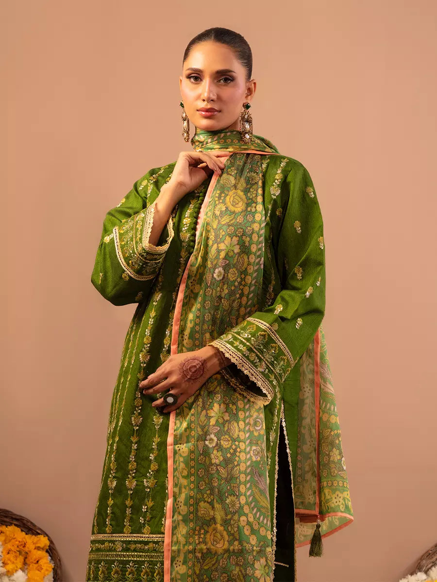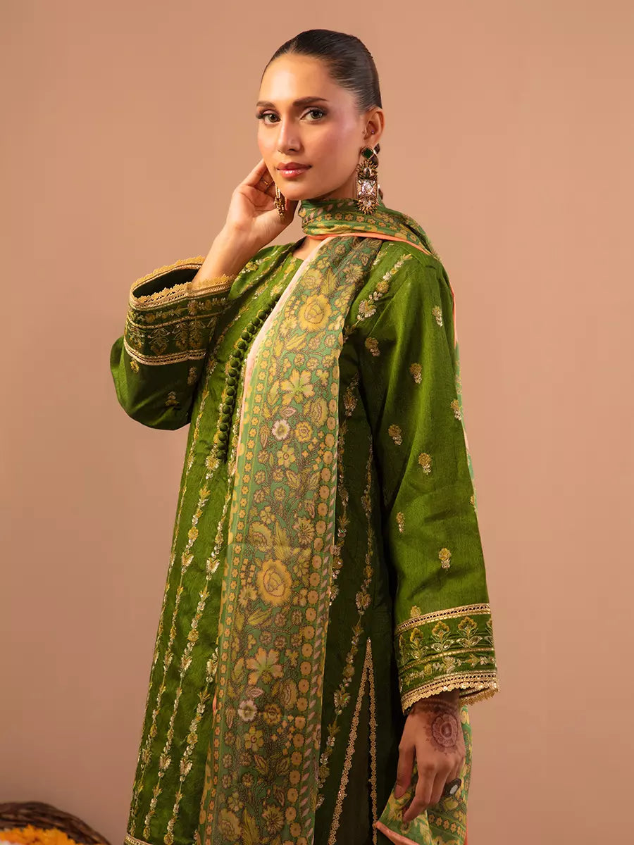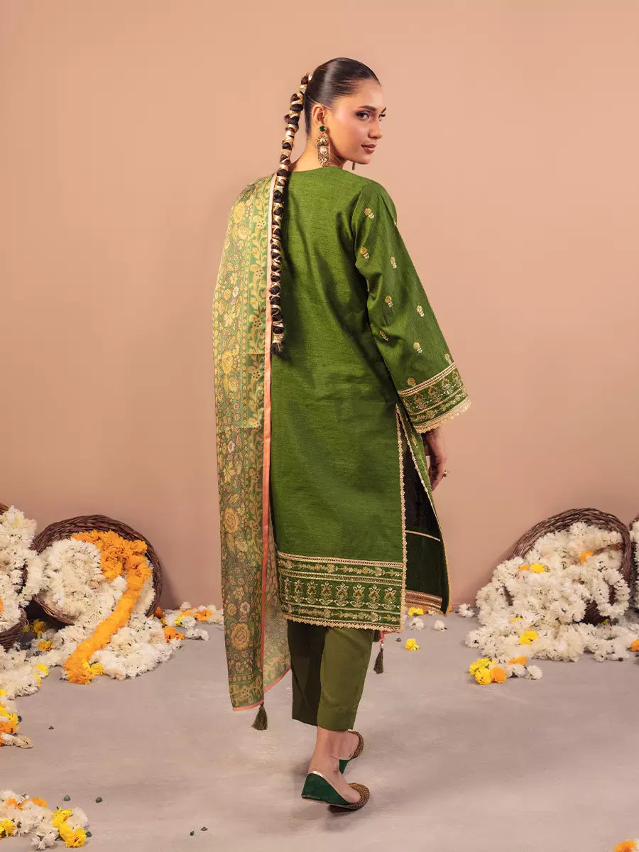 Celebrate tradition with our 3PC unstitched festive embroidered suit, crafted from premium fabric with elegant embroidery a versatile and stylish pick for any occasion.