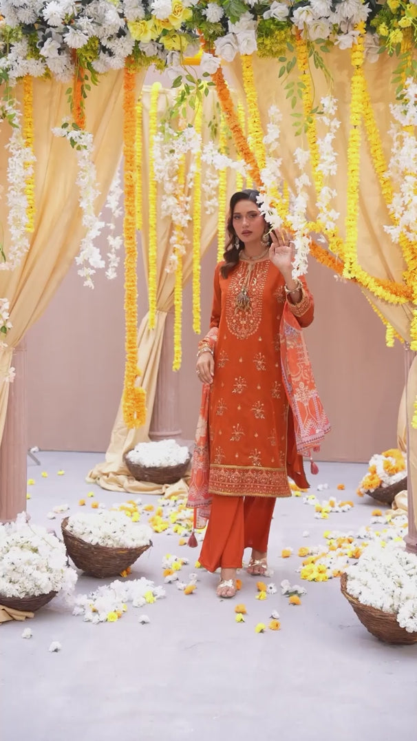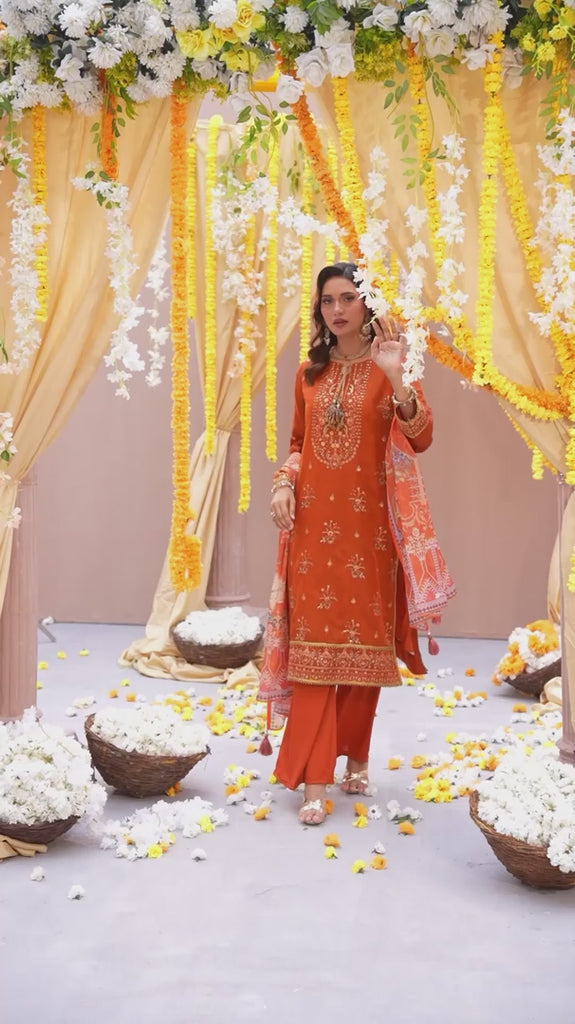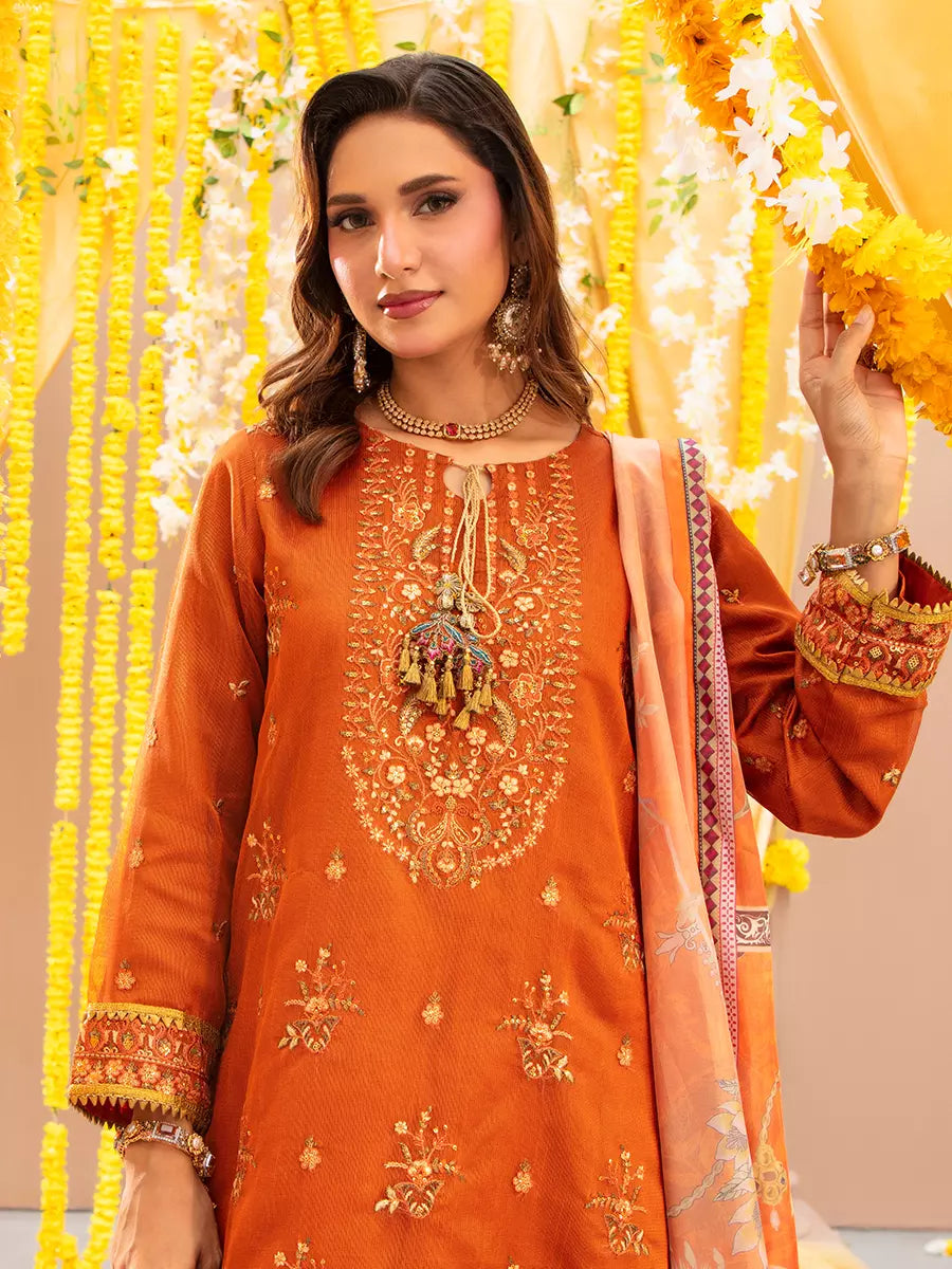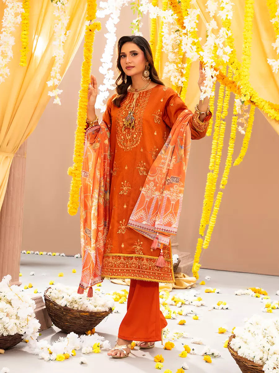 Celebrate tradition with our 3PC unstitched festive embroidered suit, crafted from premium fabric with elegant embroidery a versatile and stylish pick for any occasion.