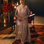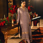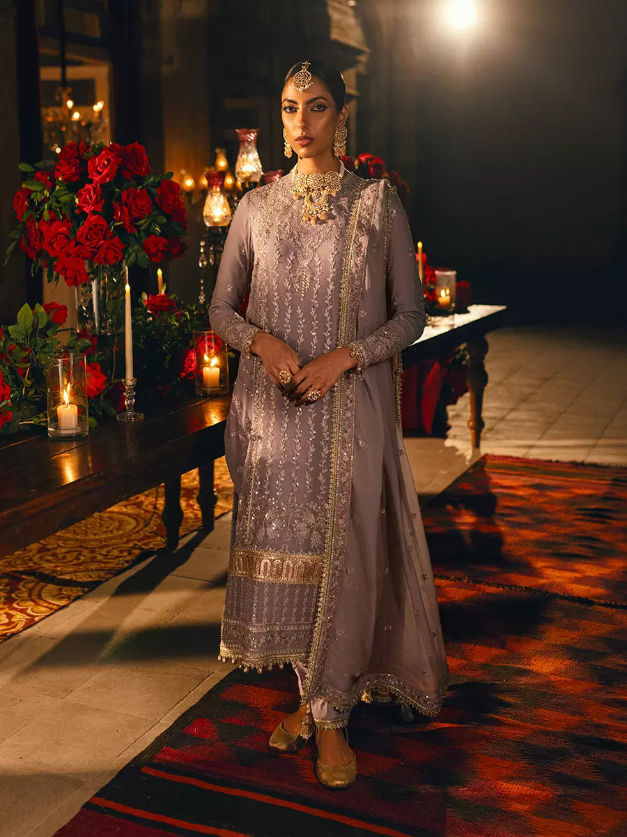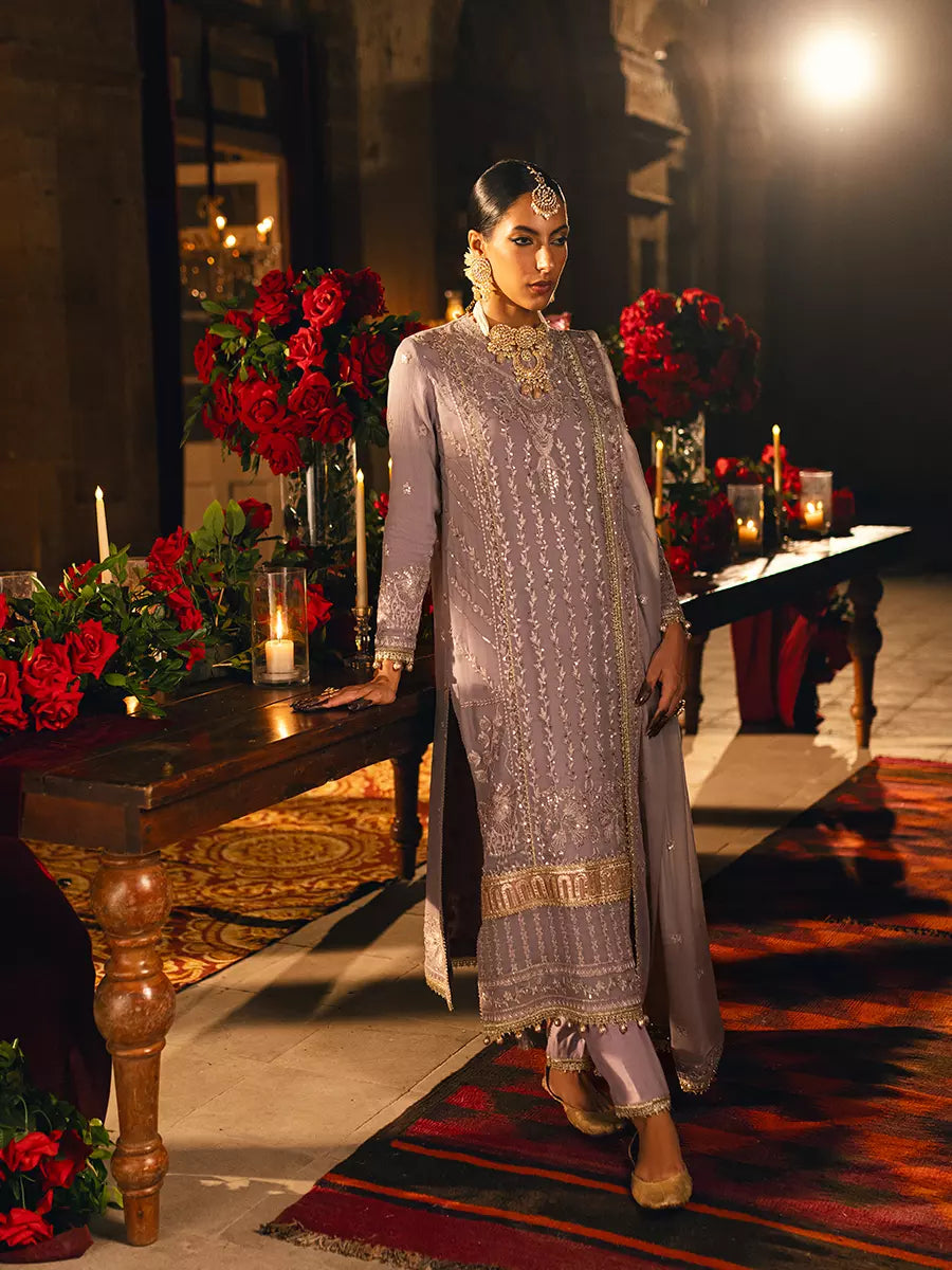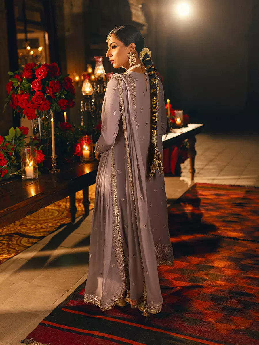 Exude an aura of romance in this lilac chiffon creation crafted with soft gold Zari sequins, worn with complementing dyed raw silk lowers and offset with a chiffon Zari sequin- embroidered chiffon dupatta.