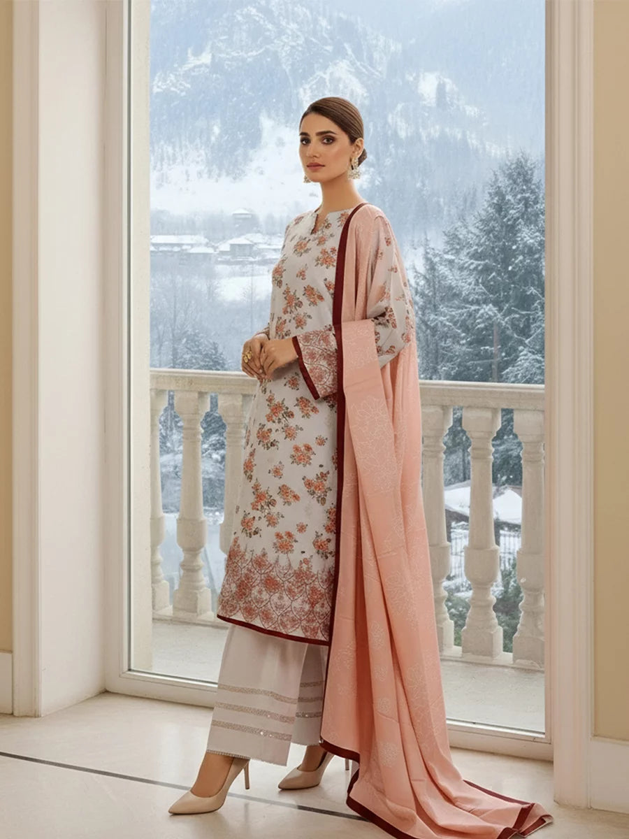 Elegant 3-piece khaddar suit featuring a beautifully printed khaddar shirt, printed khaddar dupatta, and a Plain trouser. Crafted from soft winter khaddar fabric, this outfit combines comfort with timeless floral charm, perfect for everyday elegance and seasonal style.