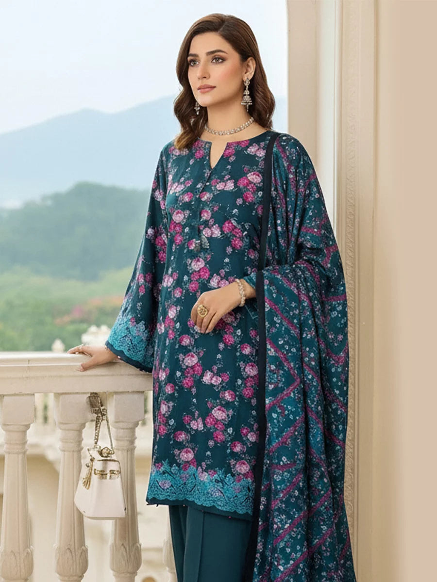 Elegant 3-piece khaddar suit featuring a beautifully printed khaddar shirt, printed khaddar dupatta, and a Plain trouser. Crafted from soft winter khaddar fabric, this outfit combines comfort with timeless floral charm, perfect for everyday elegance and seasonal style.