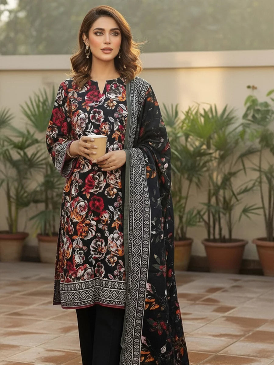 Elegant 3-piece khaddar suit featuring a beautifully printed khaddar shirt, printed khaddar dupatta, and a Plain trouser. Crafted from soft winter khaddar fabric, this outfit combines comfort with timeless floral charm, perfect for everyday elegance and seasonal style.