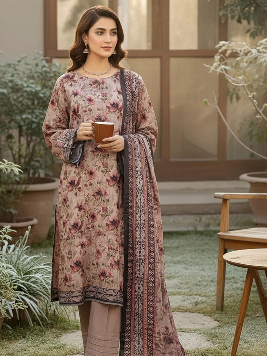 Elegant 3-piece khaddar suit featuring a beautifully printed khaddar shirt, printed khaddar dupatta, and a Plain trouser. Crafted from soft winter khaddar fabric, this outfit combines comfort with timeless floral charm, perfect for everyday elegance and seasonal style.