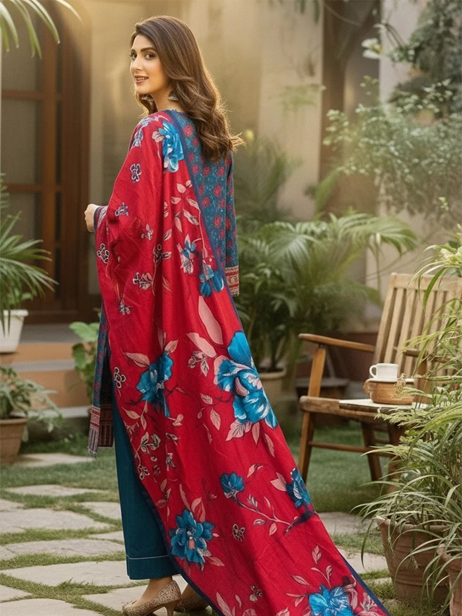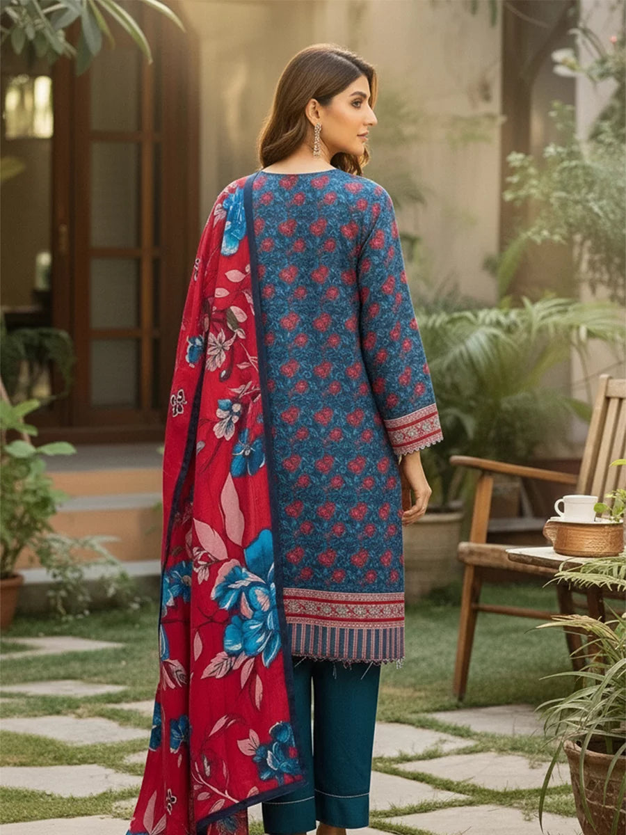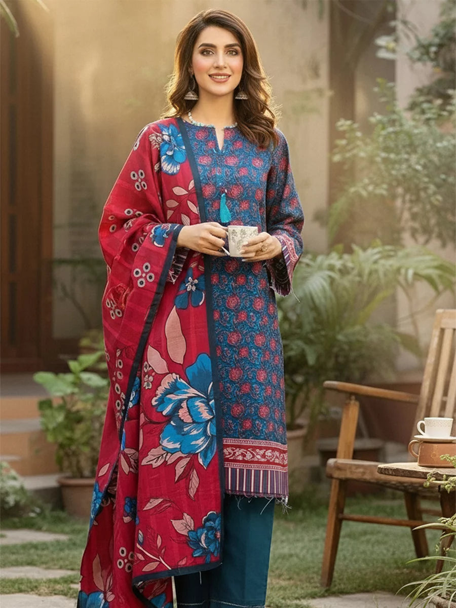 Elegant 3-piece khaddar suit featuring a beautifully printed khaddar shirt, printed khaddar dupatta, and a Plain trouser. Crafted from soft winter khaddar fabric, this outfit combines comfort with timeless floral charm, perfect for everyday elegance and seasonal style.