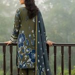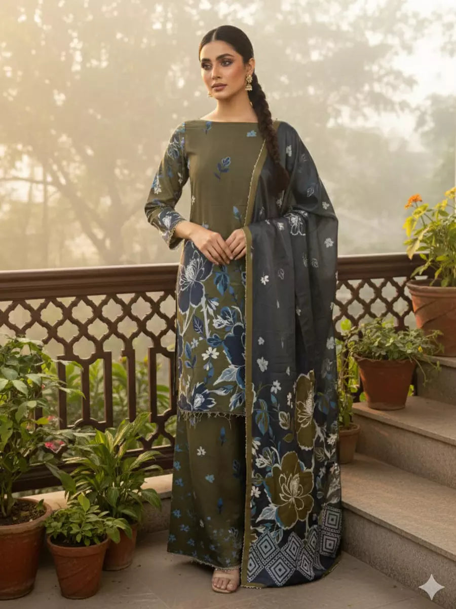 Elegant Khaddar 3-Piece Suit featuring a beautifully printed shirt, with khaddar printed shawl, and a khaddar printed trouser. Crafted for both comfort and style, this outfit is perfect for a chic winter look with a touch of sophistication.