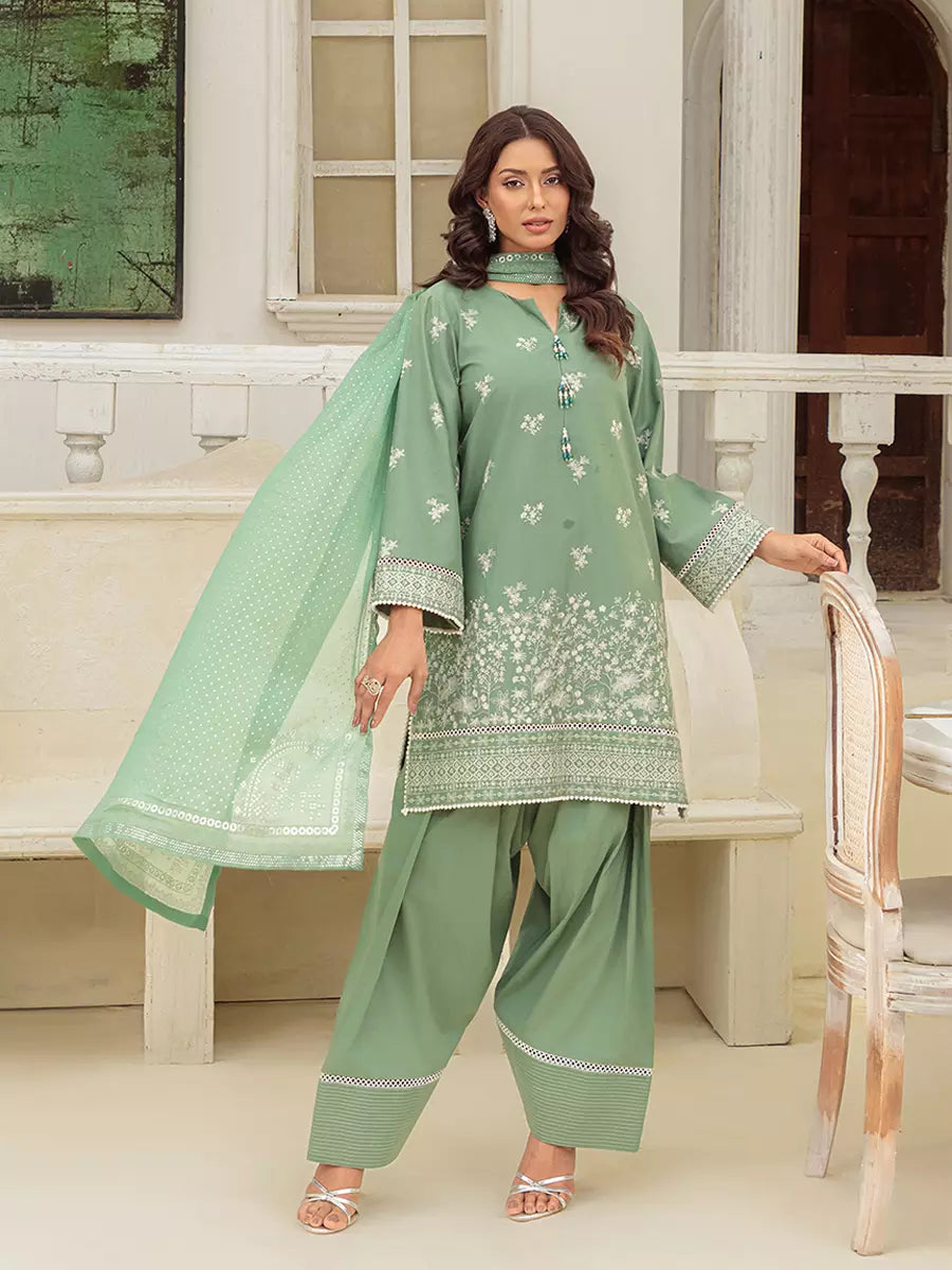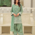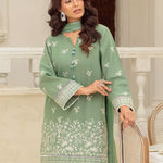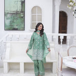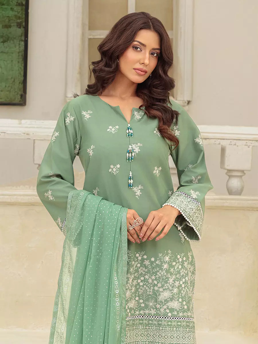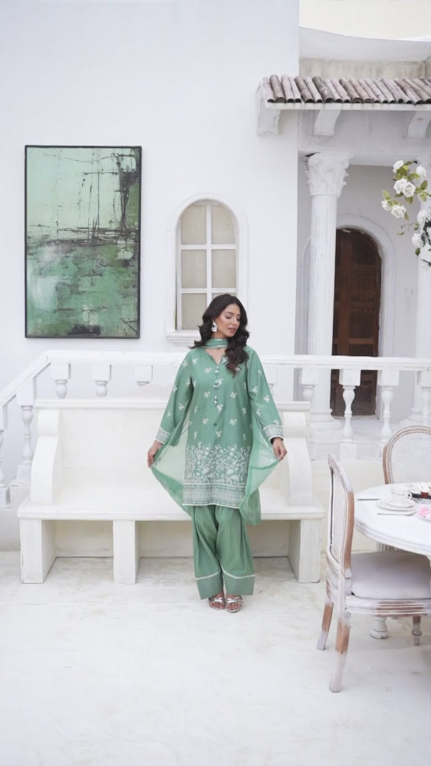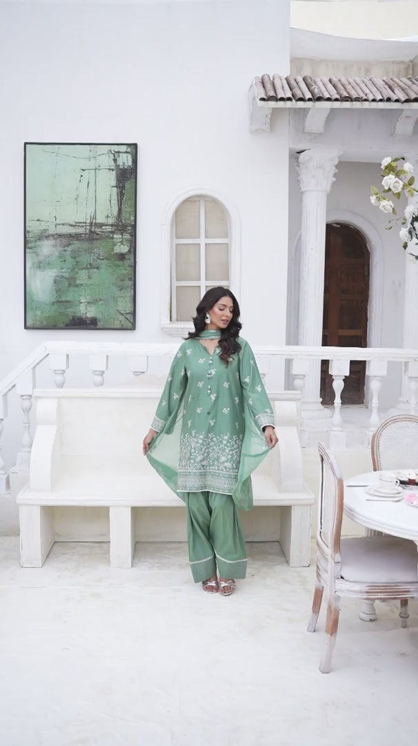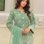 A stylish outfit featuring an embroidered Cambric shirt, paired with an chiffon Mukesh dupatta and a plain cambric trouser. Designed to offer comfort and elegance for any occasion, it's a versatile choice for Casual or festive Wear.