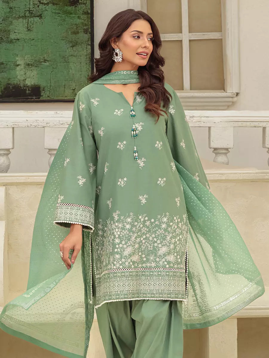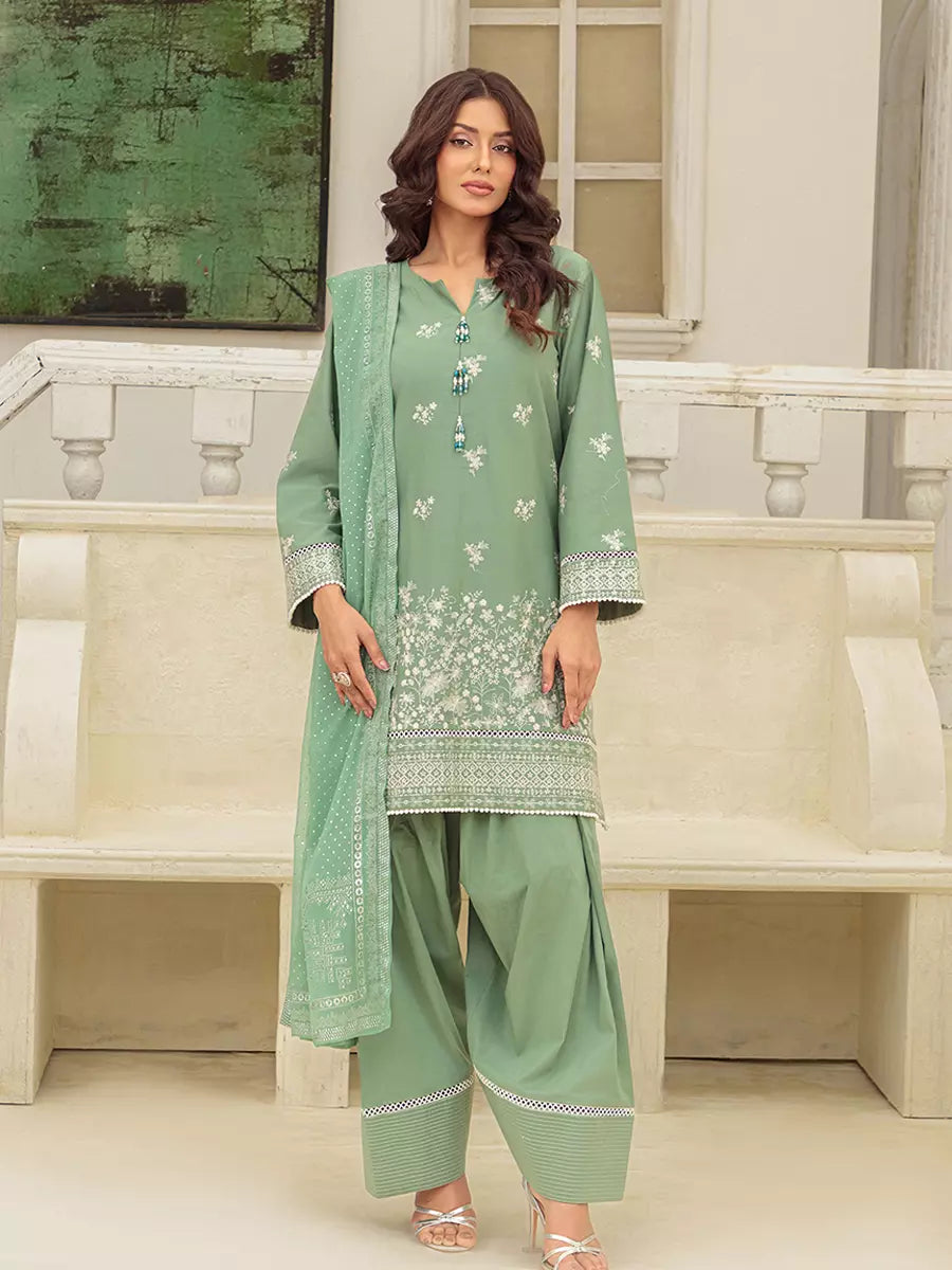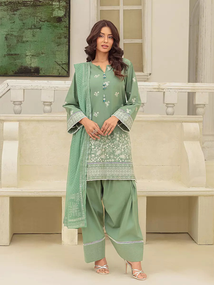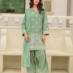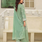 A stylish outfit featuring an embroidered Cambric shirt, paired with an chiffon Mukesh dupatta and a plain cambric trouser. Designed to offer comfort and elegance for any occasion, it's a versatile choice for Casual or festive Wear.
