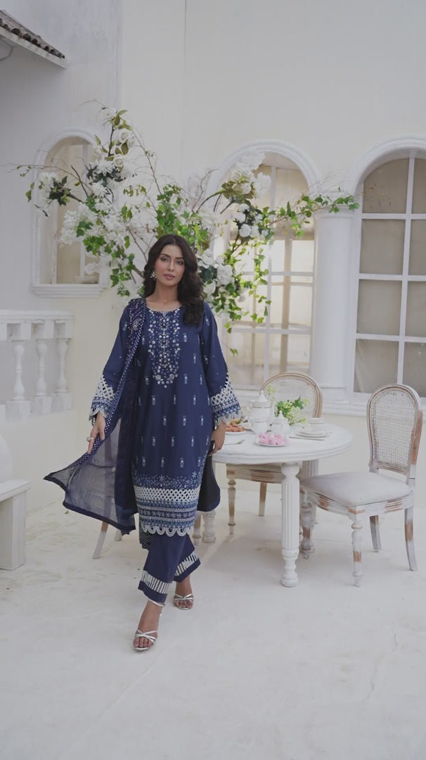 A stylish outfit featuring an embroidered Cambric shirt, paired with an chiffon Mukesh dupatta and a plain cambric trouser. Designed to offer comfort and elegance for any occasion, it's a versatile choice for Casual or festive Wear.