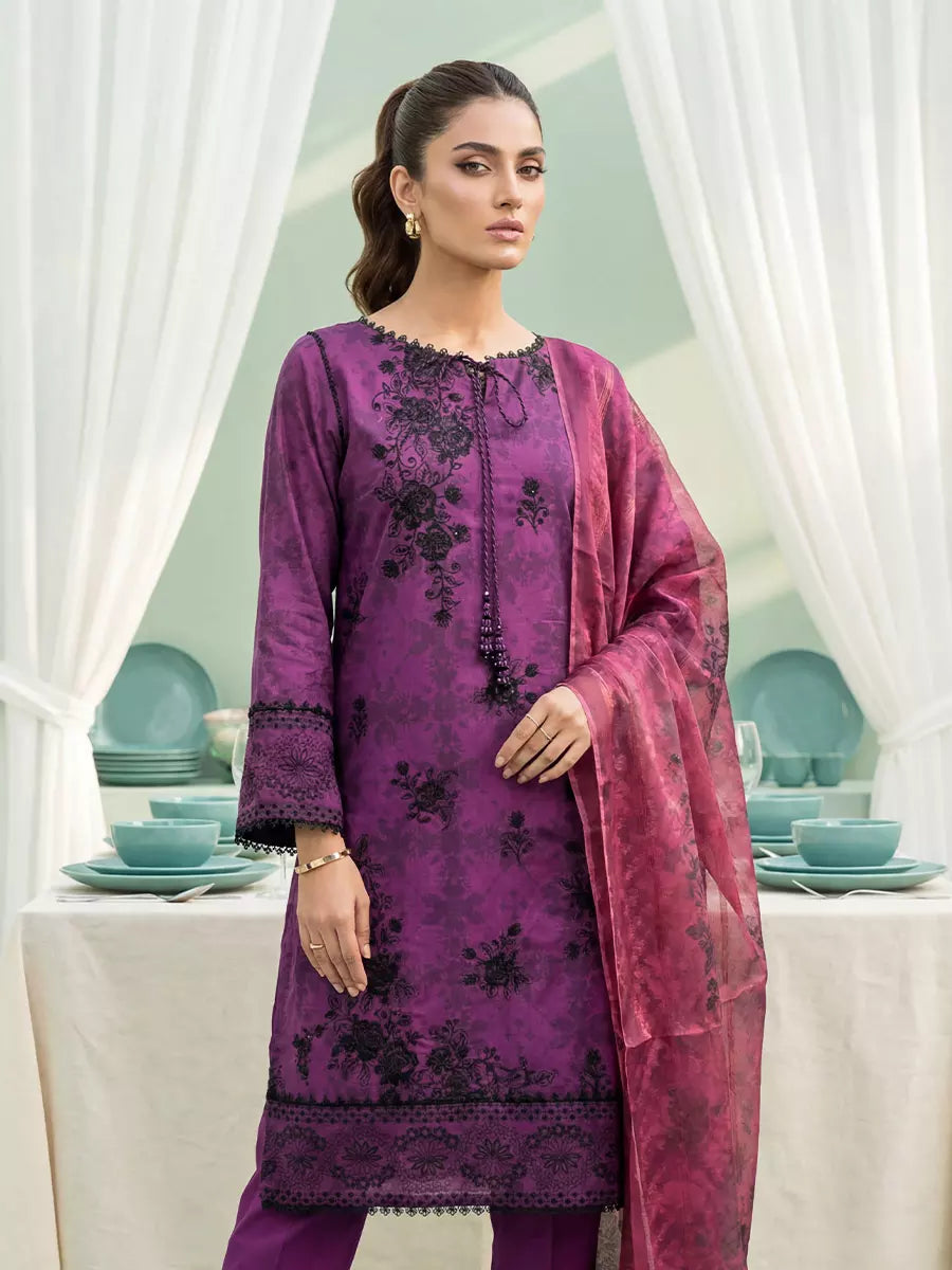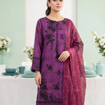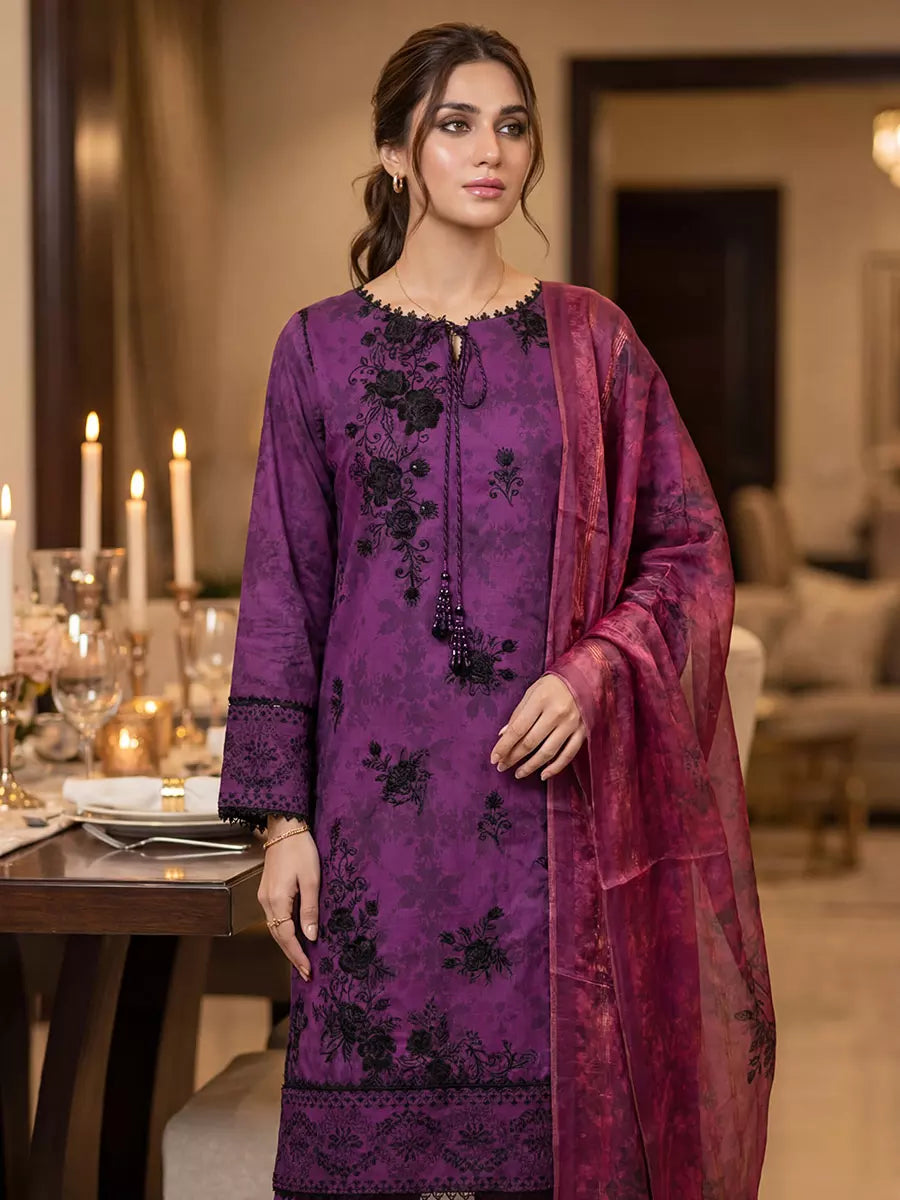 Elevate your festive look with Our 3PC Unstitched Festive Embroidered Suit. It features an embroidered lawn shirt, embroidered dupatta, and dyed cambric trousers, crafted with quality fabric and elegant detailing, perfect for festive and special occasions.