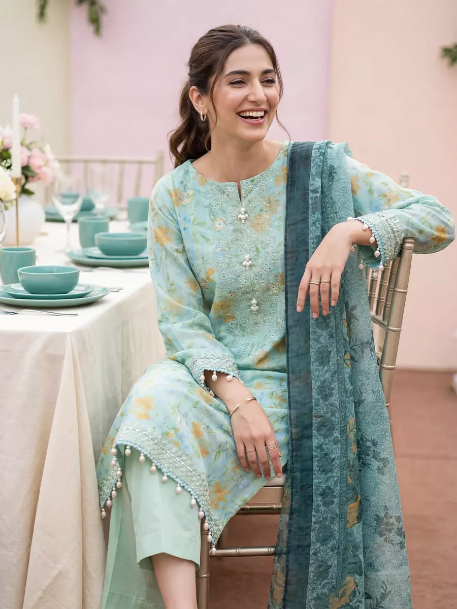 Elevate your festive look with Our 3PC Unstitched Festive Embroidered Suit. It features an embroidered lawn shirt, embroidered dupatta, and dyed cambric trousers, crafted with quality fabric and elegant detailing, perfect for festive and special occasions.