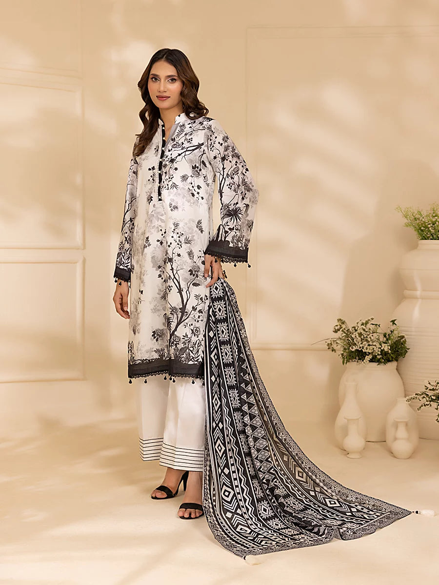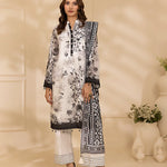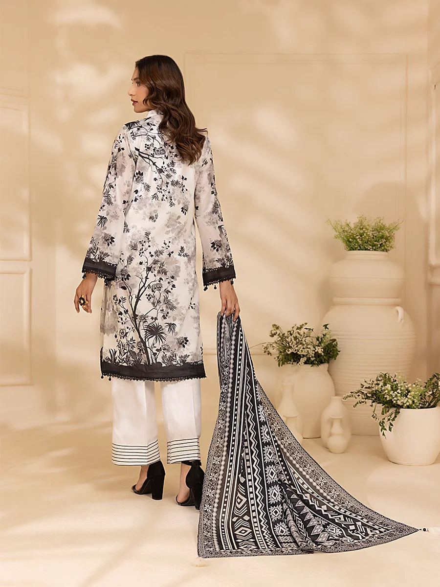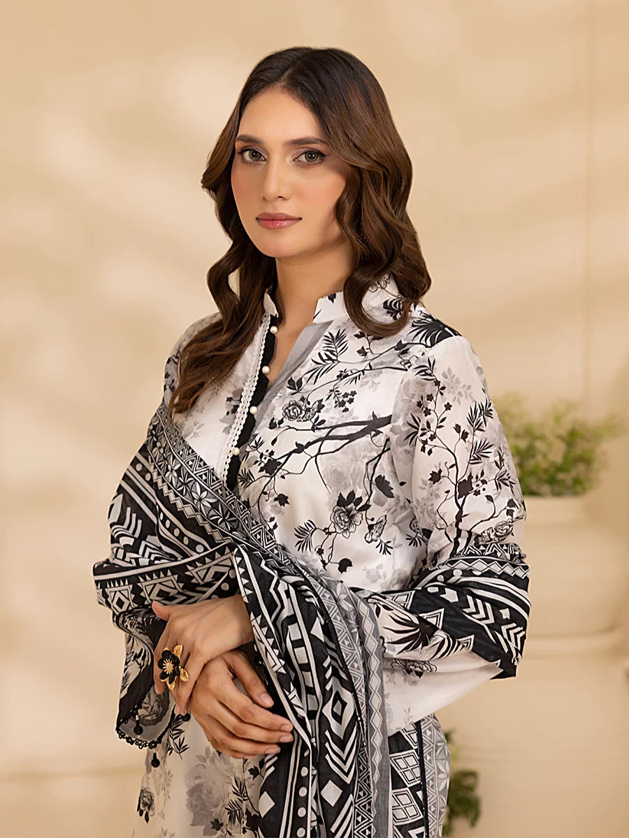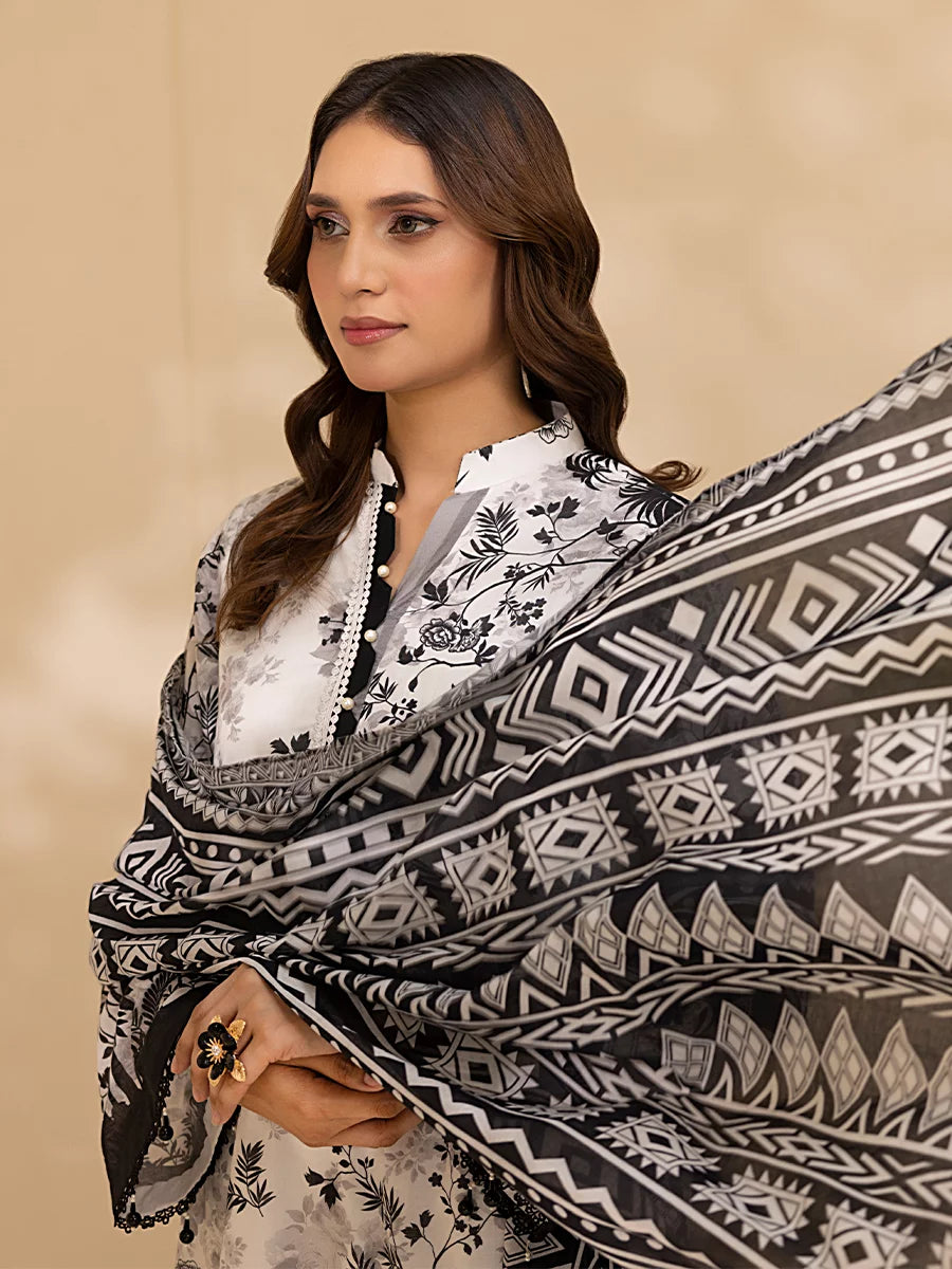 Style up your wardrobe with 3-Piece Unstitched Black & white Lawn Collection. Featuring a vibrant Lawn printed shirt, cambric dyed trouser, and a beautifully Lawn printed dupatta.
