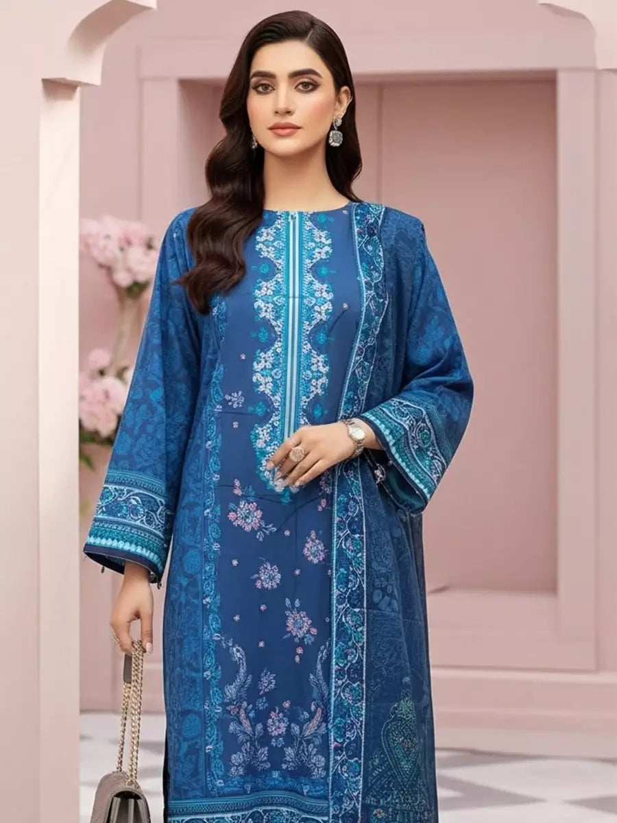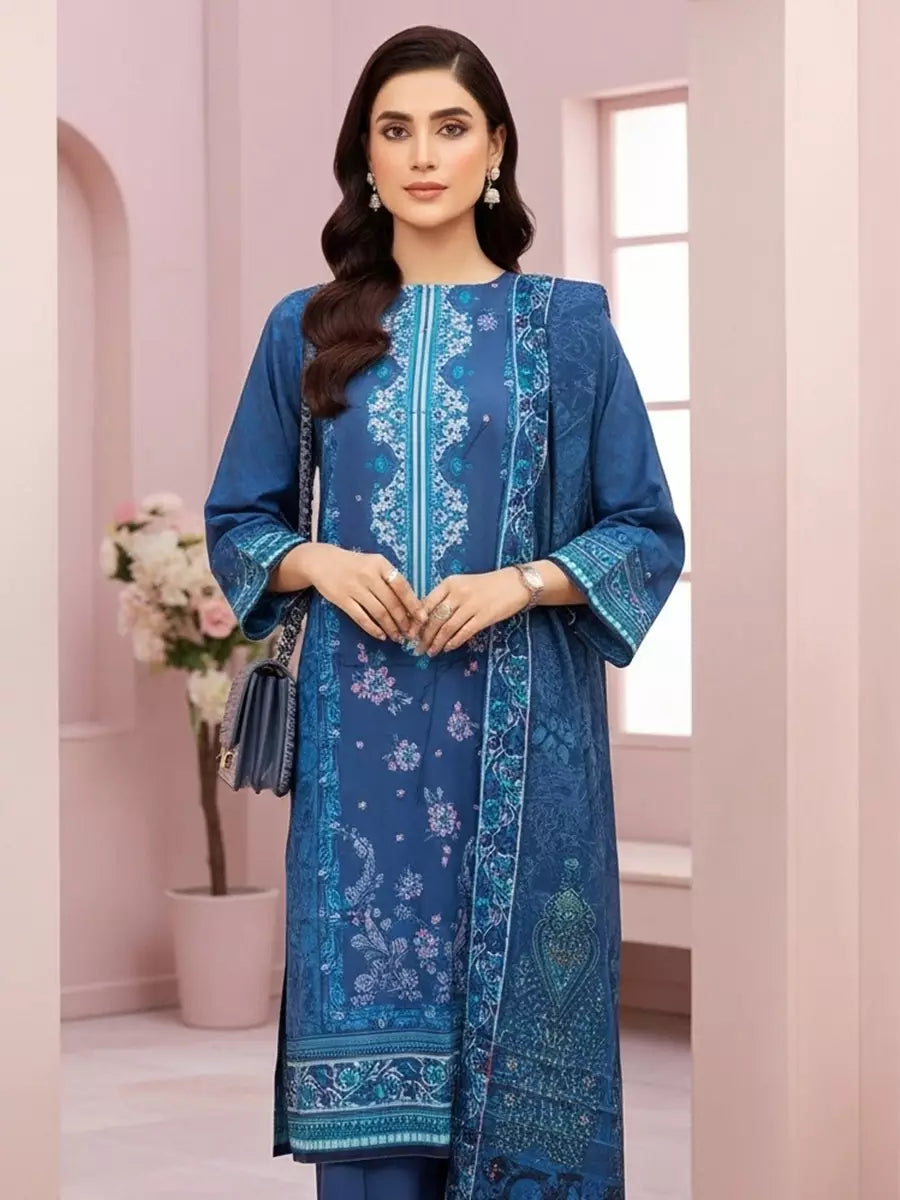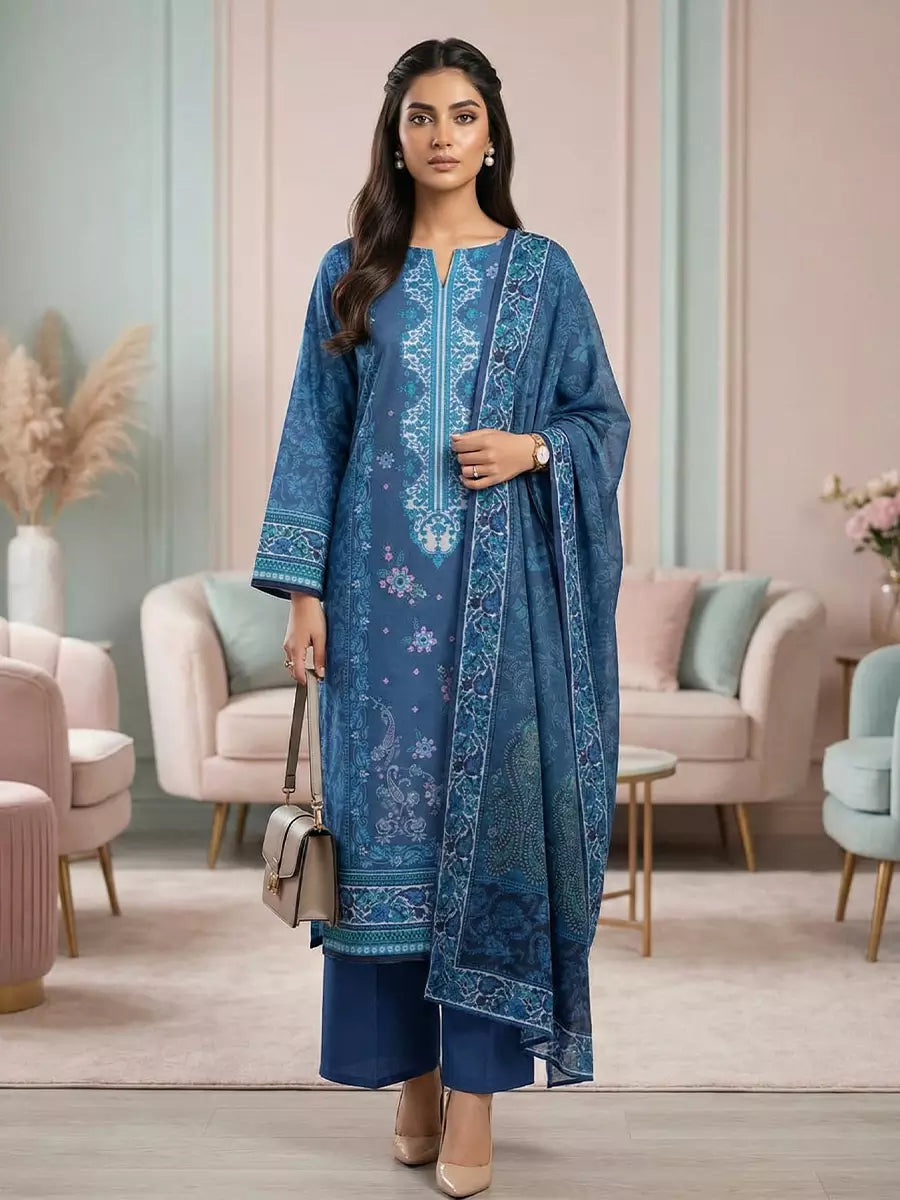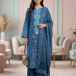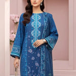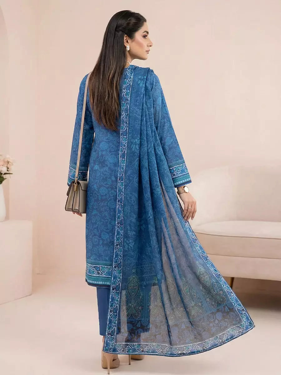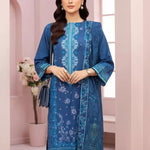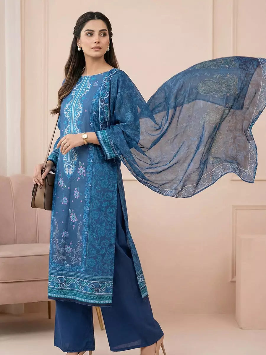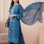 A beautiful 3PC unstitched suit with a printed lawn shirt, printed lawn dupatta, and dyed cambric trouser, designed for a fresh and elegant daily look.