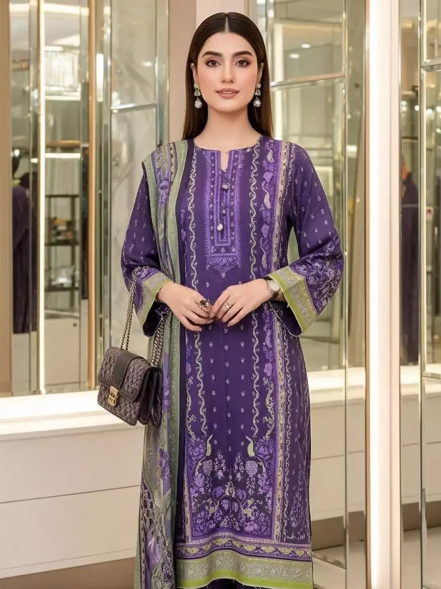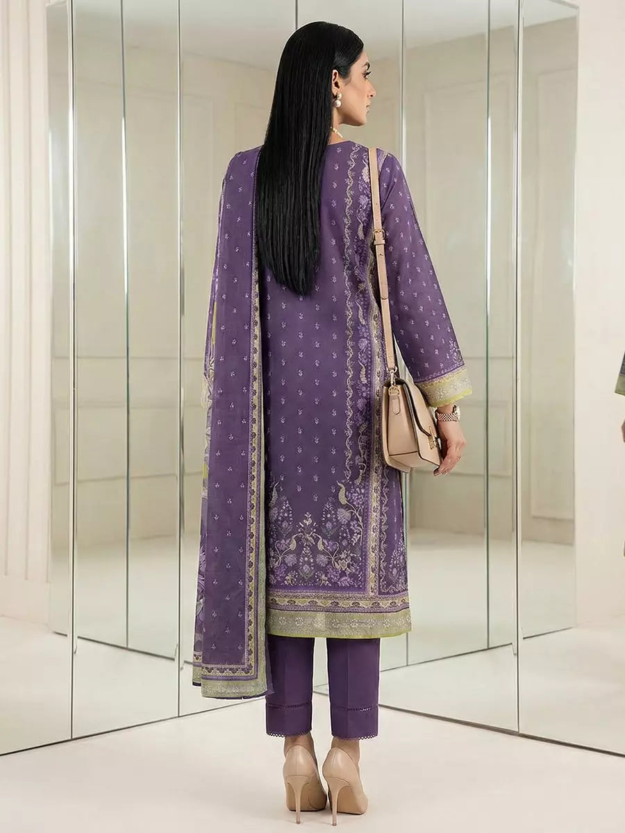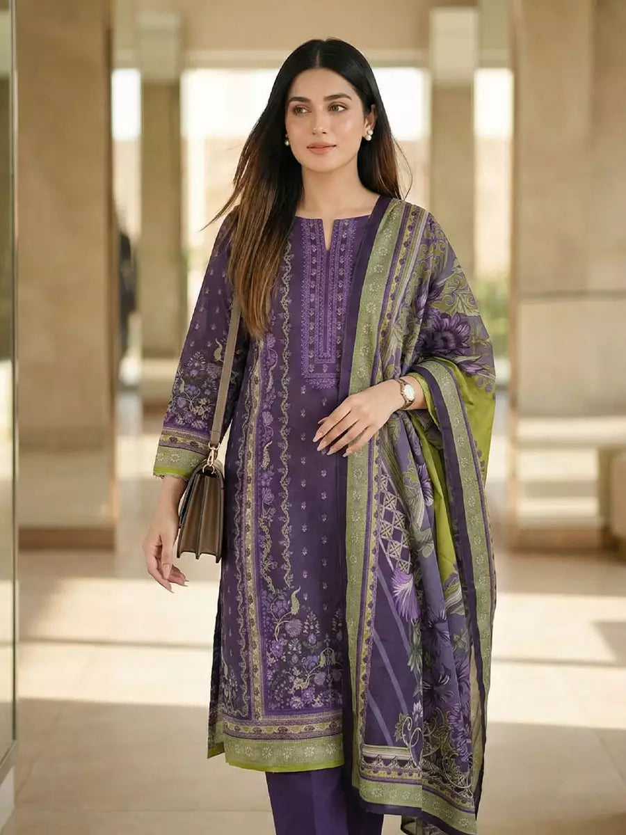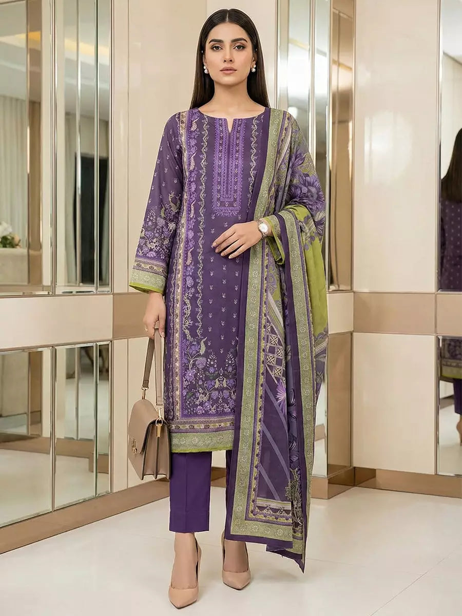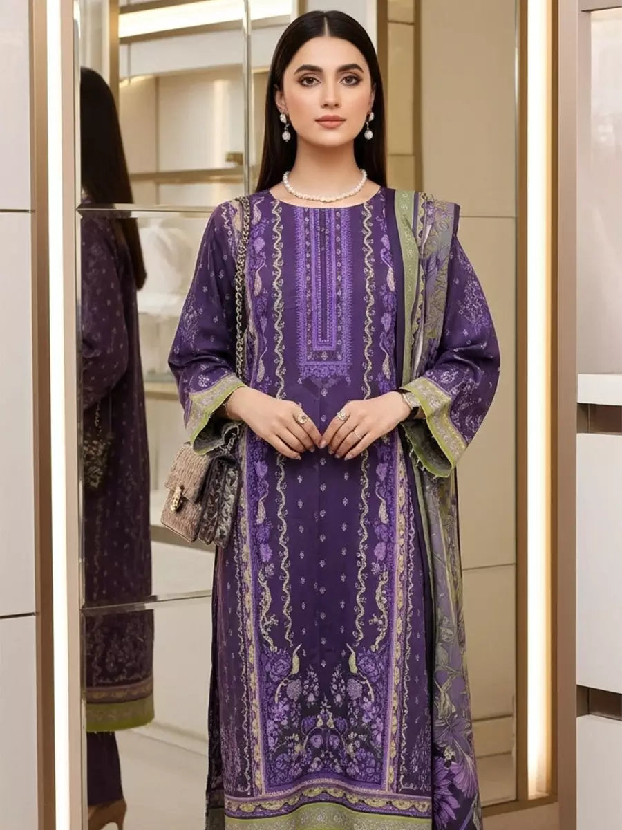 A beautiful 3PC unstitched suit with a printed lawn shirt, printed lawn dupatta, and dyed cambric trouser, designed for a fresh and elegant daily look.