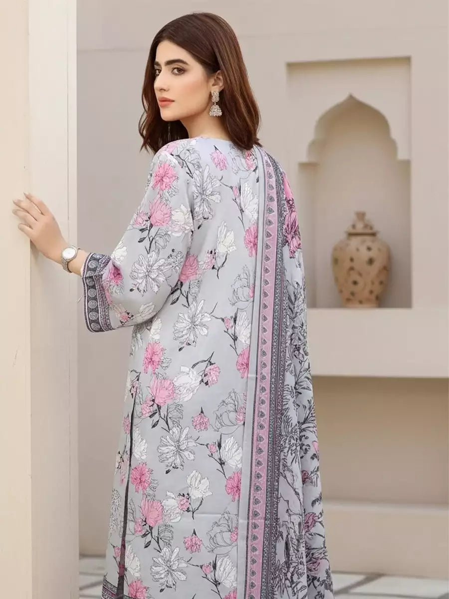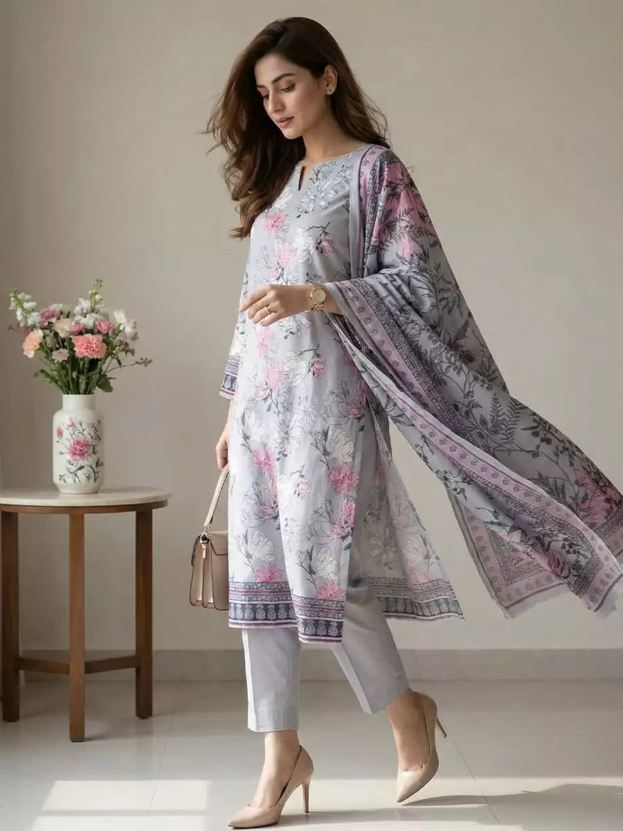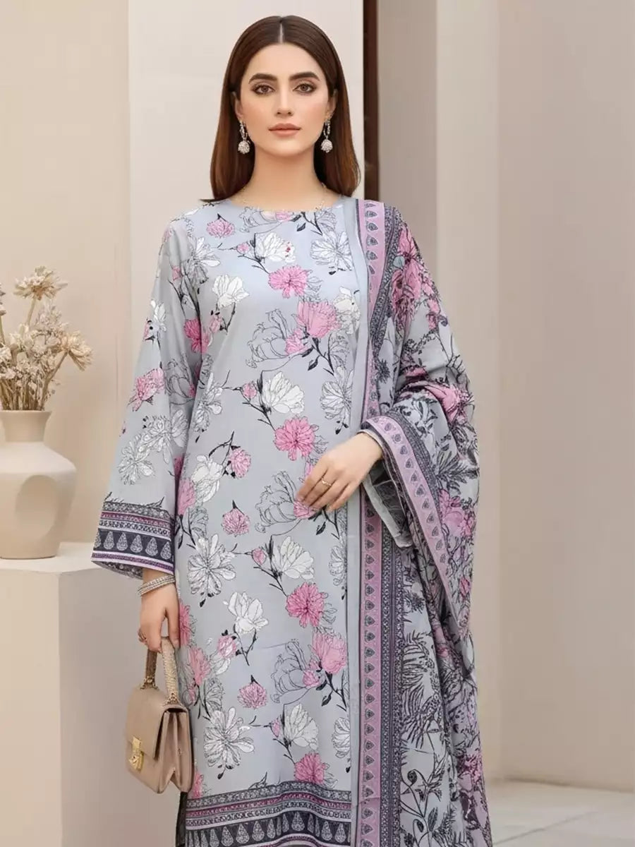 A beautiful 3PC unstitched suit with a printed lawn shirt, printed lawn dupatta, and dyed cambric trouser, designed for a fresh and elegant daily look.