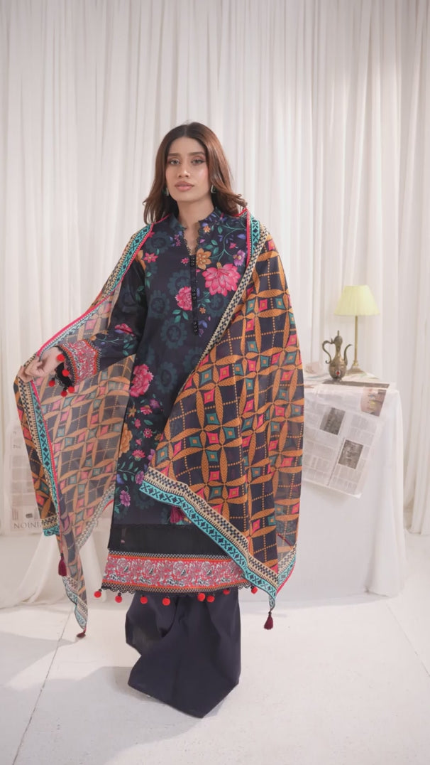 Brighten up your wardrobe with 3-Piece Unstitched Lawn Collection. Featuring a vibrant printed shirt, cambric dyed trouser, and a beautifully printed dupatta.