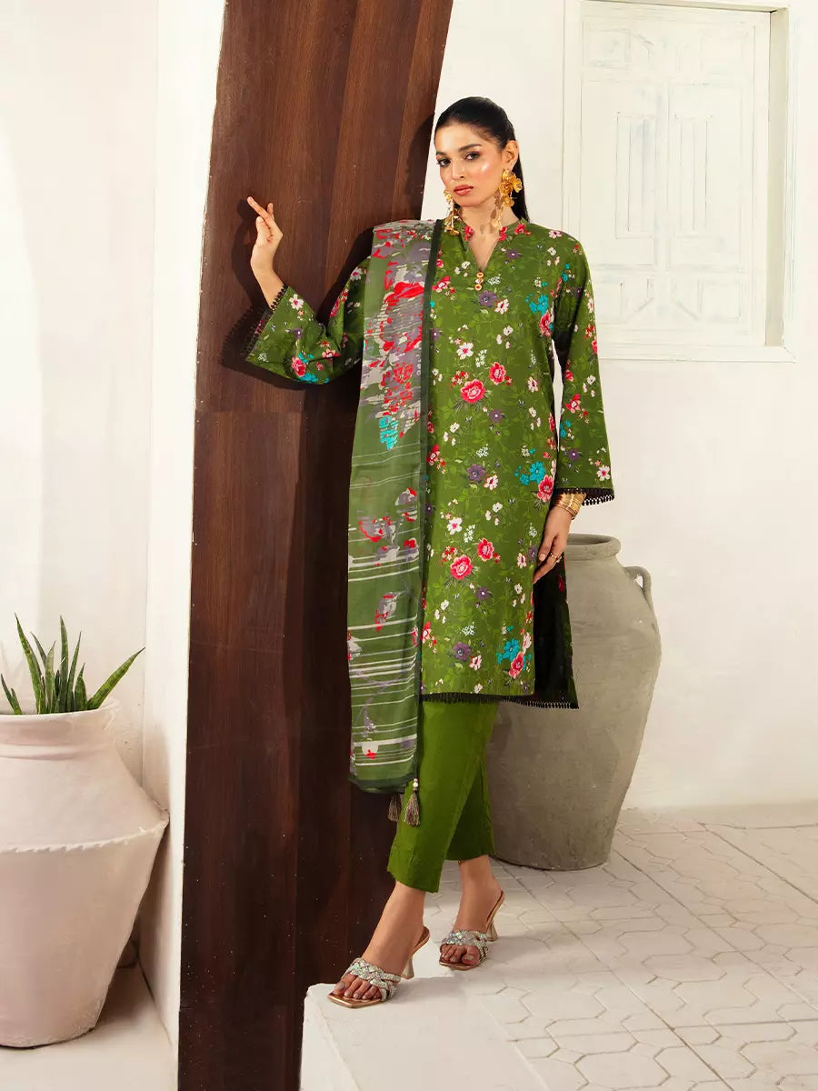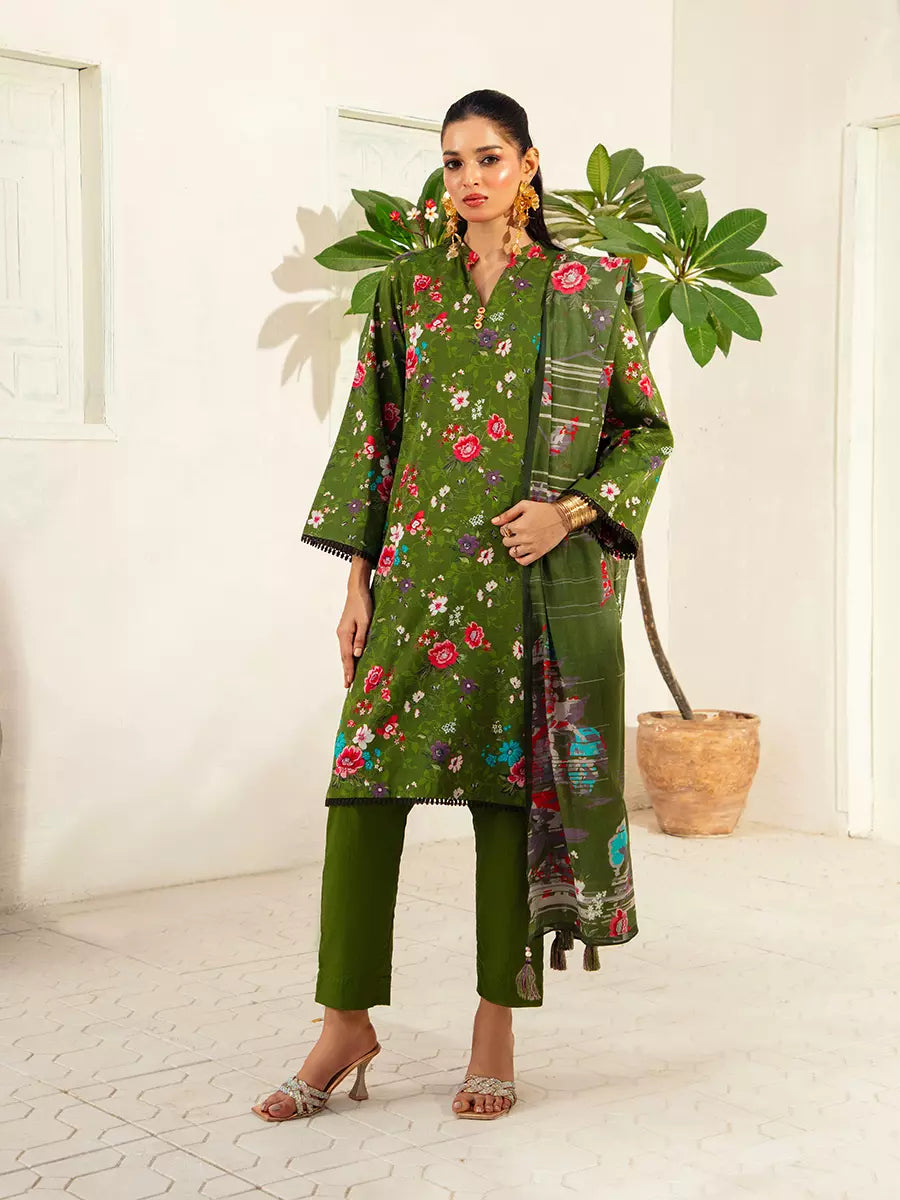 Style up your wardrobe with 3-Piece Unstitched Lawn Collection. Featuring a vibrant Lawn printed shirt, cambric dyed trouser, and a beautifully Lawn printed dupatta.