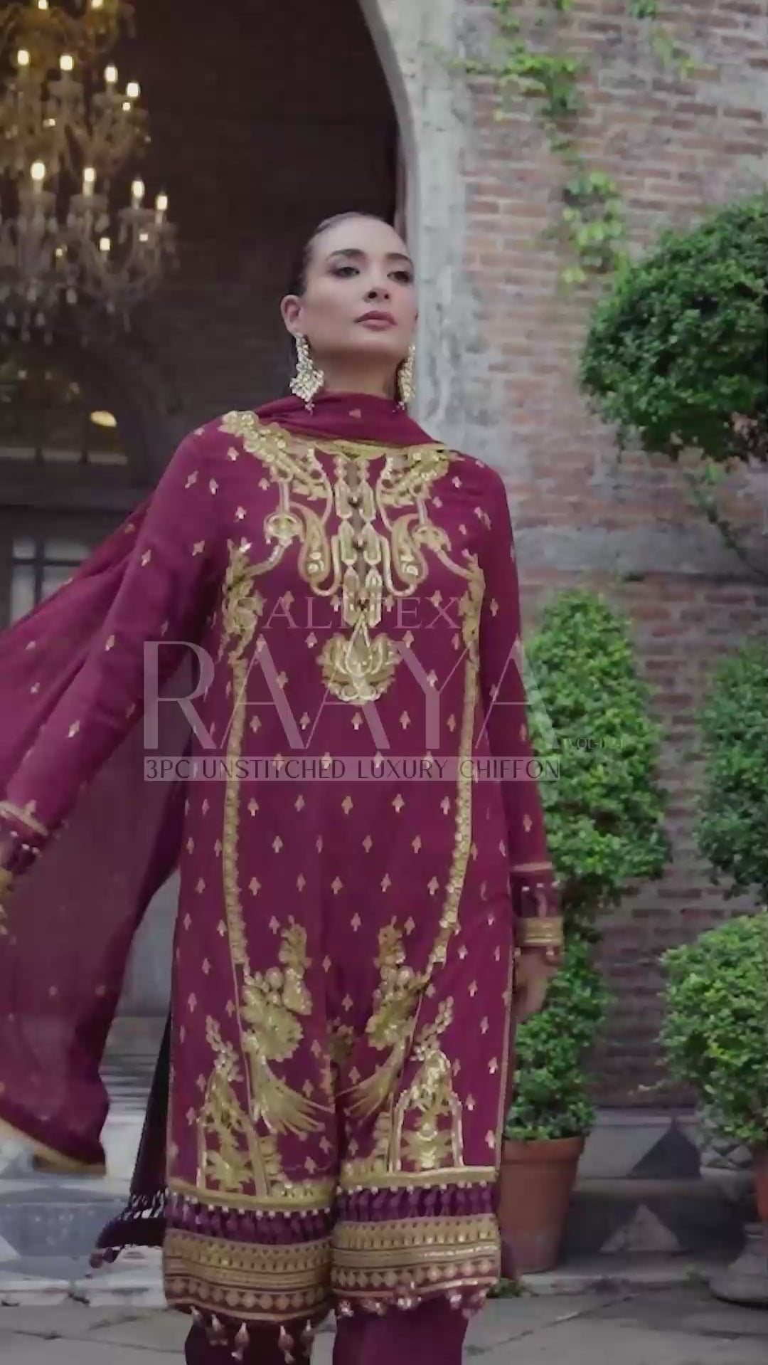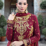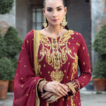 Make a bold statement in this luxurious deep red attire, perfect for elevating your formal wardrobe. Featuring delicate chiffon fabric with intricate embroidery and shimmering sequin details, this ensemble is crafted to perfection for those who appreciate fine craftsmanship. Ideal for weddings and formal occasions, this piece exudes grace and sophistication