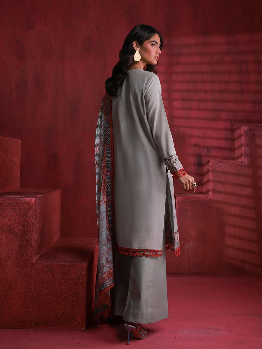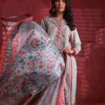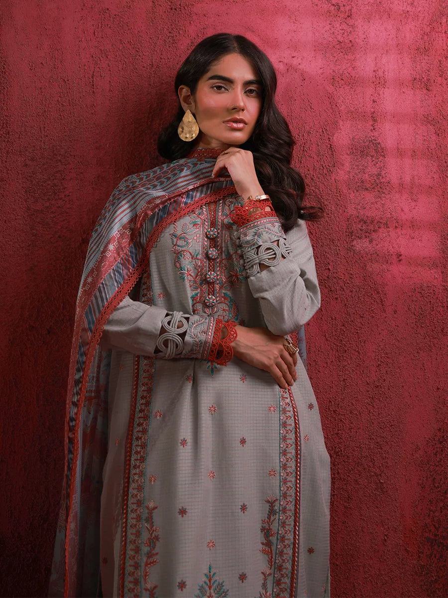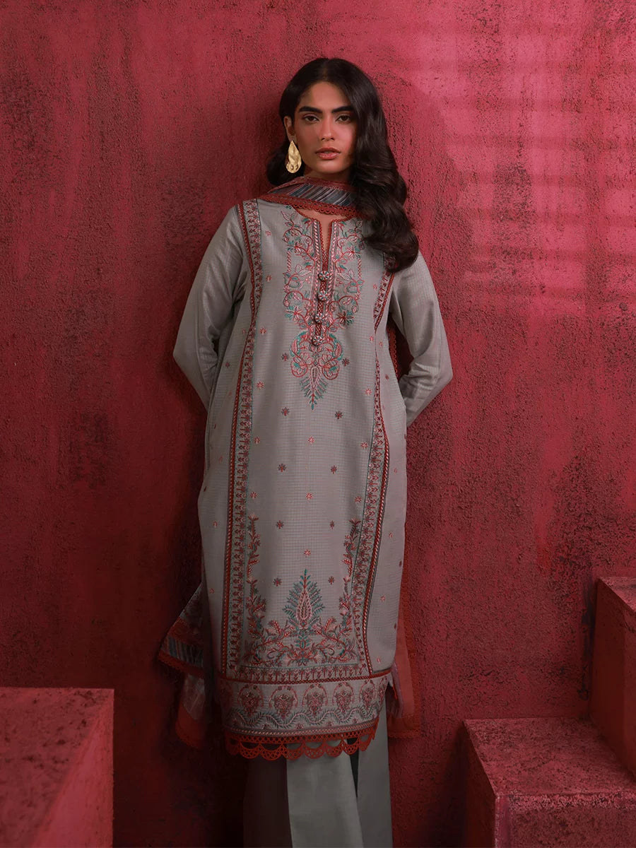 In soft dusty blue, this ensemble whispers of serenity, kissed by the delicate charm of pink embroidery, each stitch a gentle stroke of elegance against a tranquil canvas, creating a vision of timeless beauty