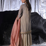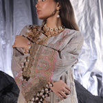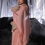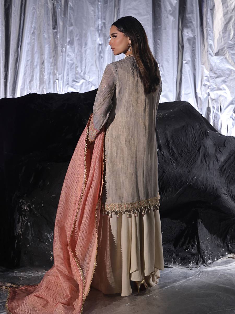 Effortlessly royal: An ice gray ensemble featuring luxurious sheer fabric, adorned with fluorescent pink embroidery and embellished pink details on the dupatta, exuding elegance at every turn