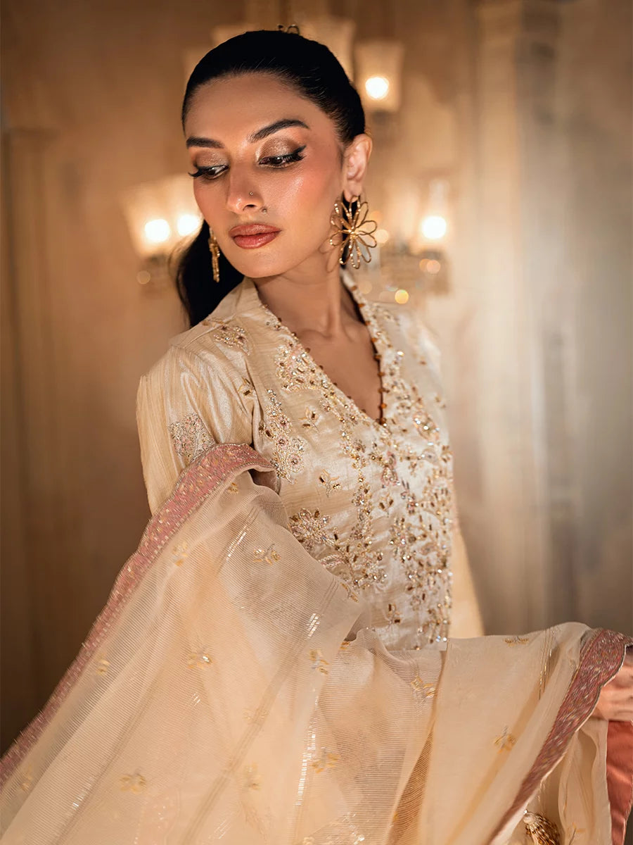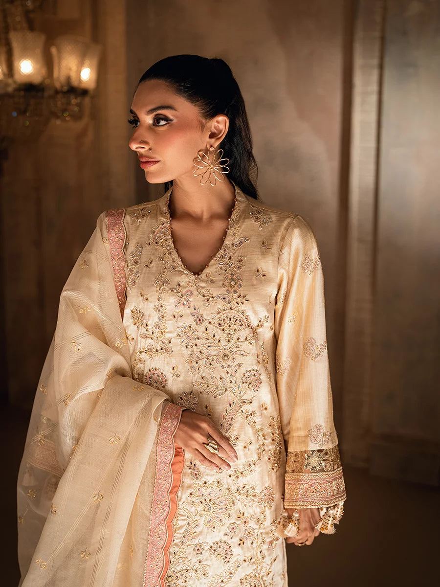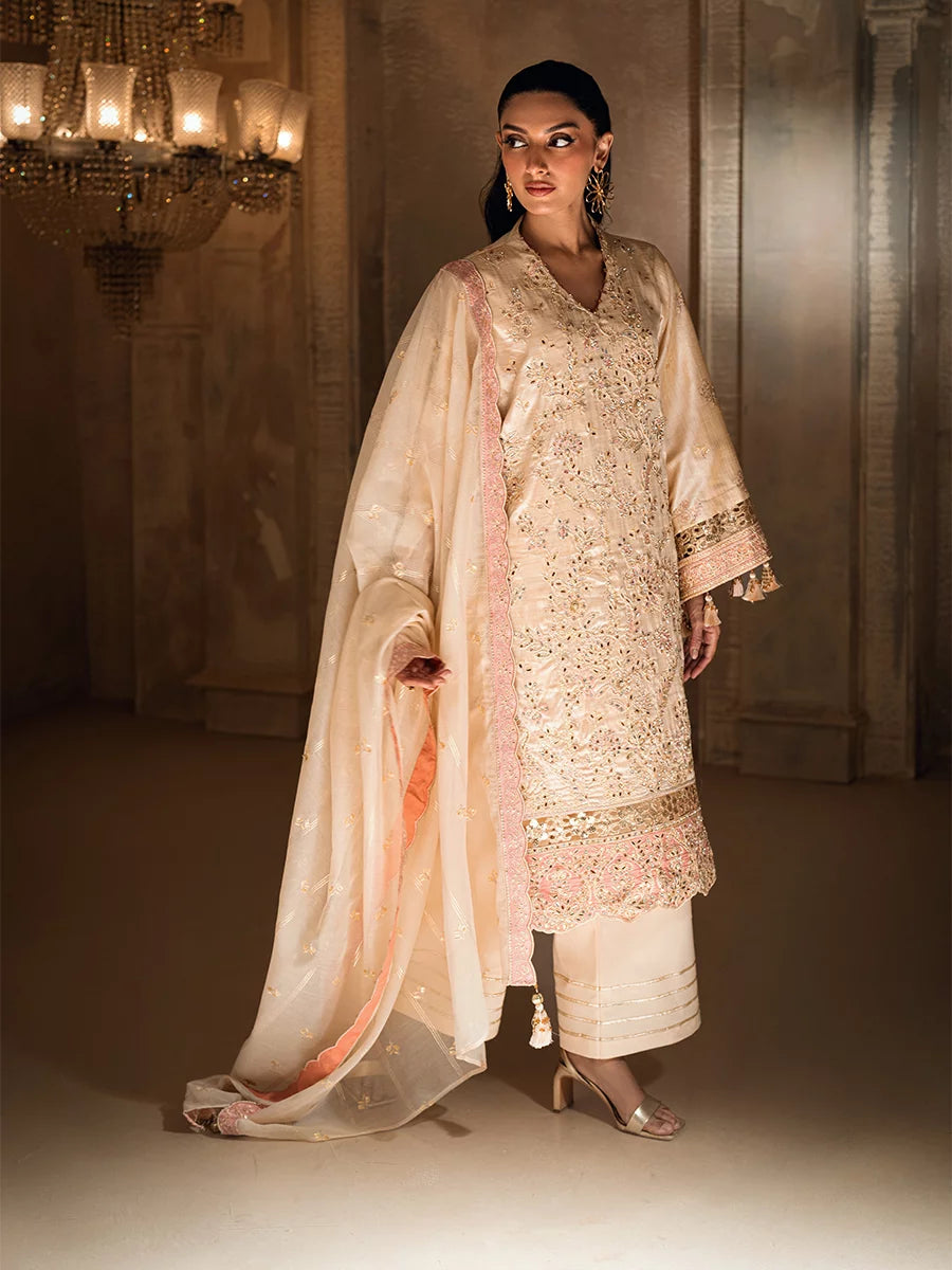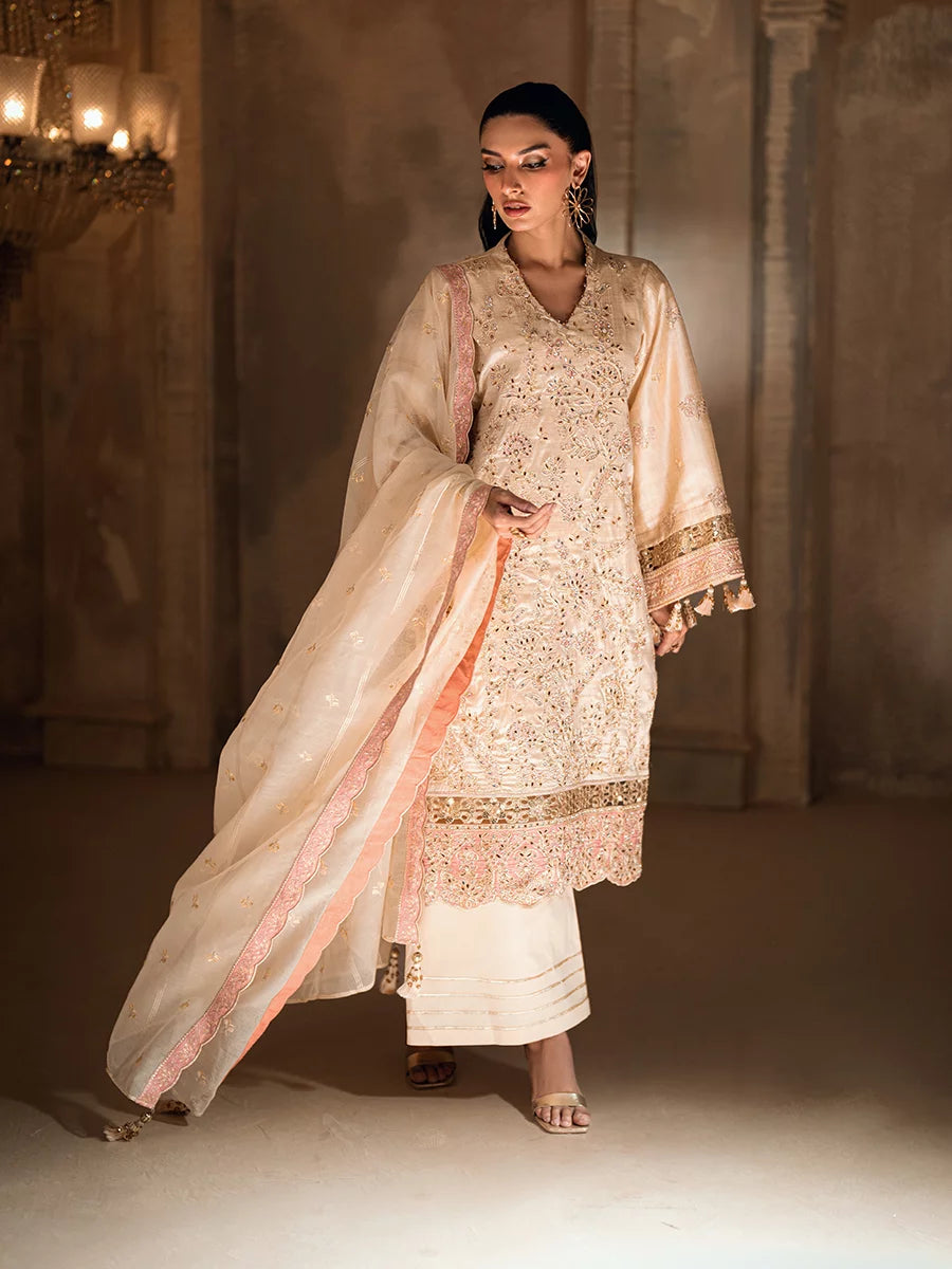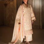 3PC unstitched luxury formal suit features delicate hand-worked details, an elegantly embroidered dupatta, and a premium raw silk trouser. Designed to create a graceful and sophisticated formal look.
