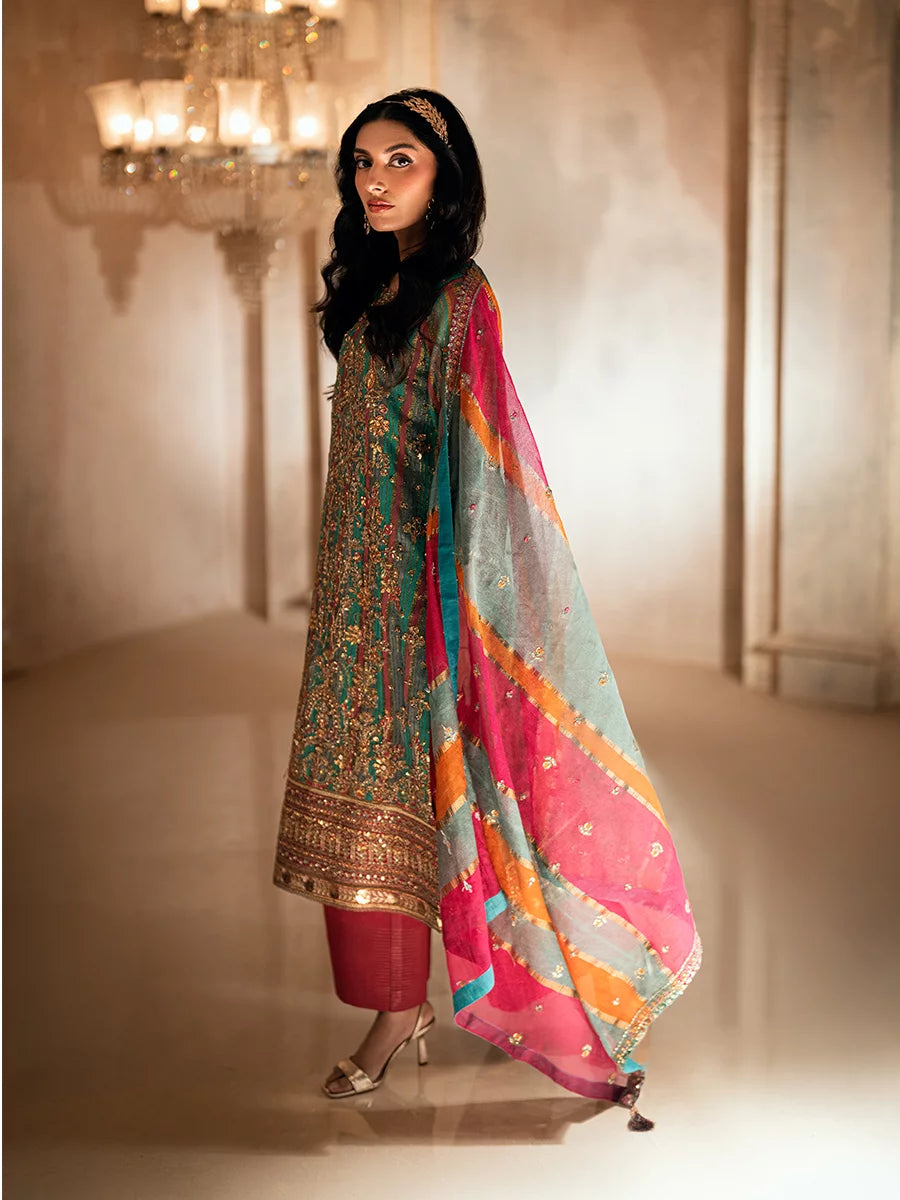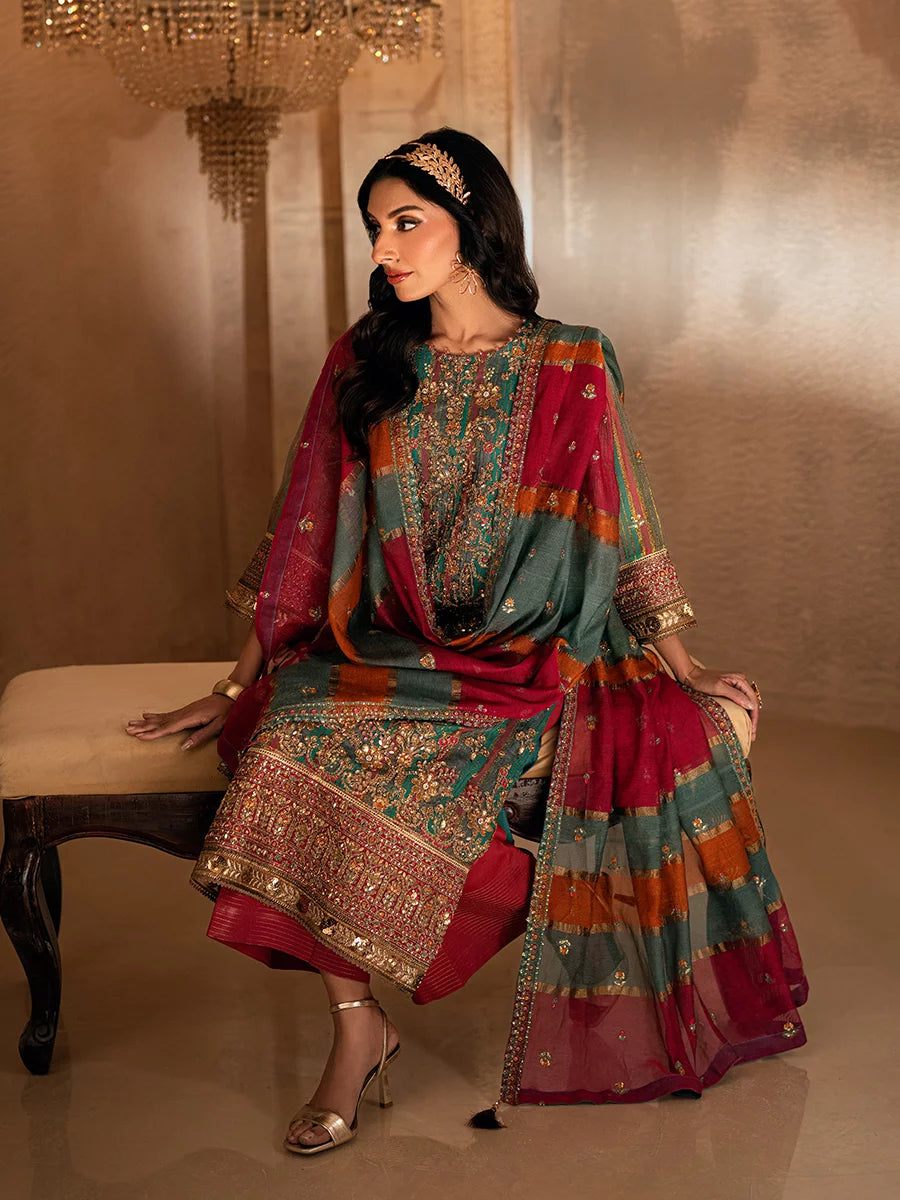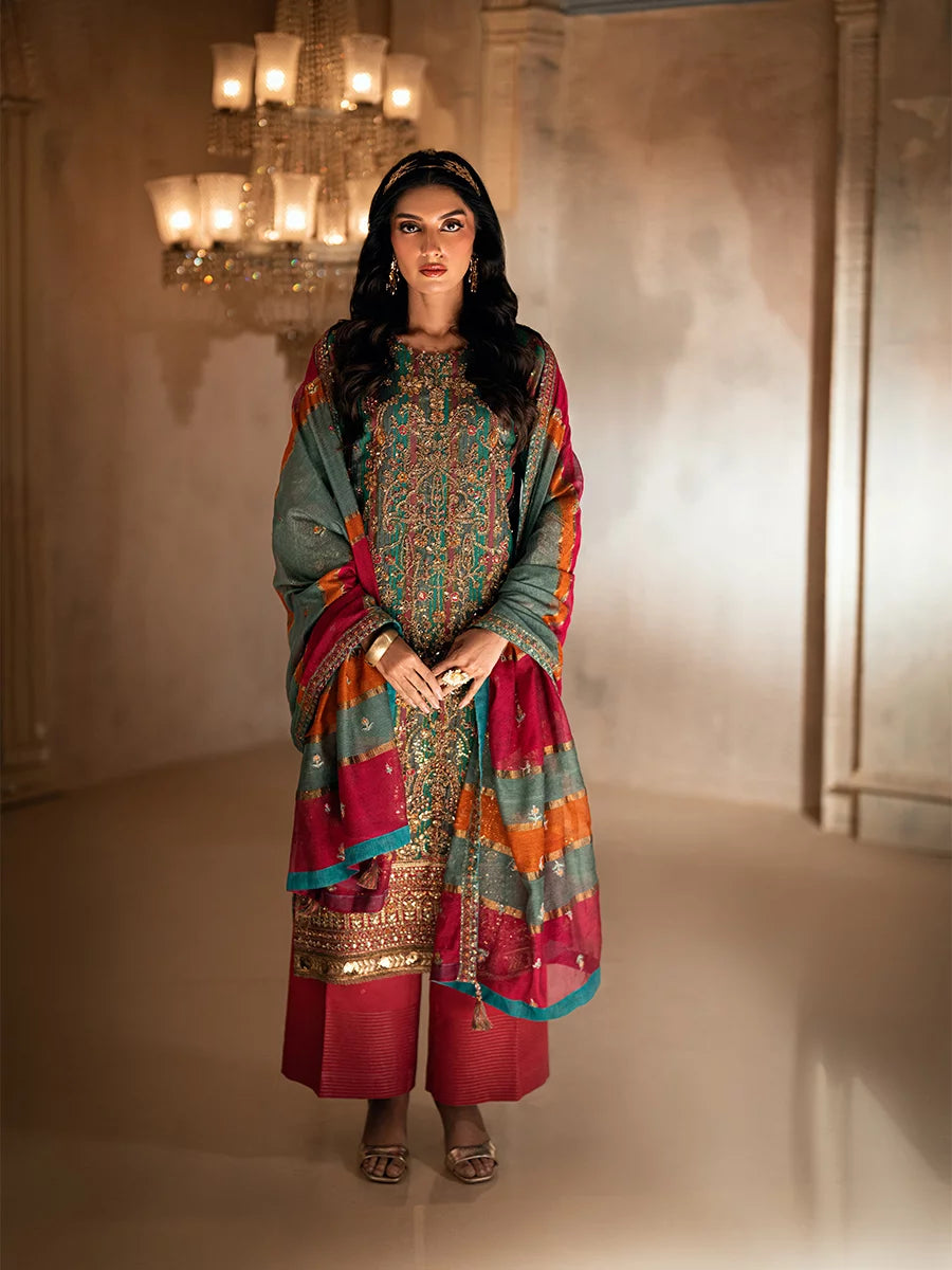 3PC unstitched luxury formal suit features delicate hand-worked details, an elegantly embroidered dupatta, and a premium raw silk trouser. Designed to create a graceful and sophisticated formal look.