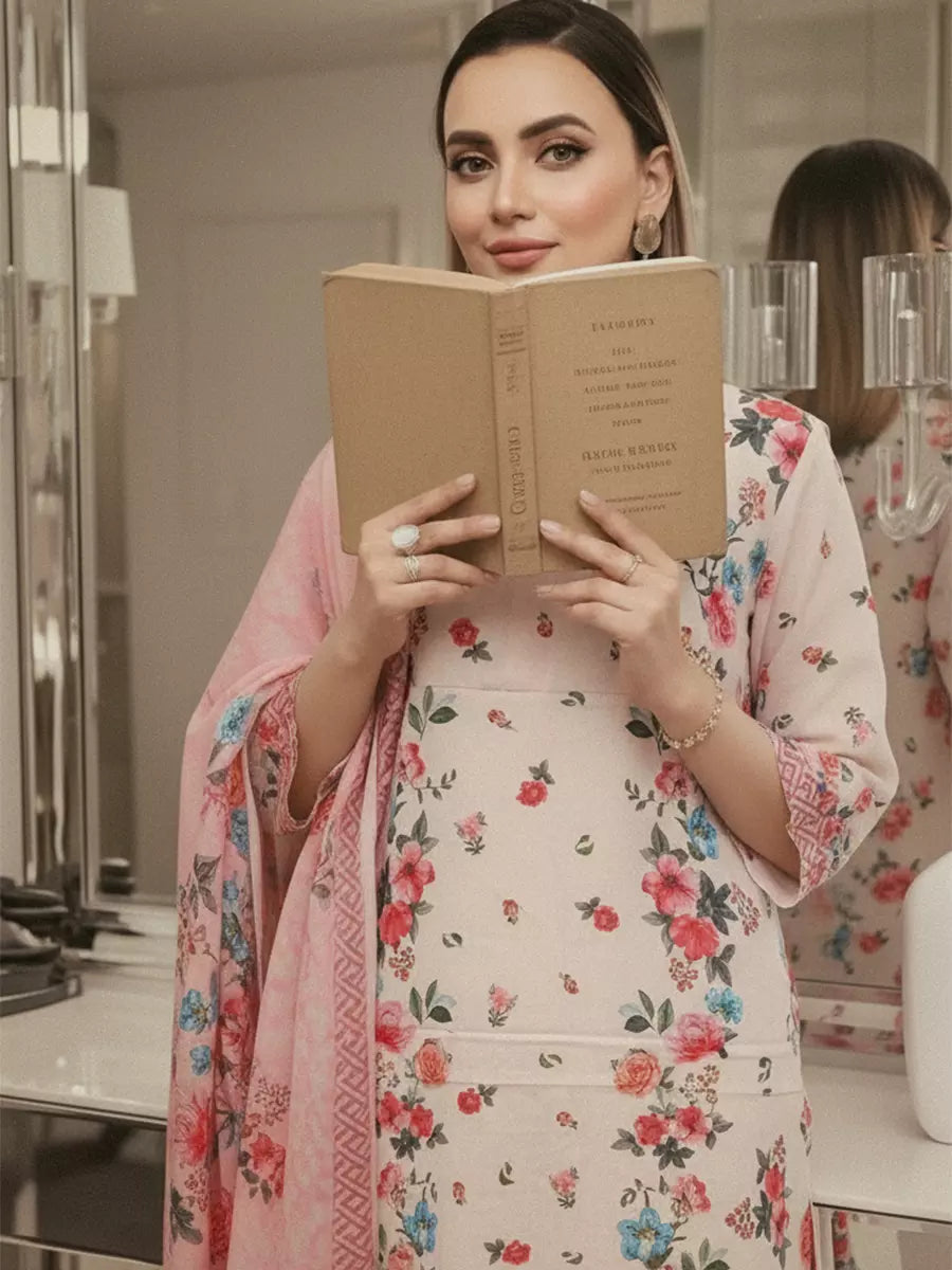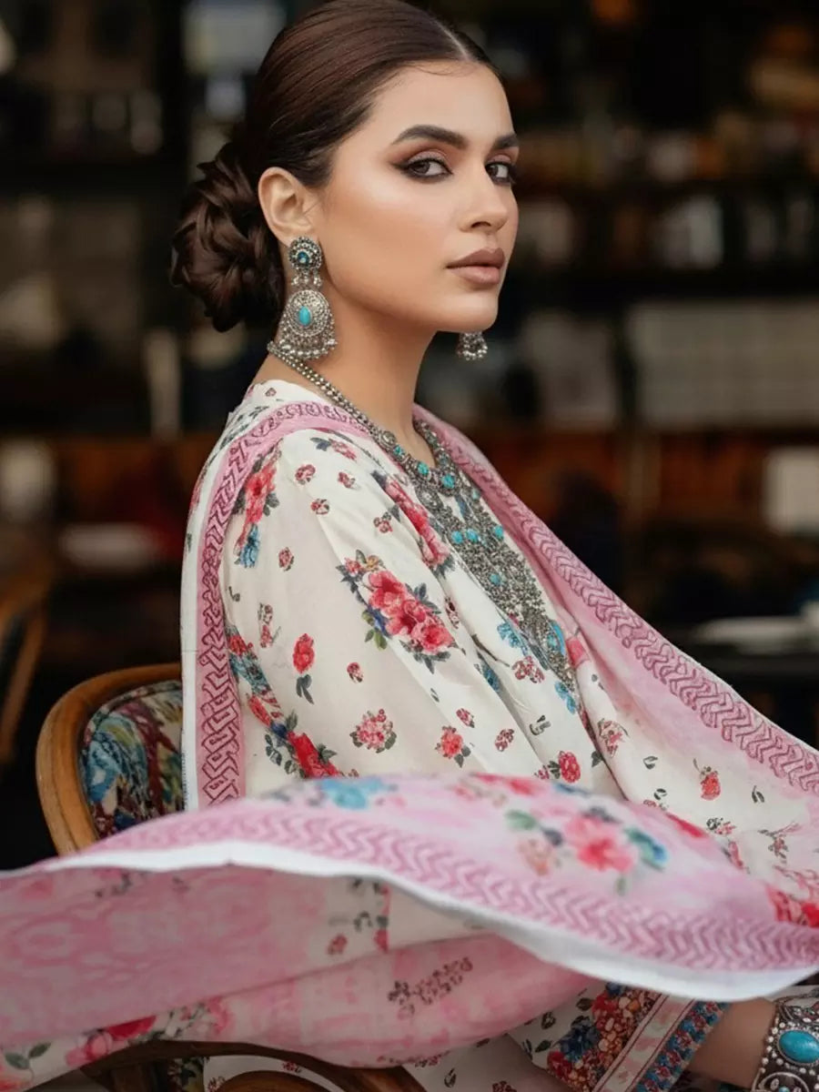 Style up your wardrobe with 3-Piece Unstitched Cambric Collection. Featuring a vibrant Cambric printed shirt, cambric dyed trouser, and a beautifully Lawn printed dupatta.