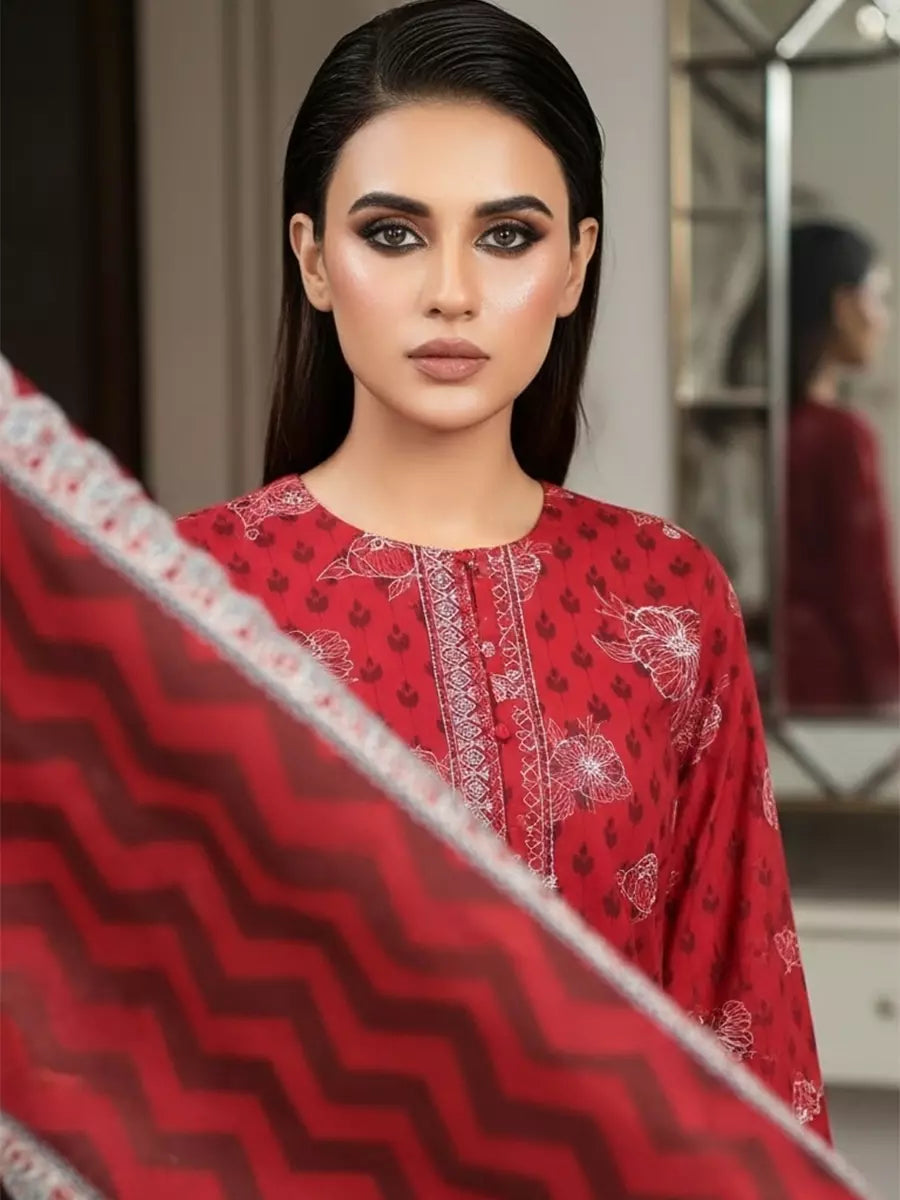 Style up your wardrobe with 3-Piece Unstitched Cambric Collection. Featuring a vibrant Cambric printed shirt, cambric dyed trouser, and a beautifully Lawn printed dupatta.