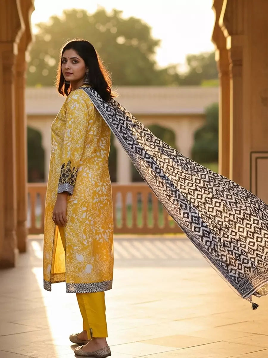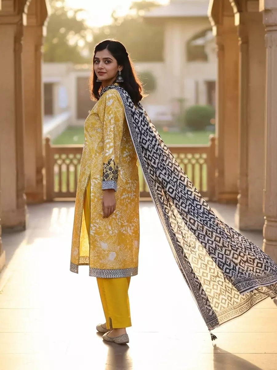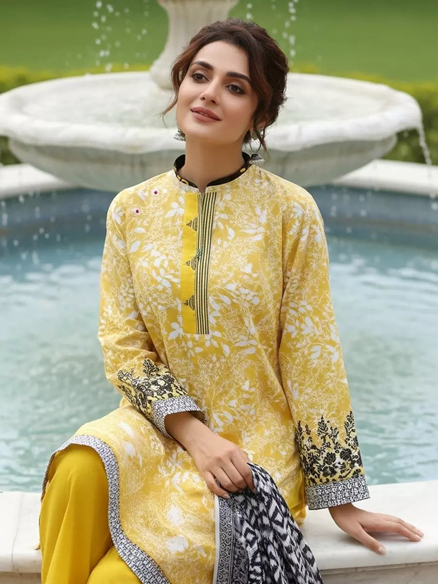 Style up your wardrobe with 3-Piece Unstitched Cambric Collection. Featuring a vibrant Cambric printed shirt, cambric dyed trouser, and a beautifully Lawn printed dupatta.