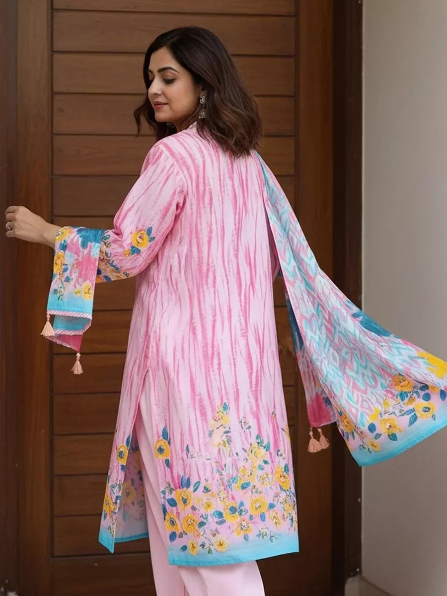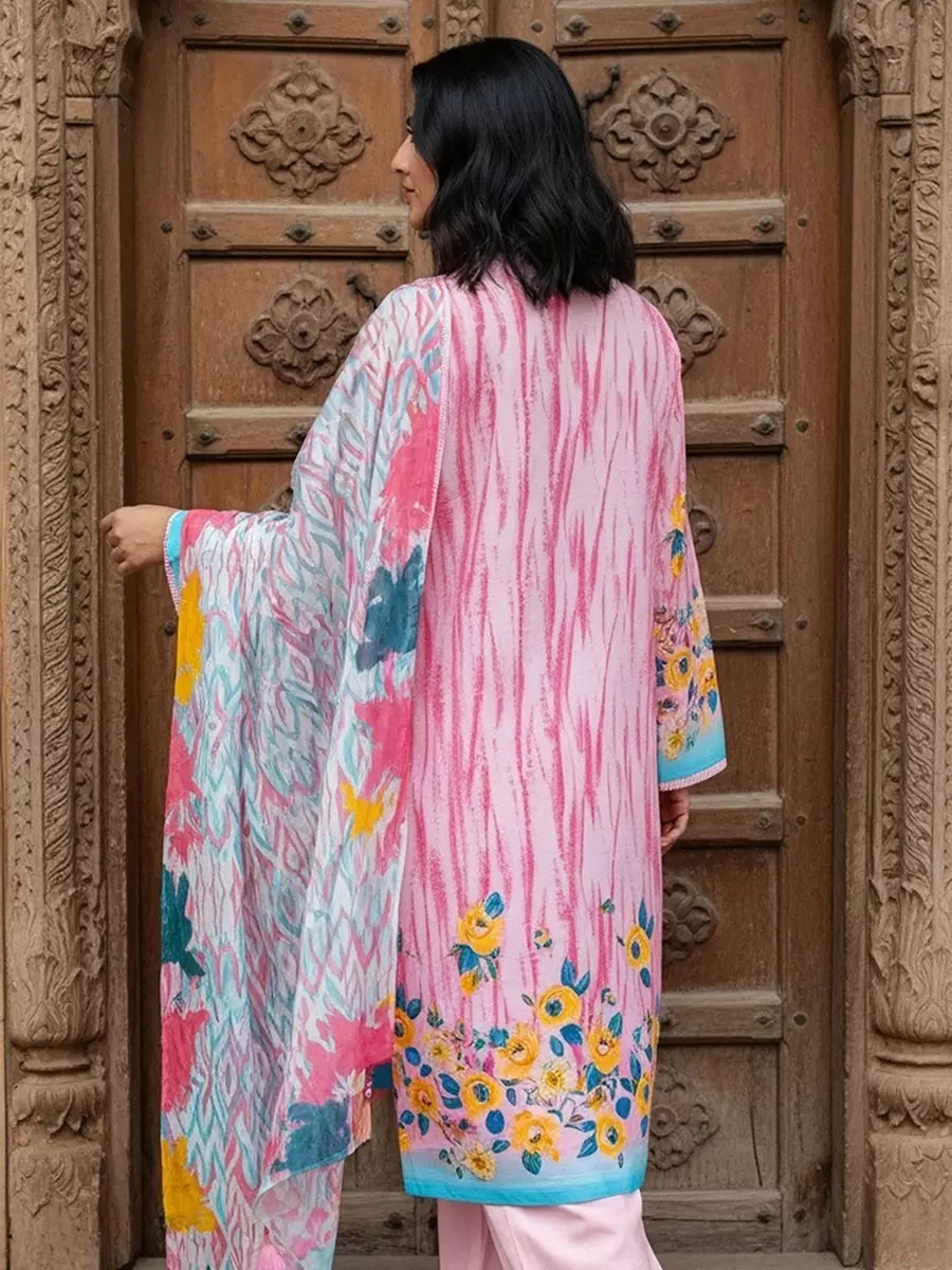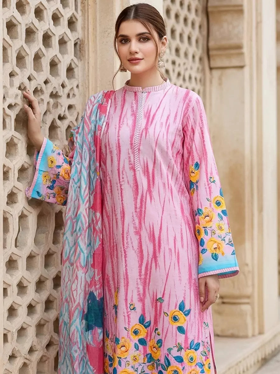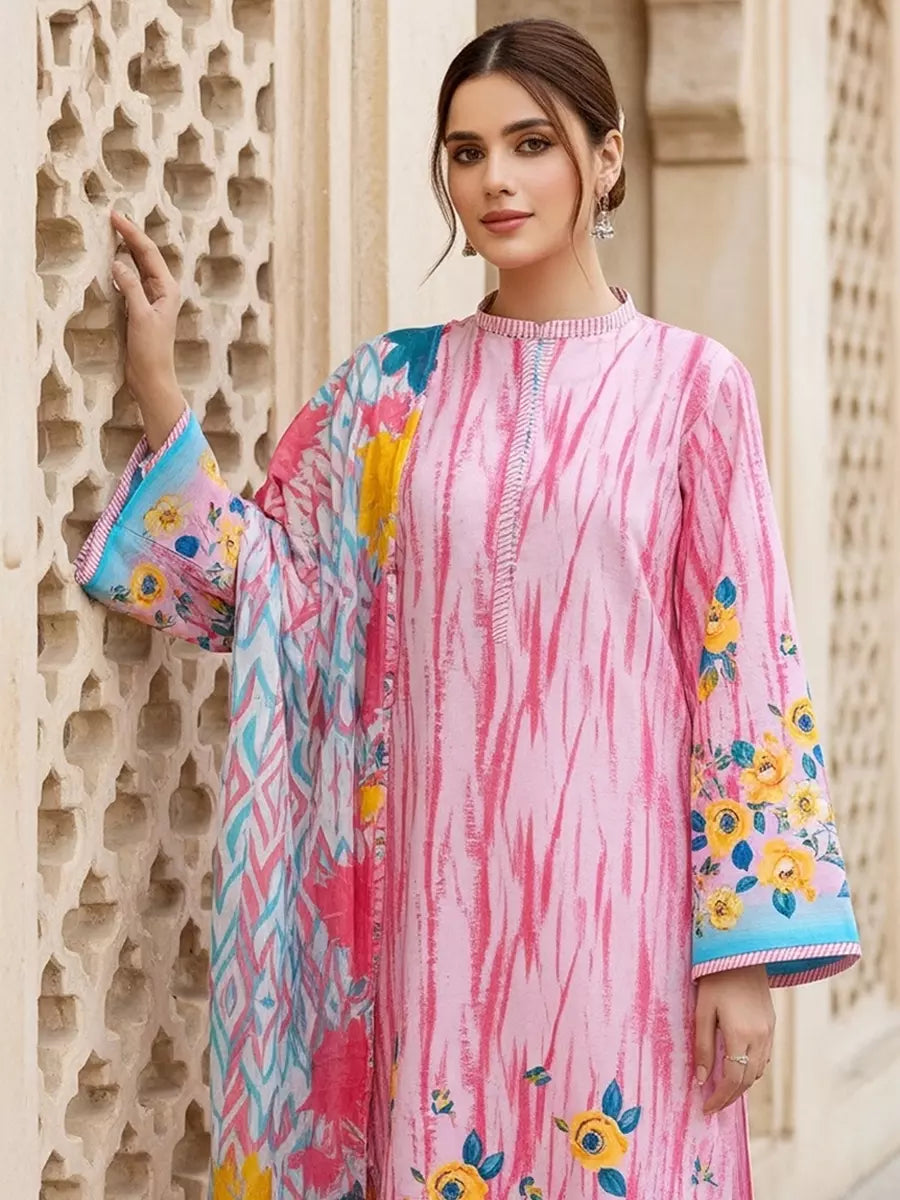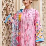 Style up your wardrobe with 3-Piece Unstitched Cambric Collection. Featuring a vibrant Cambric printed shirt, cambric dyed trouser, and a beautifully Lawn printed dupatta.
