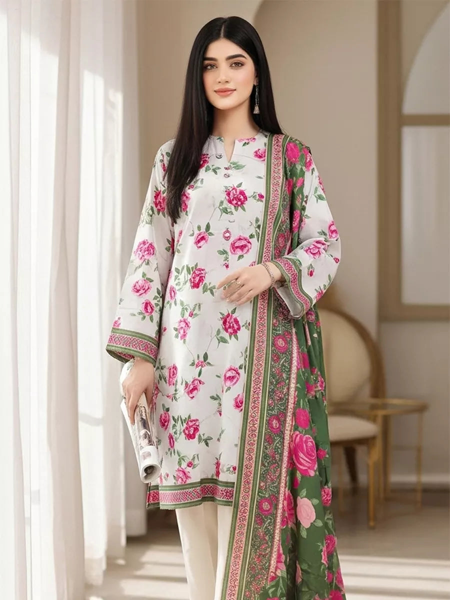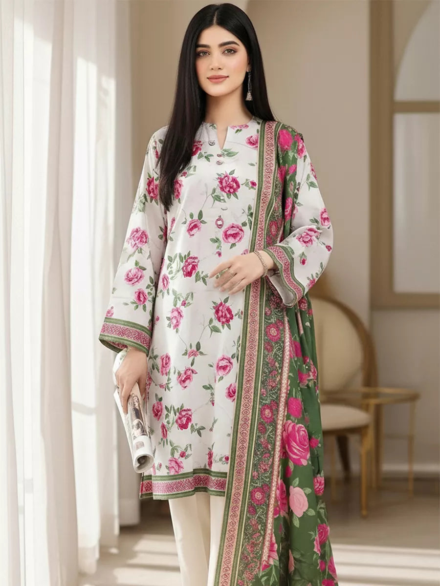 Elegant 3-piece khaddar suit featuring a beautifully printed khaddar shirt, printed khaddar dupatta, and a Plain khaddar trouser. Crafted from soft winter khaddar fabric, this outfit combines comfort with timeless floral charm, perfect for everyday elegance and seasonal style.