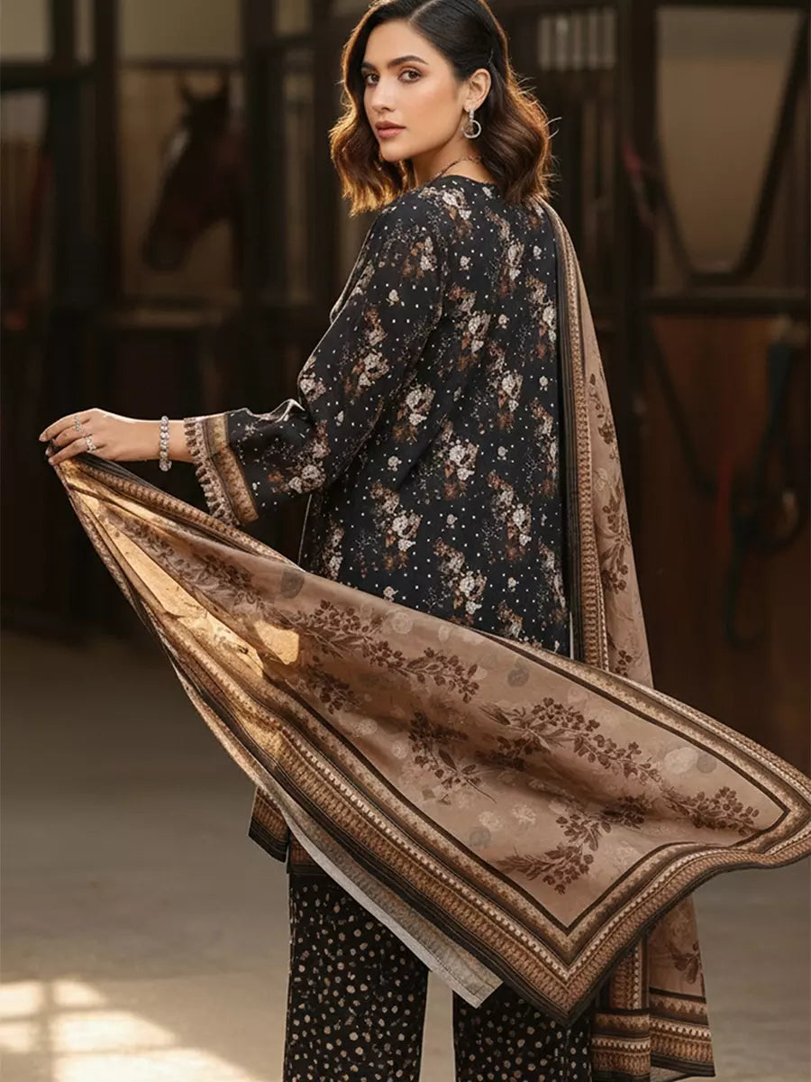Elegant 3-piece khaddar suit featuring a beautifully printed khaddar shirt, printed khaddar dupatta, and a coordinated printed trouser. Crafted from soft winter khaddar fabric, this outfit combines comfort with timeless floral charm, perfect for everyday elegance and seasonal style.